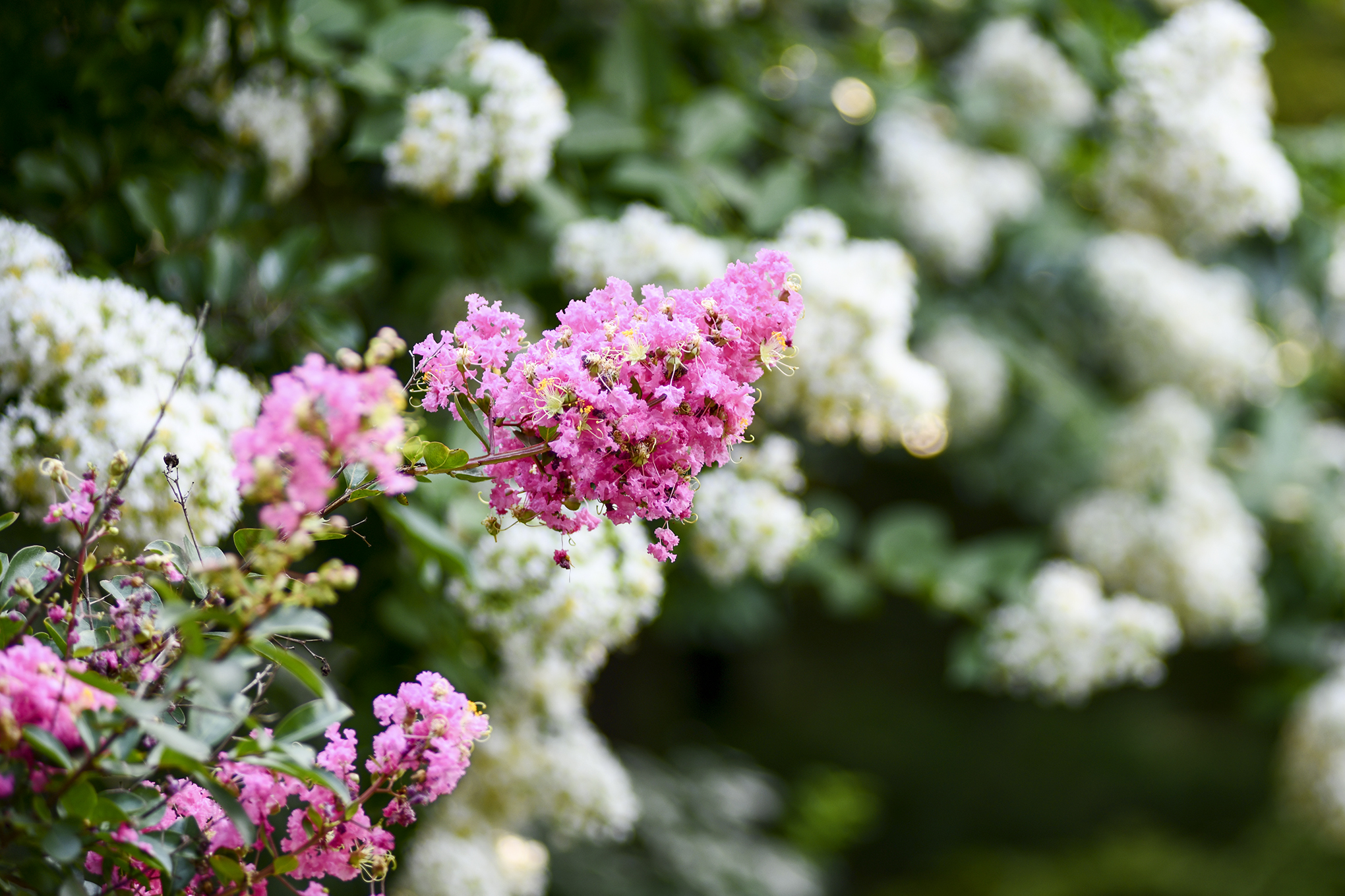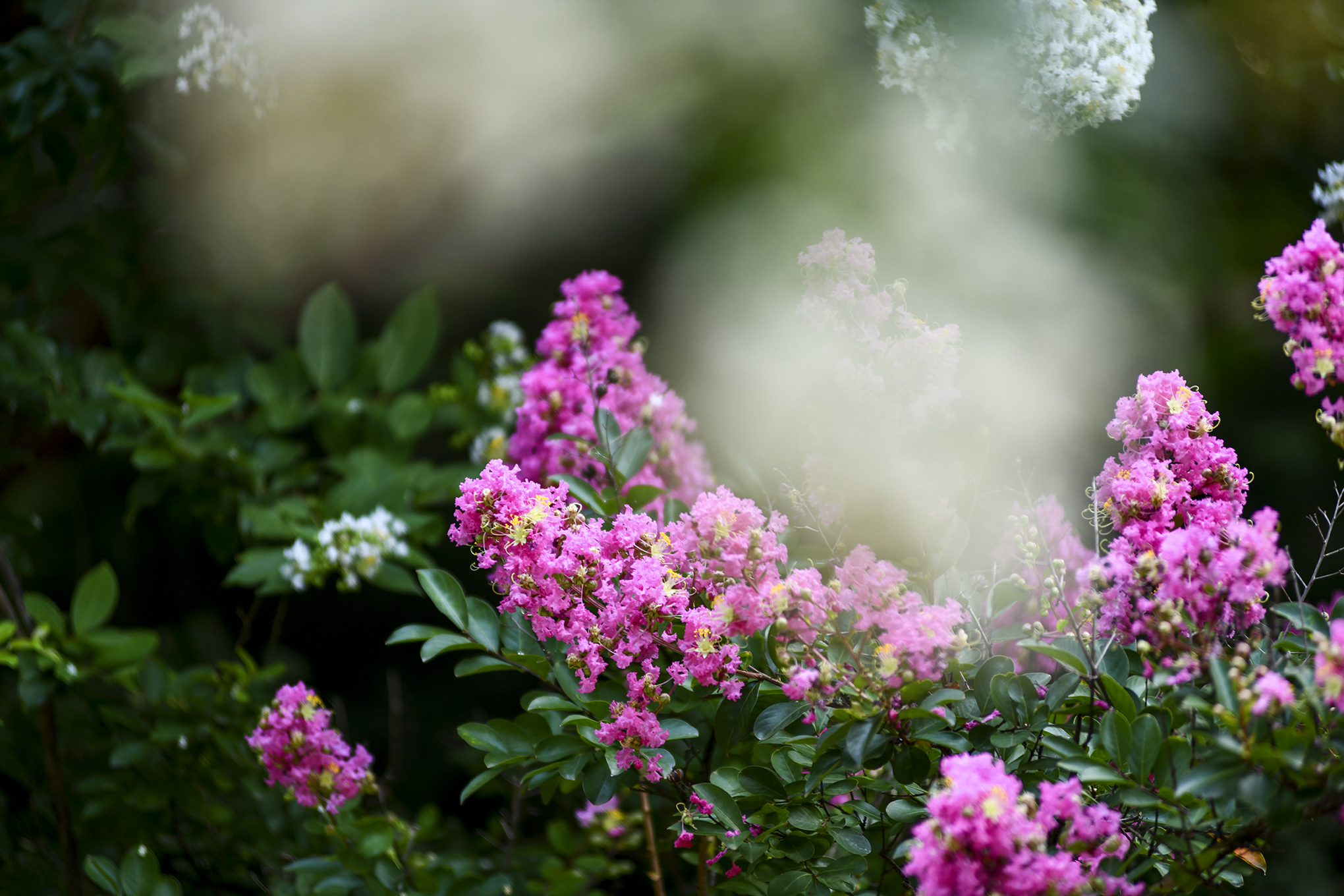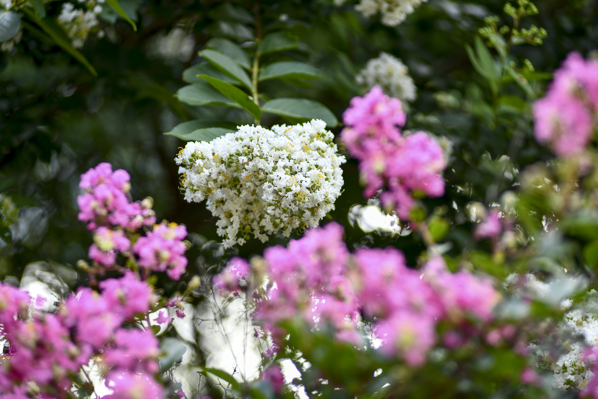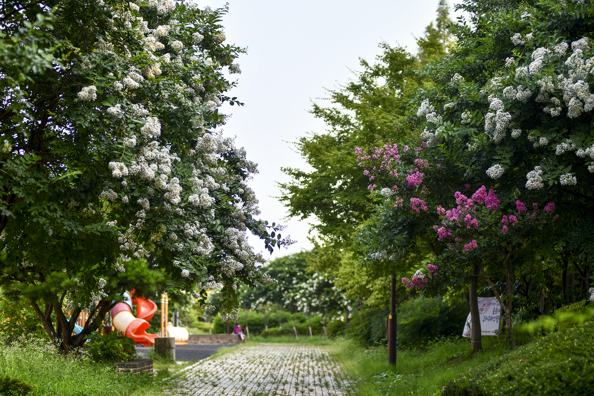 몇해 전부터 흰배롱나무 사이에 어린 배롱나무들을 심은듯, 흰꽃 사이에 피어 더 눈에 띈다.