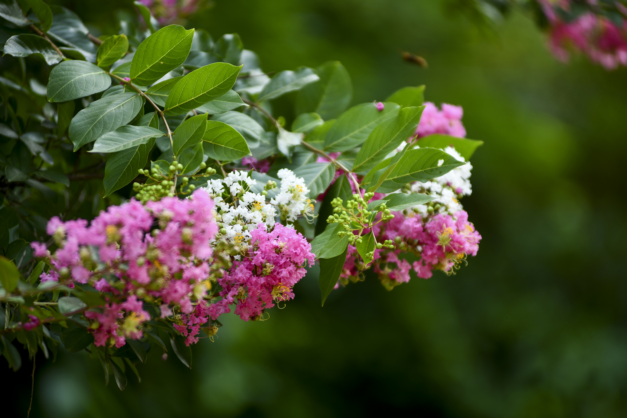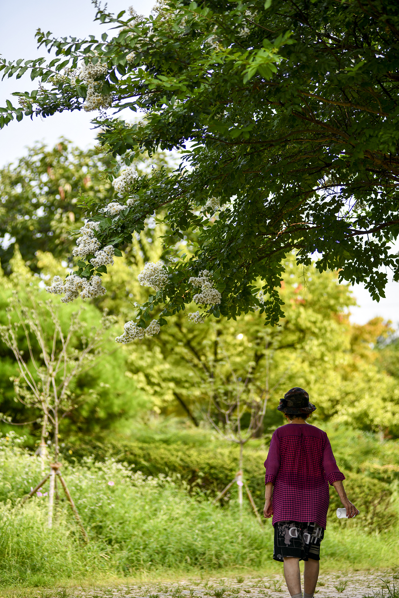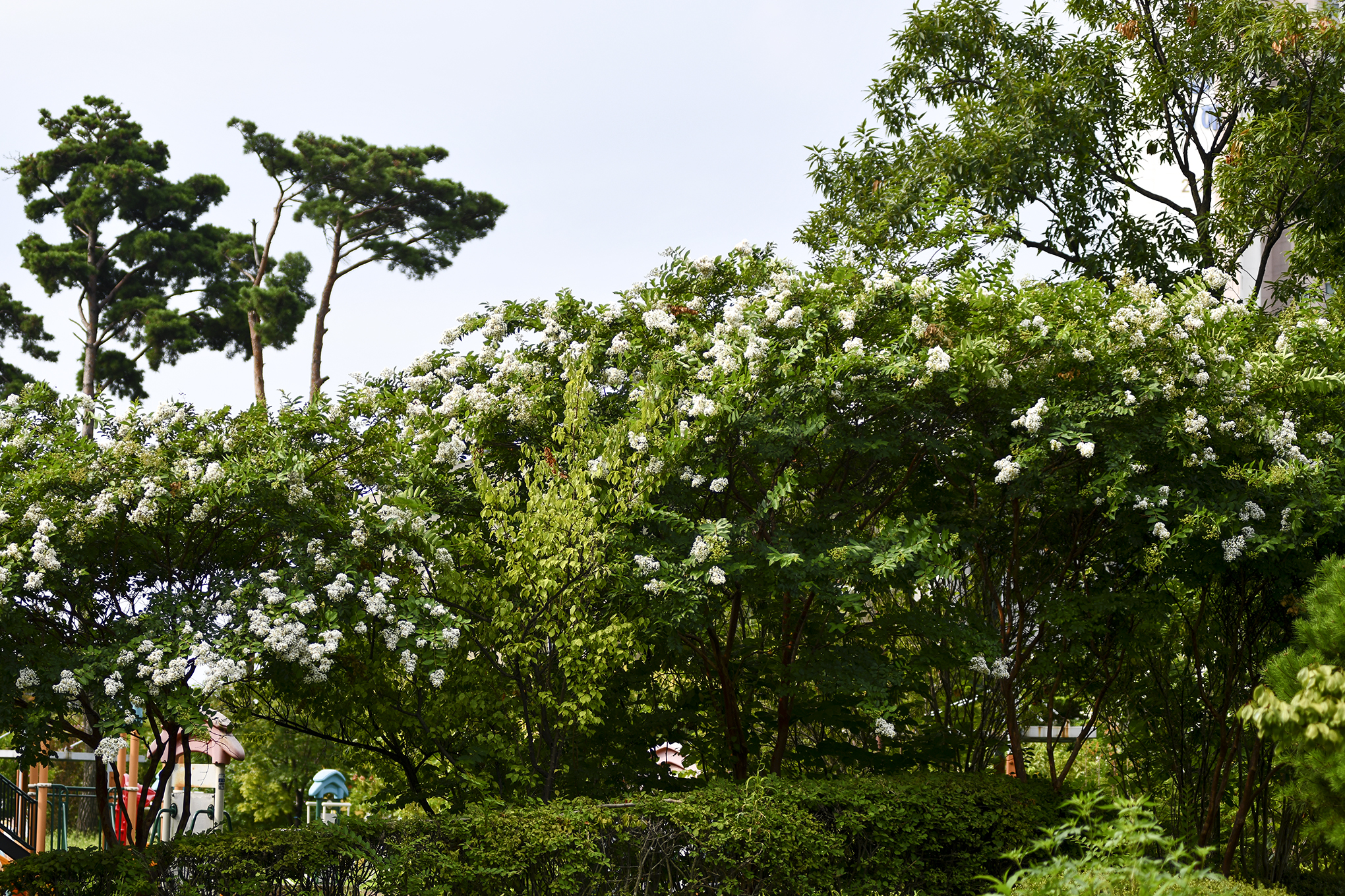 몇해 전부터 흰배롱나무 사이에 어린 배롱나무들을 심은듯, 흰꽃 사이에 피어 더 눈에 띈다.
