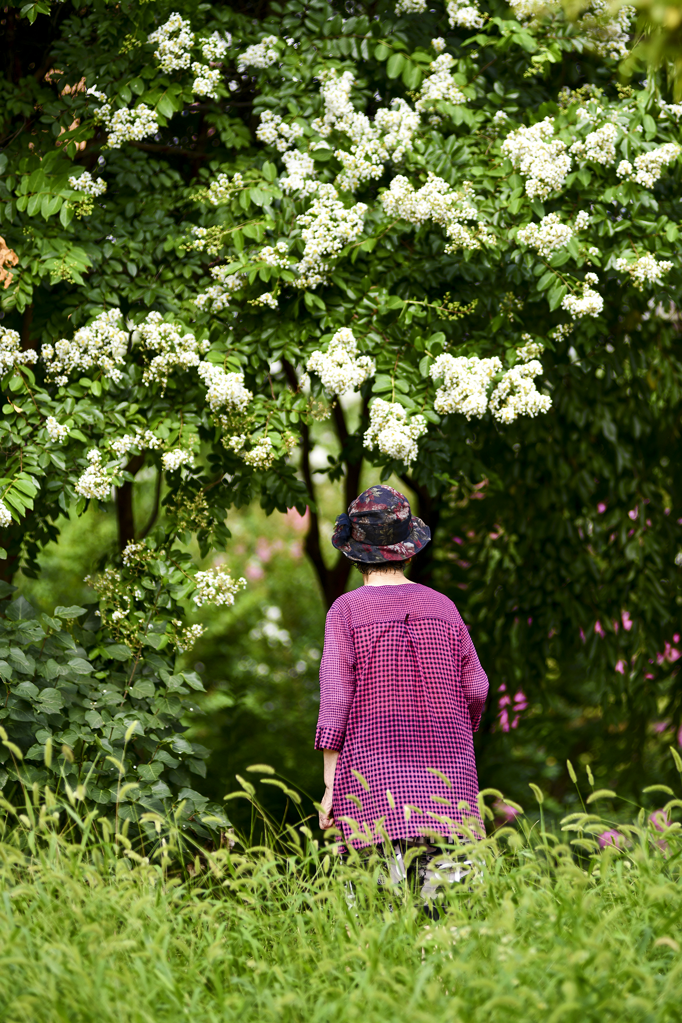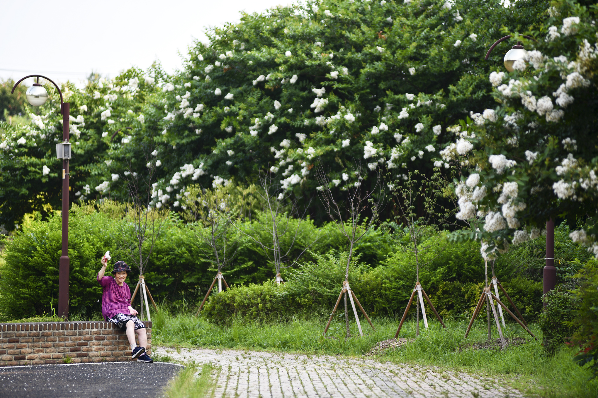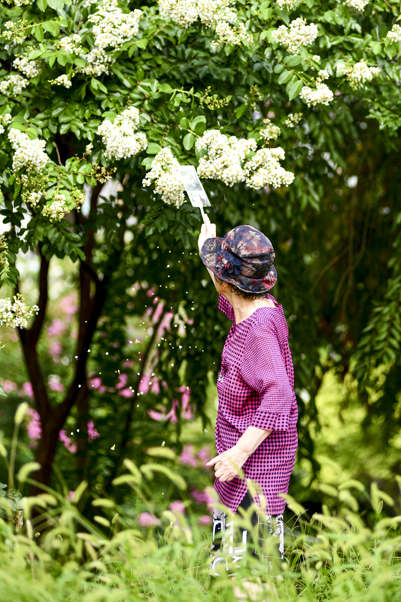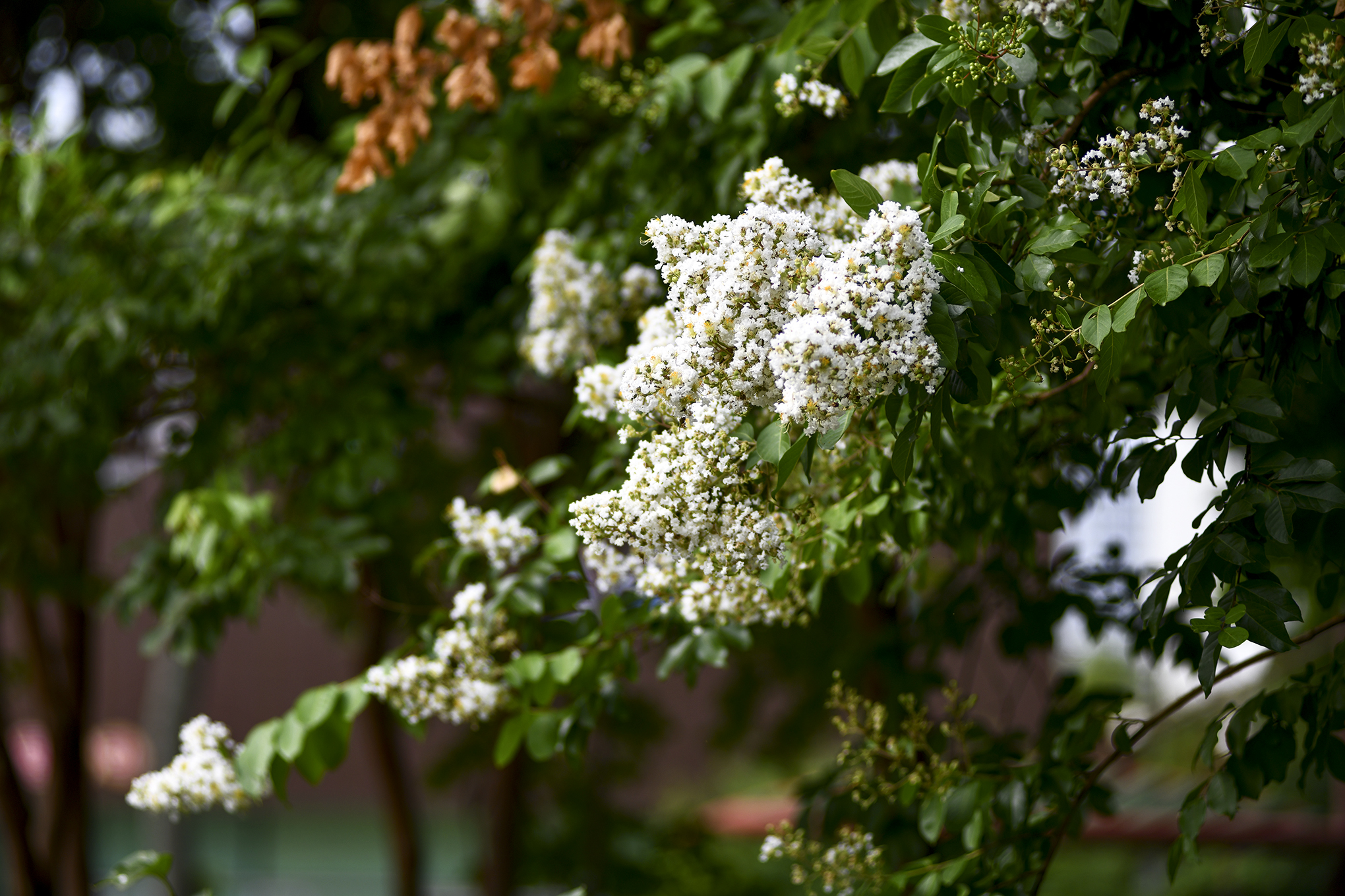 몇해 전부터 흰배롱나무 사이에 어린 배롱나무들을 심은듯, 흰꽃 사이에 피어 더 눈에 띈다.