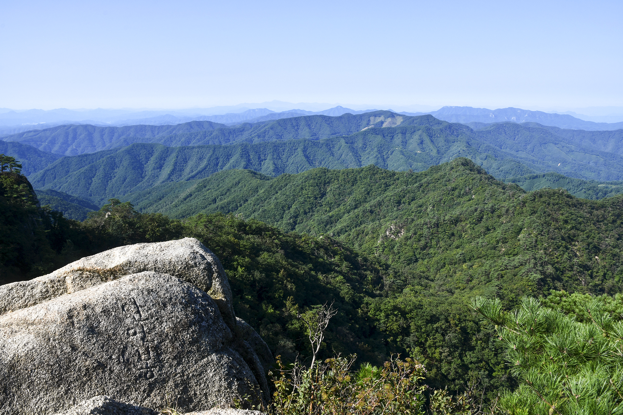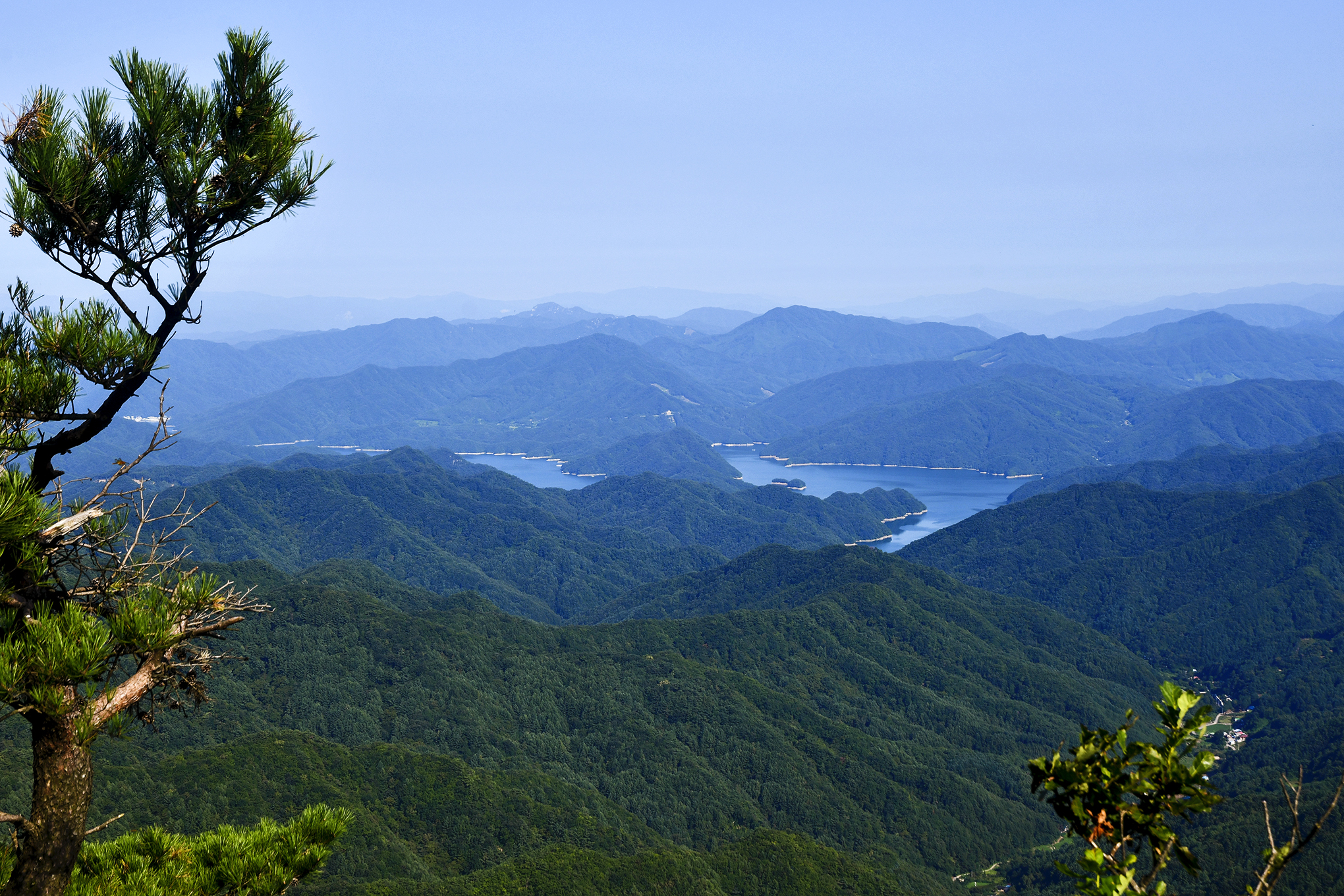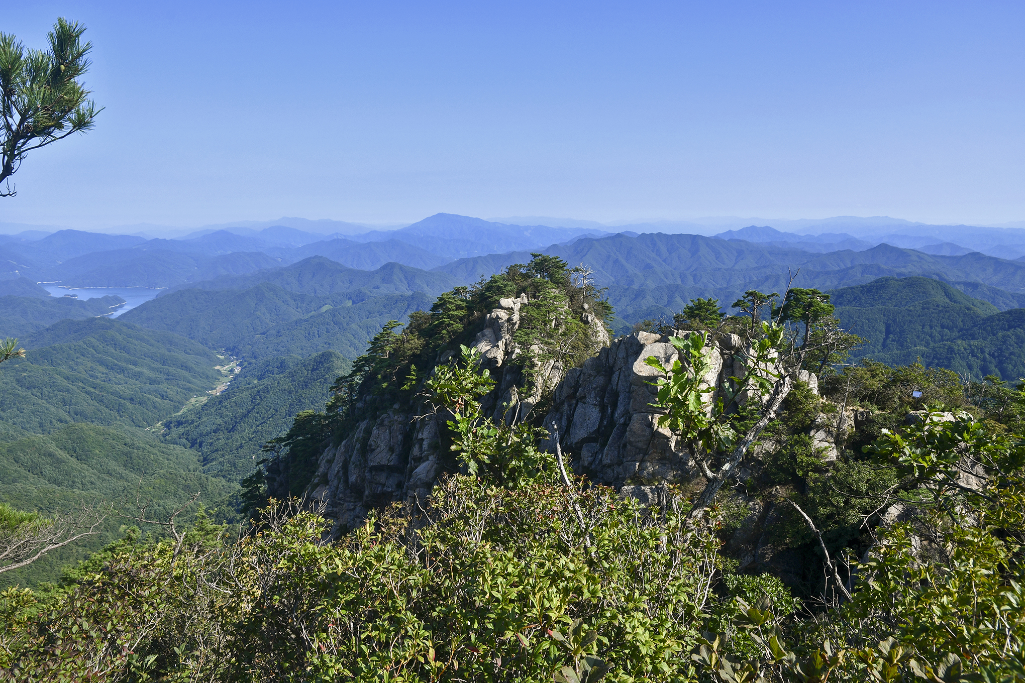 북쪽으로 향로봉에서 설악산을 거쳐 오대산으로 이어지는 백두대간의 고산준령이 한눈에 펼쳐진다.