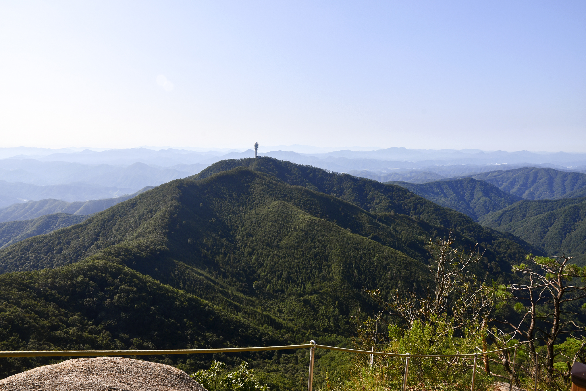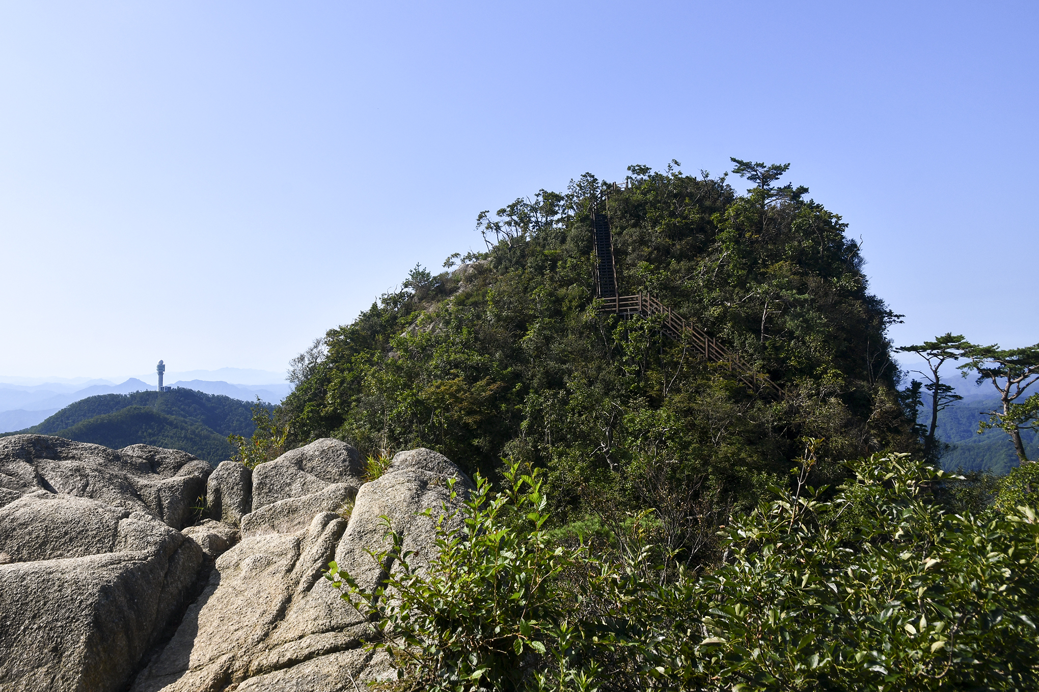 계단에서 조망되는 봉우리 꼭대기에 강우레이더 관측소의 레이더동이 보인다.