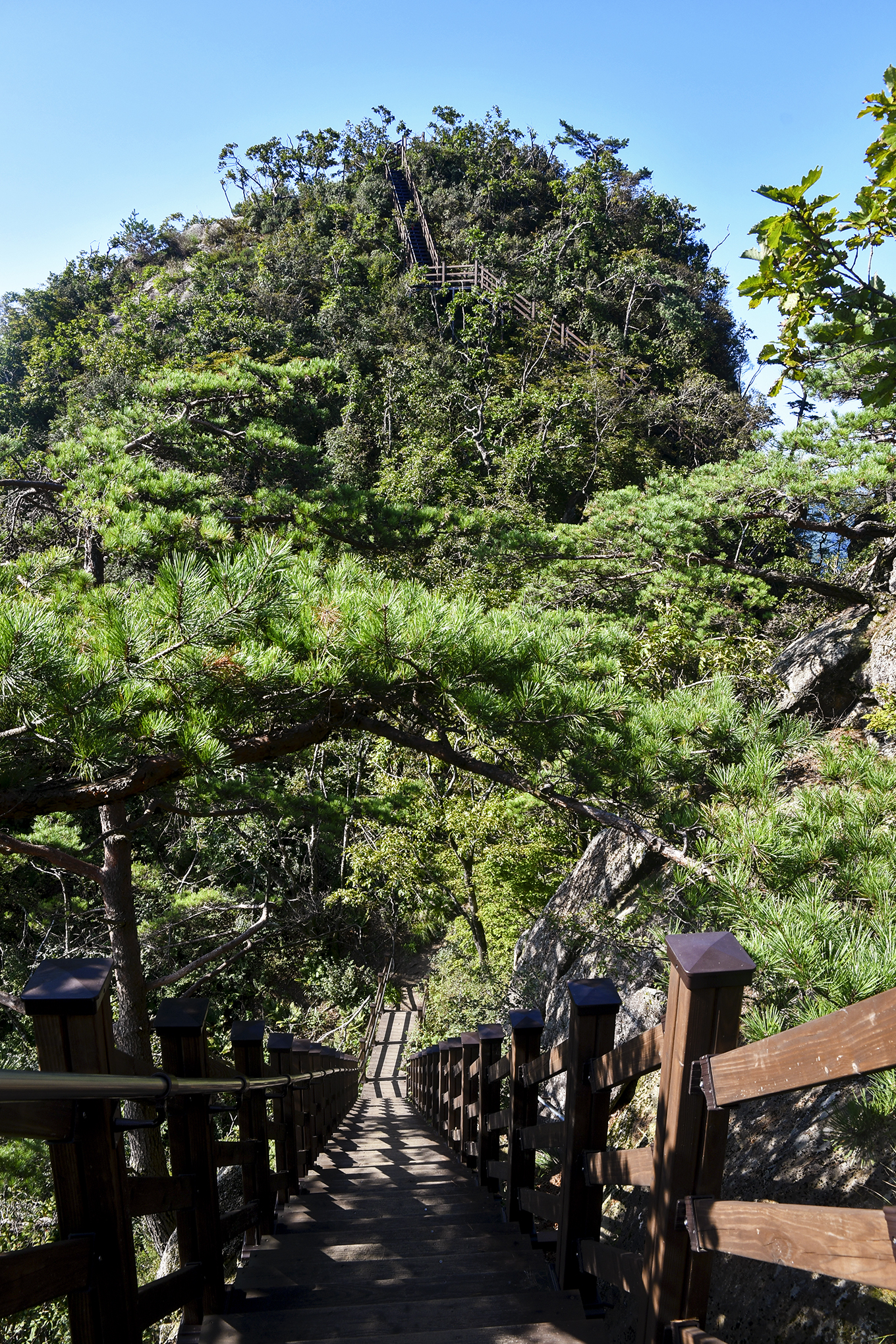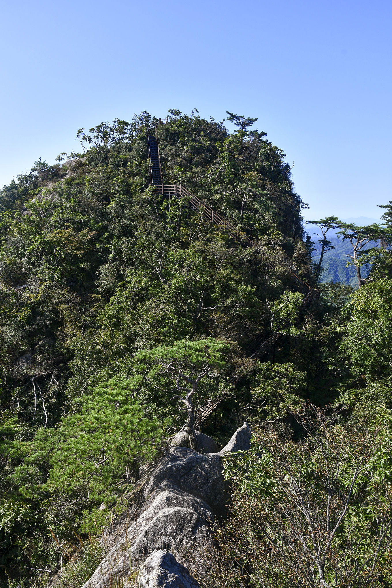2봉으로 올라가는 계단과 돌아본 1봉 정상의 모습.