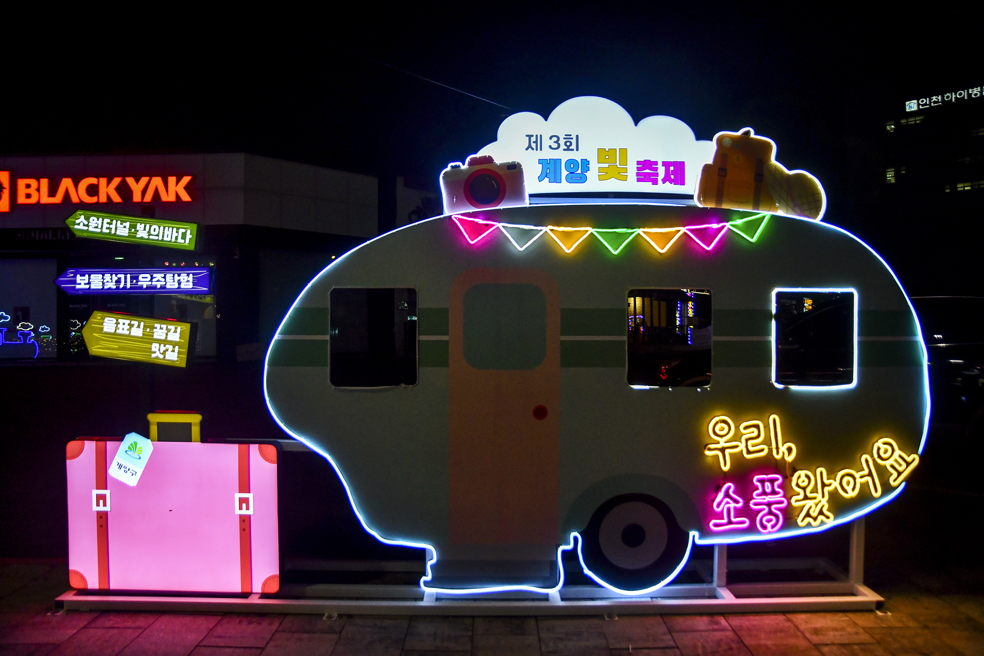 올해로 3회째를 맞이하는 계양 빛축제는 소풍을 주제로 음표길, 꿈길, 우주탐험, 소원터널, 빛의바다 등 다양한 테마로 열린다.