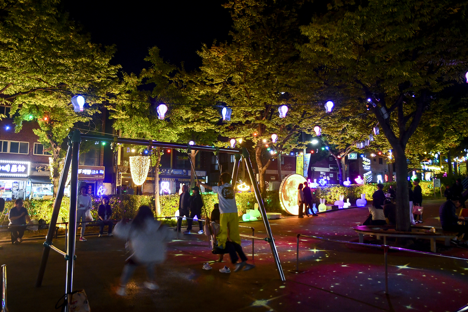 놀이터는 우주탐험을 주제로 불을 밝혀 아이들과 함께인 가족들의 쉼터가 되어준다.