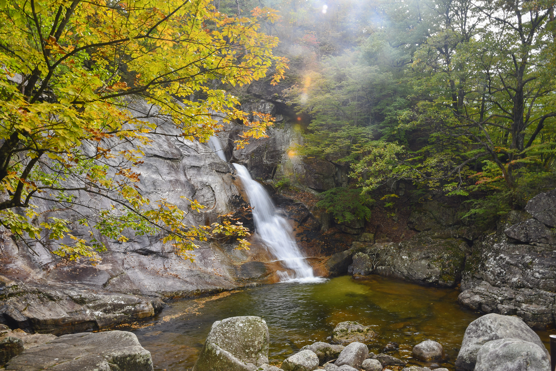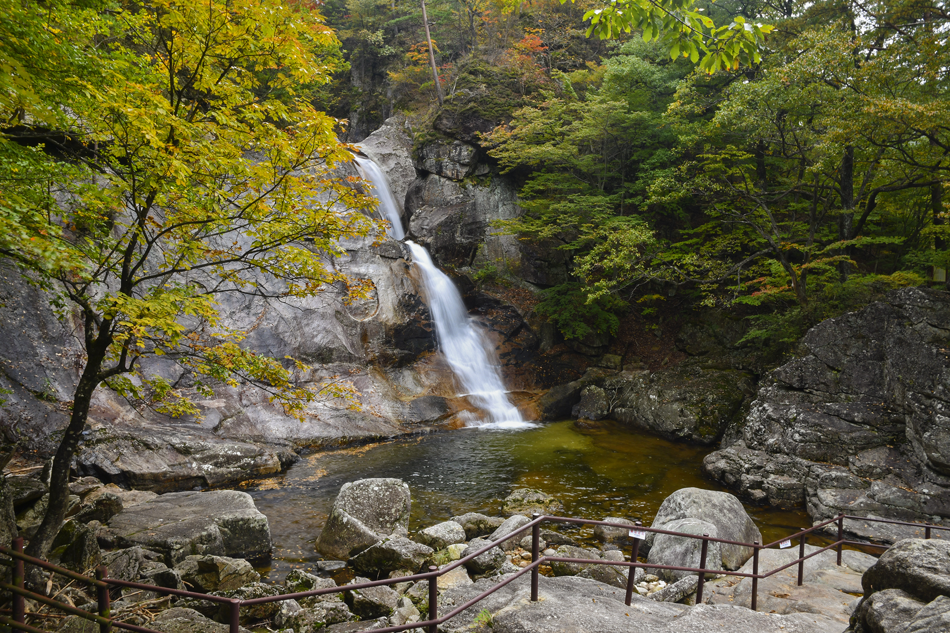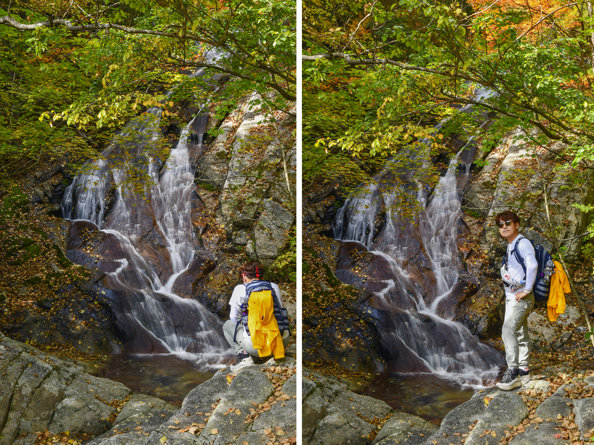 폭포가 일으키는 바람에 물보라의 차가움이 전해지고, 가을 단풍 아래 눈이 즐거워진다.