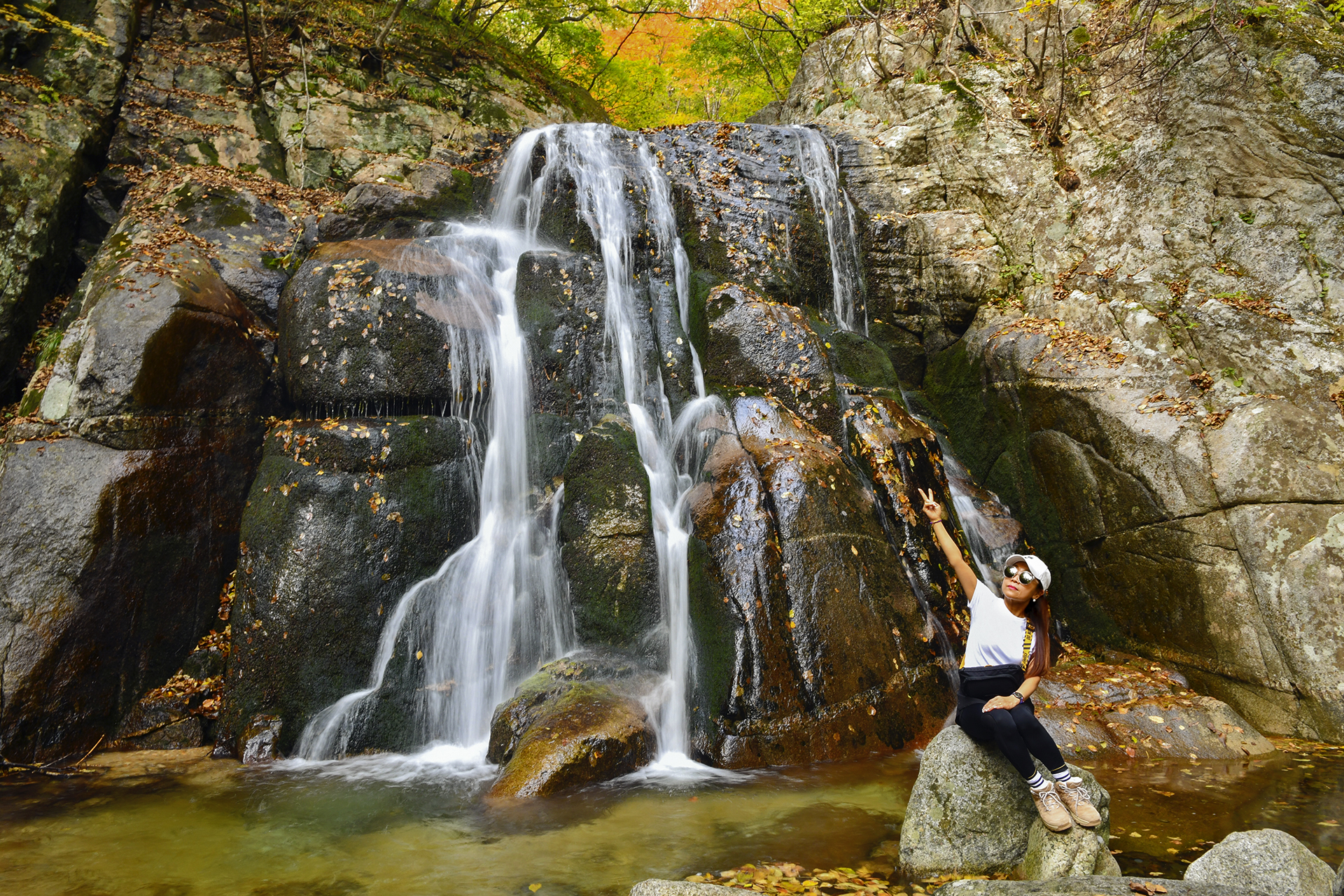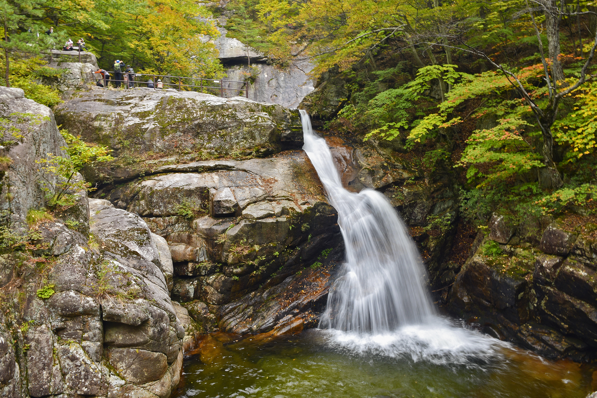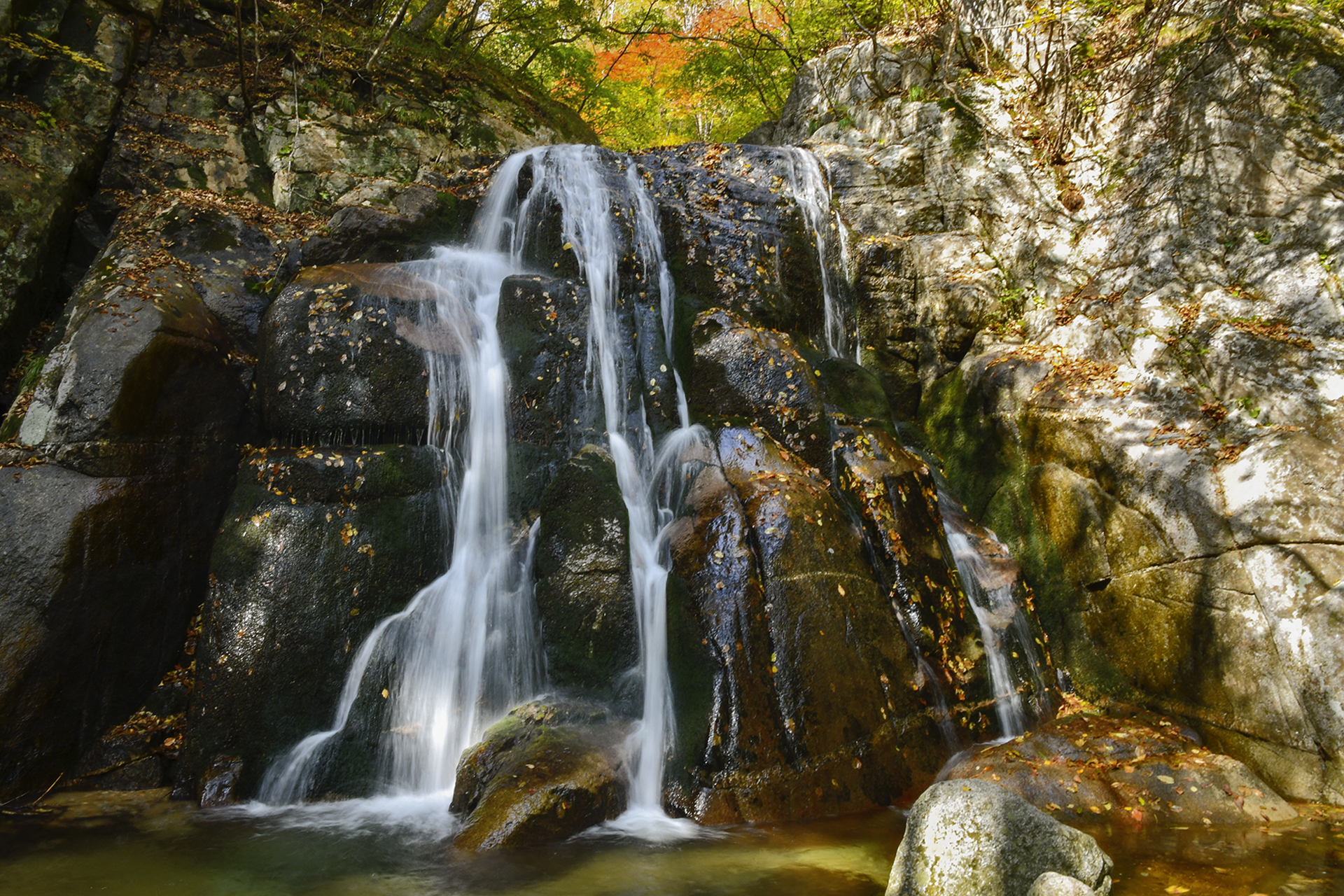폭포가 일으키는 바람에 물보라의 차가움이 전해지고, 가을 단풍 아래 눈이 즐거워진다.