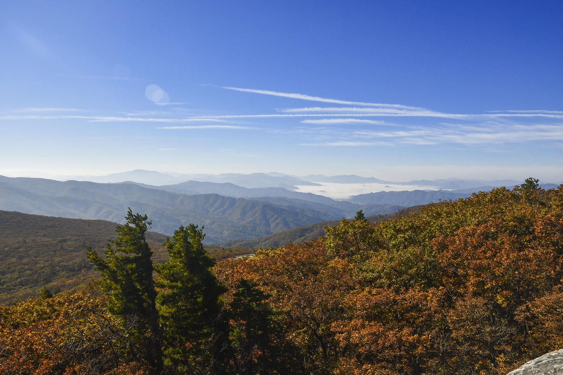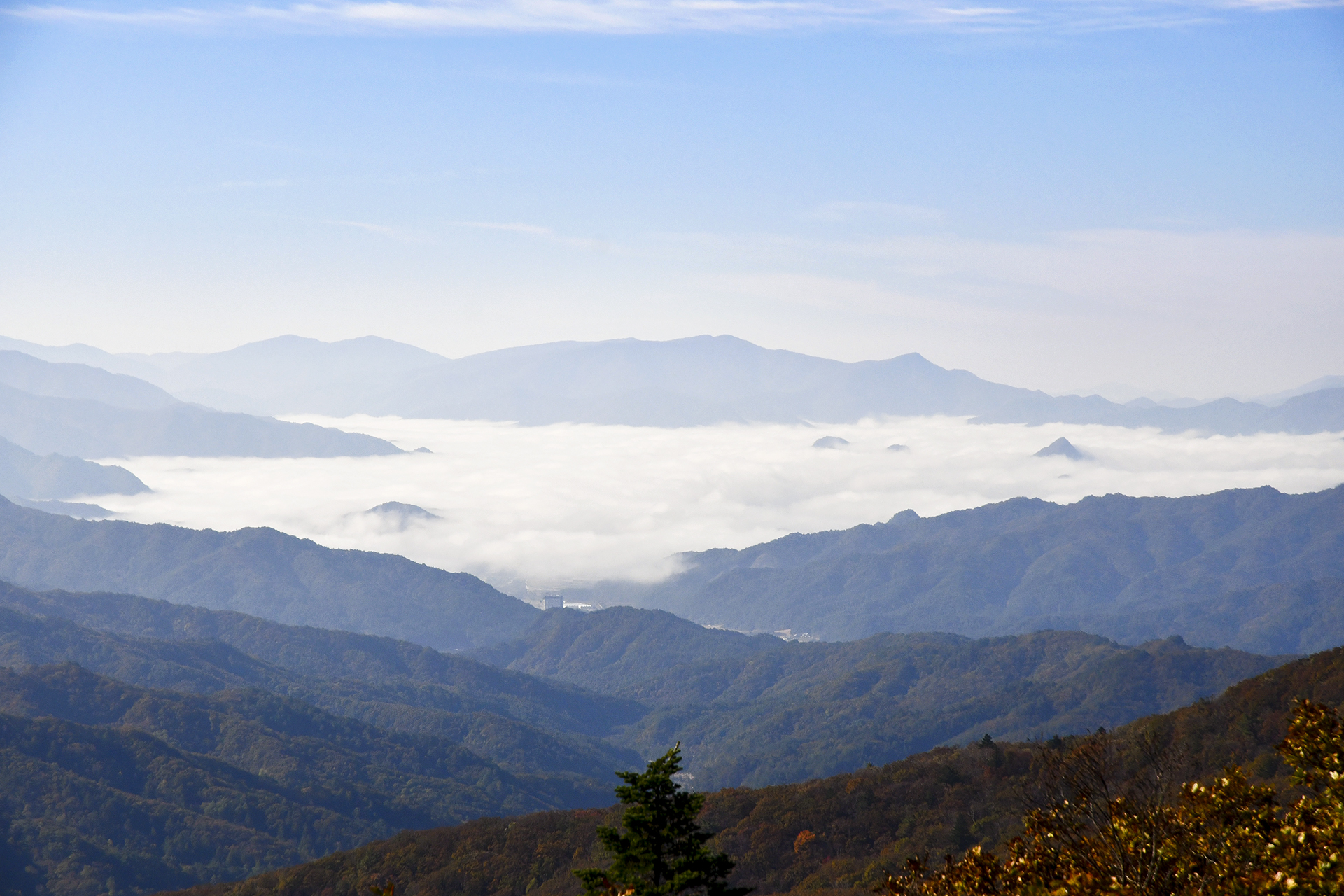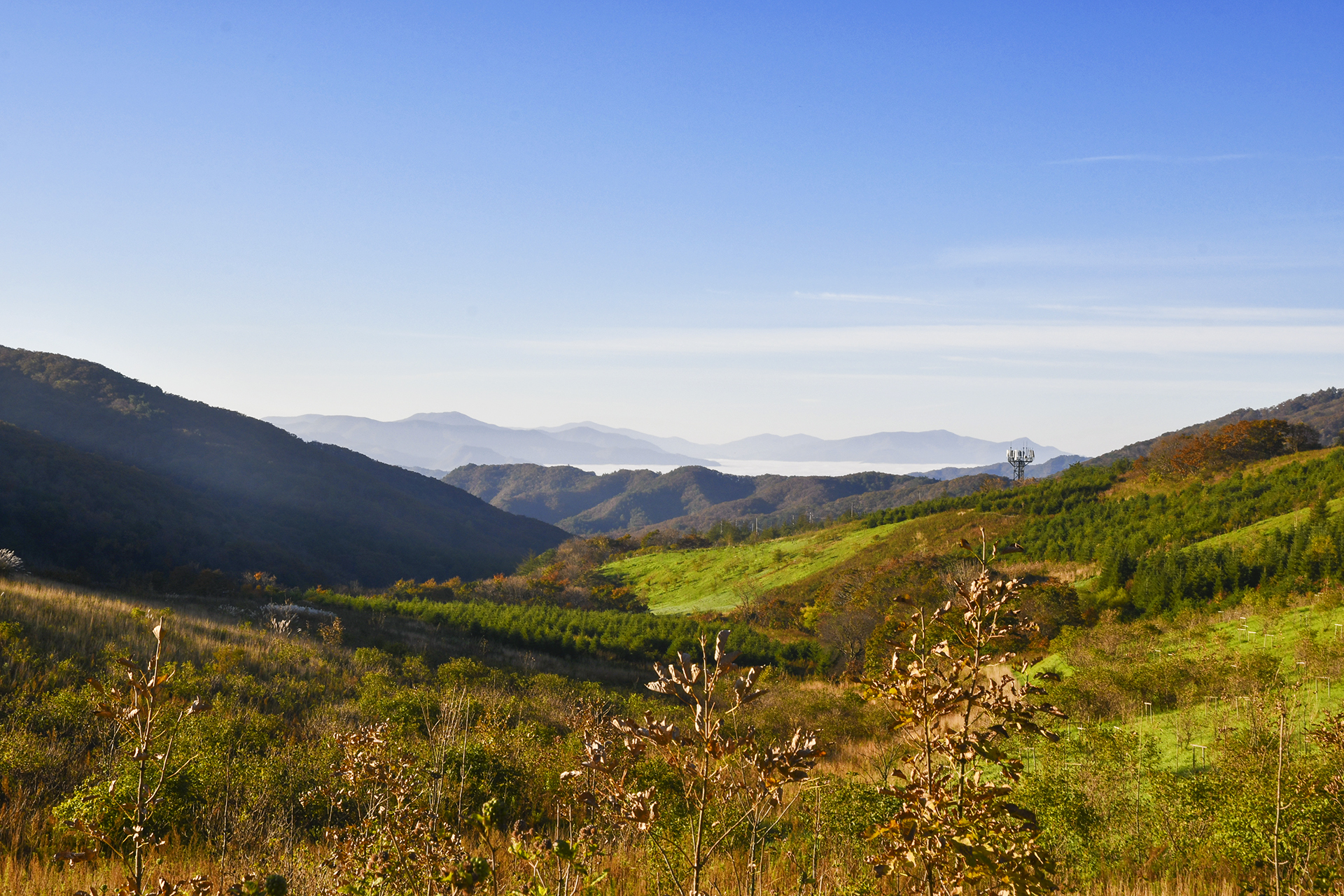 오른쪽 평창 방면은 완만한 경사를 이루며 시야가 활짝 트였다. 저 너머에는 운해가 가득하고,