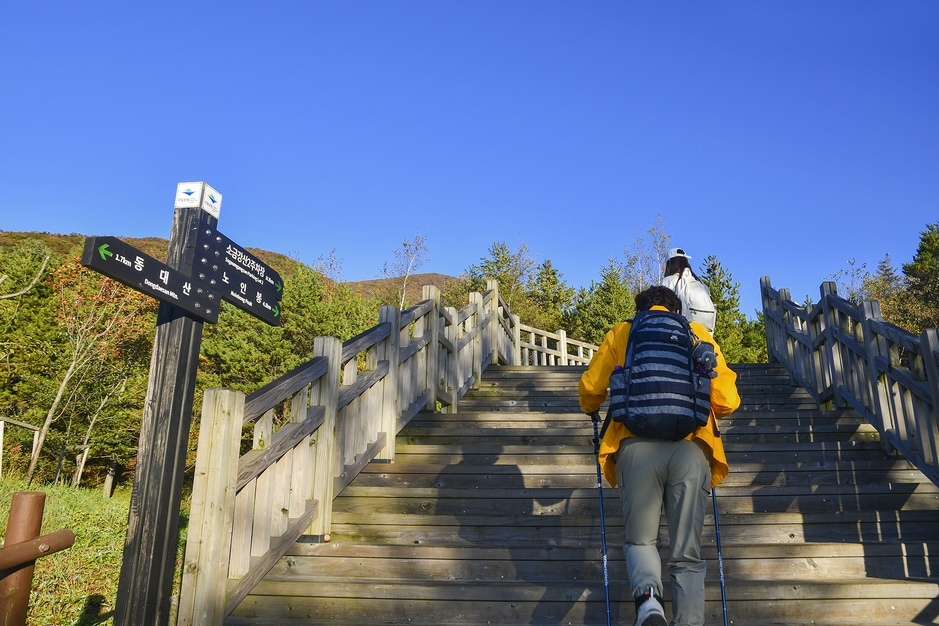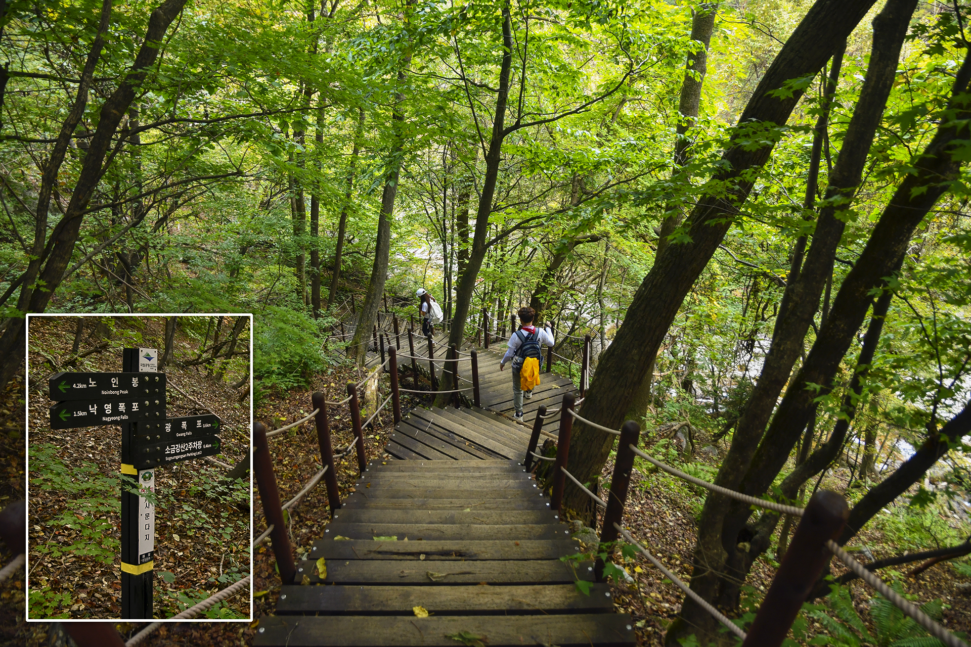 노인봉에서 2.5km 거리에 있는 낙영폭포까지 이제부터 계단길과 가파른 숲길을 내려가야 한다.