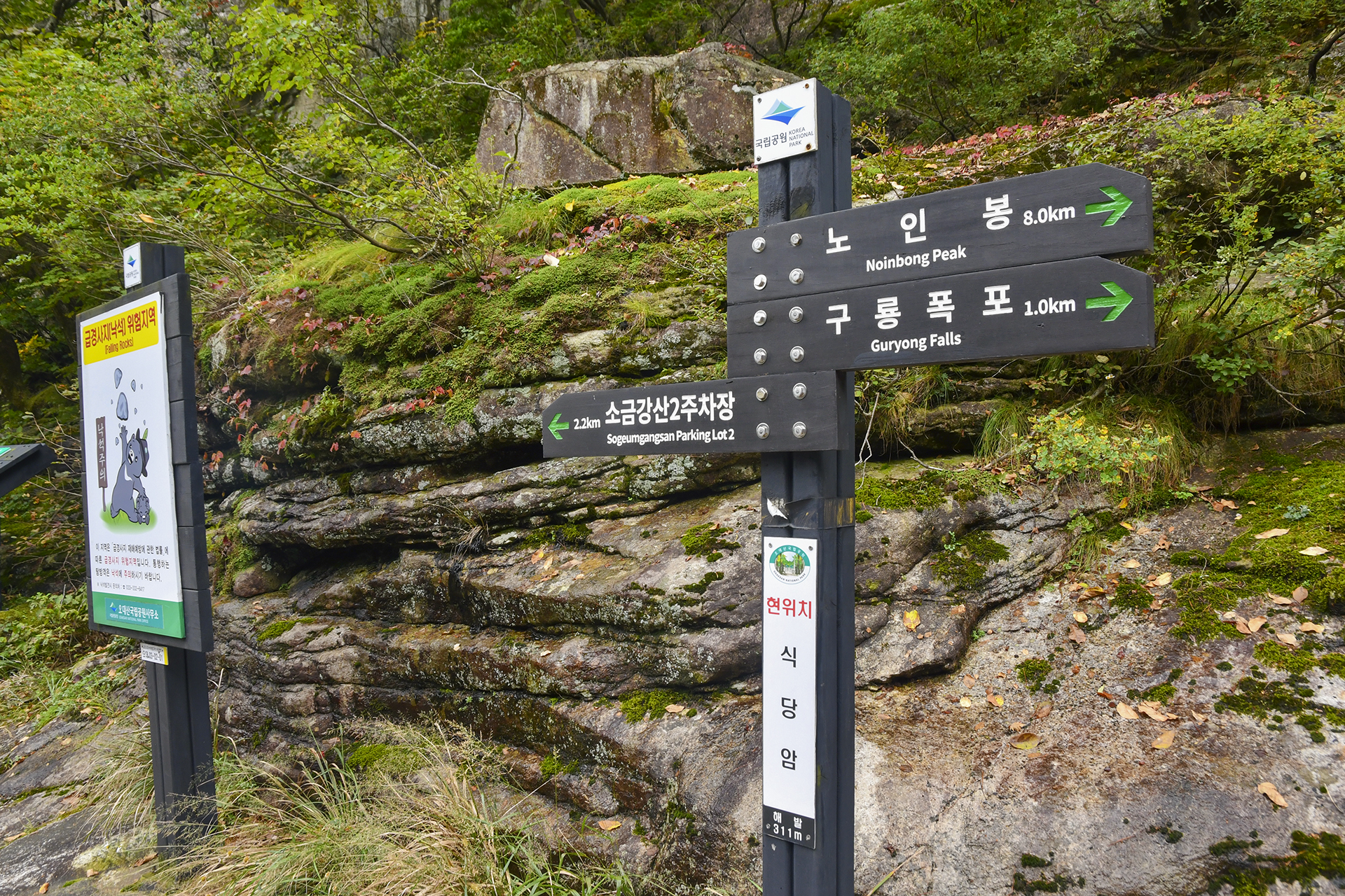 낙영폭포가 0.3km 남았다는 반가운 이정표, 가파른 길은 거의 다 내려온 셈이다.