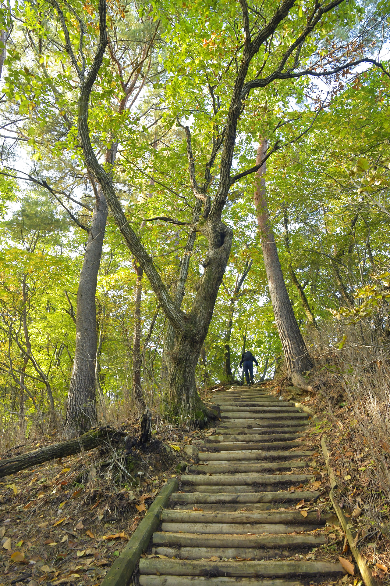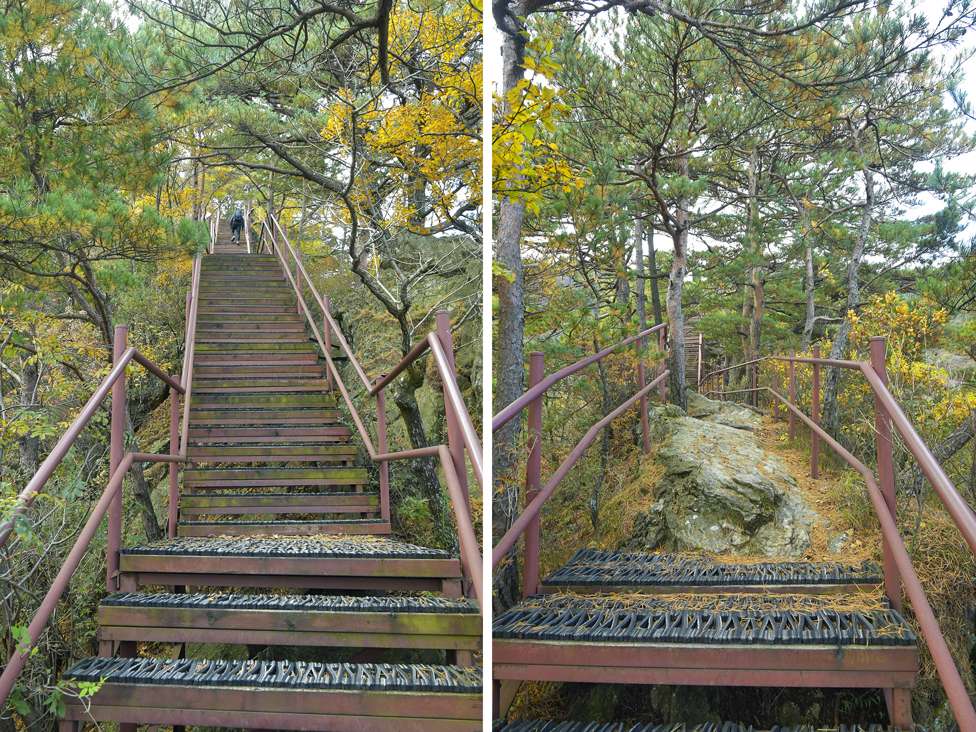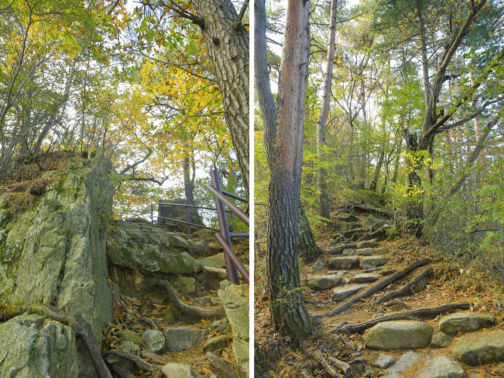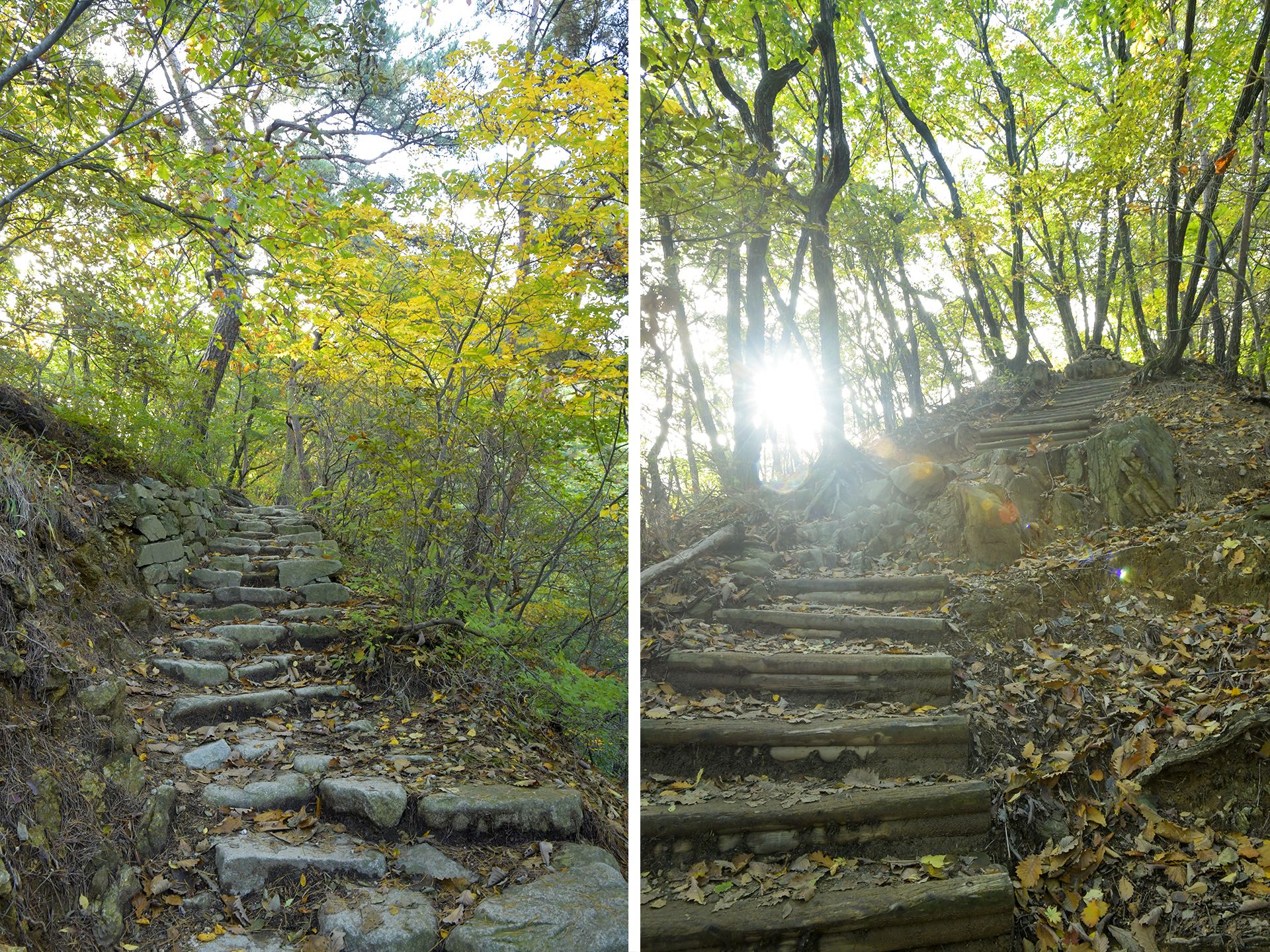 데크계단과 돌계단이 번갈아 가며 고도를 순식간에 올려주는 길,