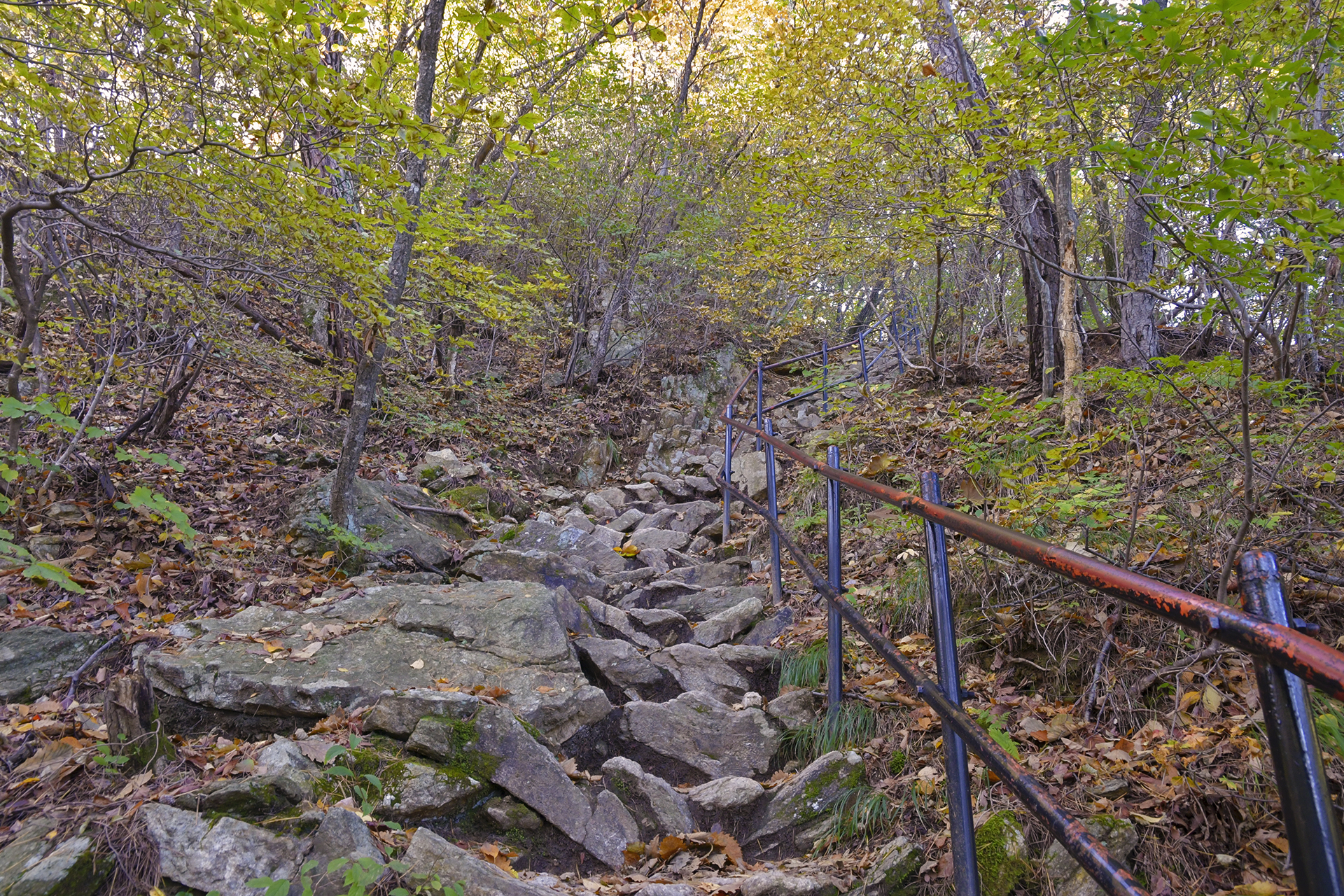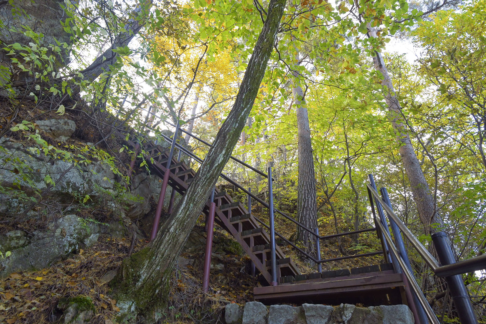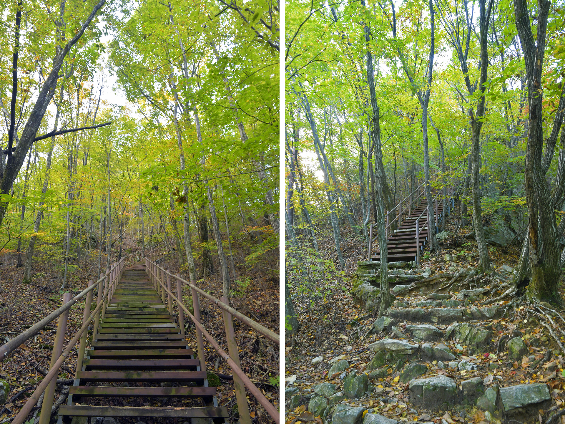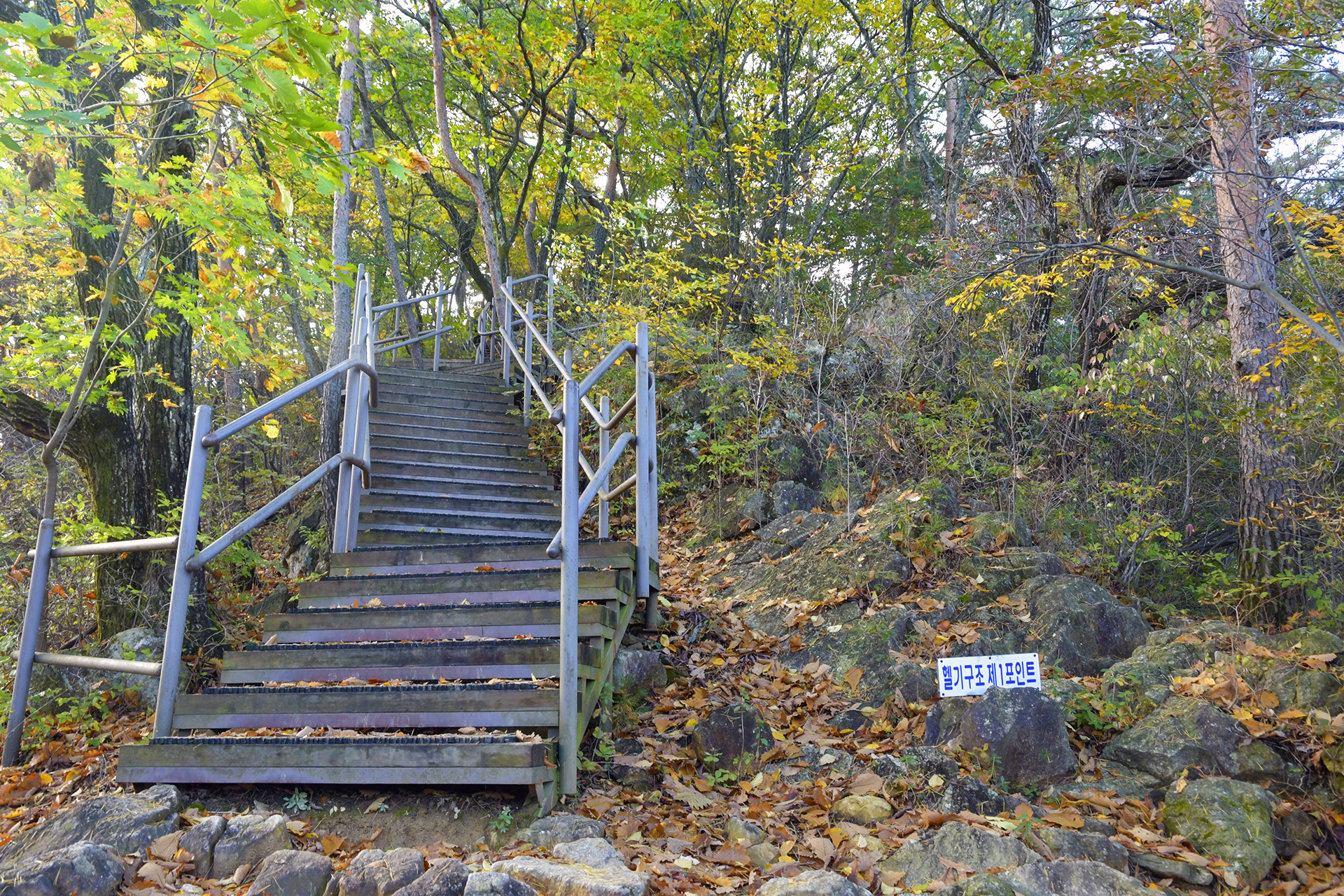 데크계단과 돌계단이 번갈아 가며 고도를 순식간에 올려주는 길,