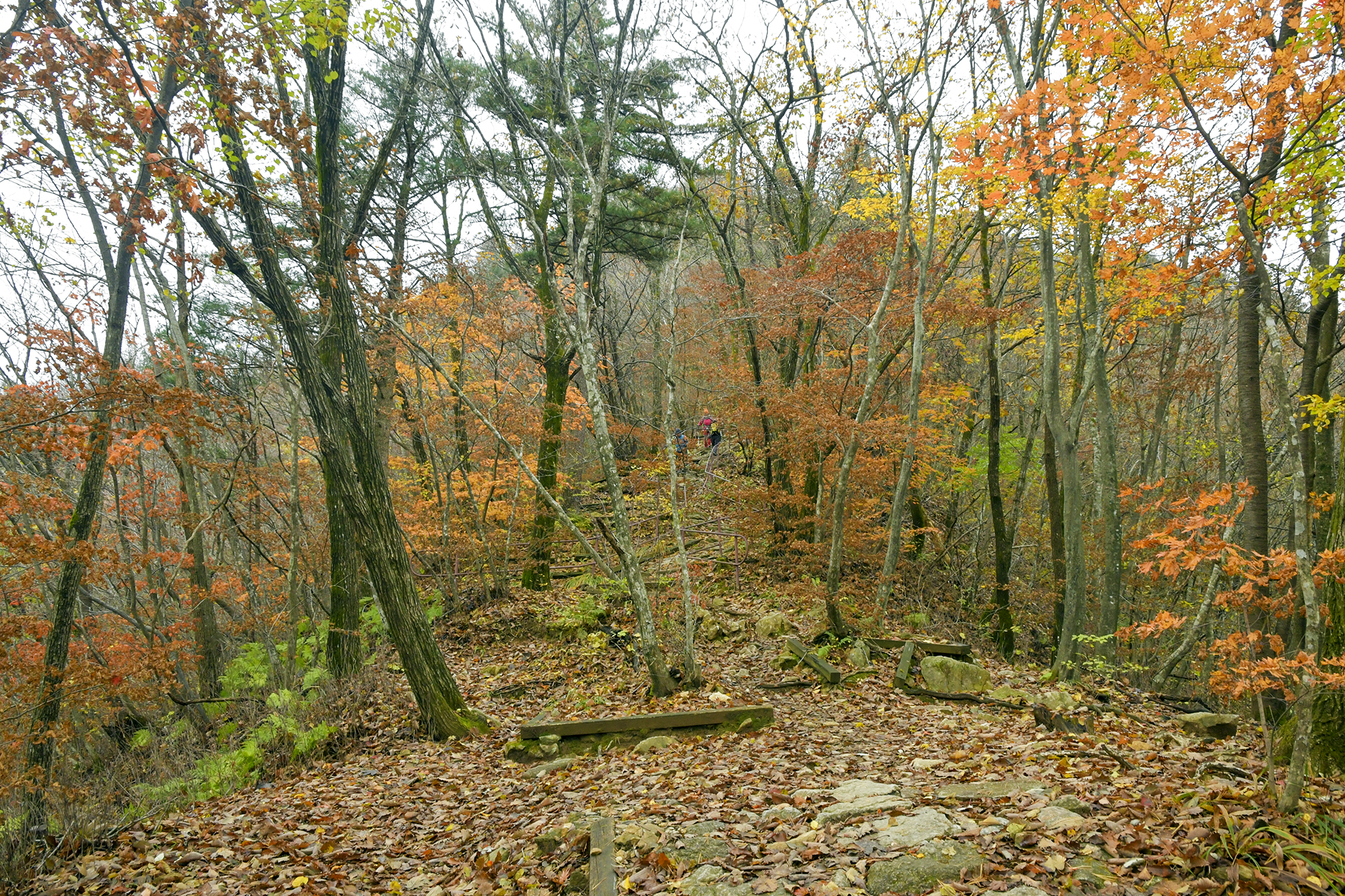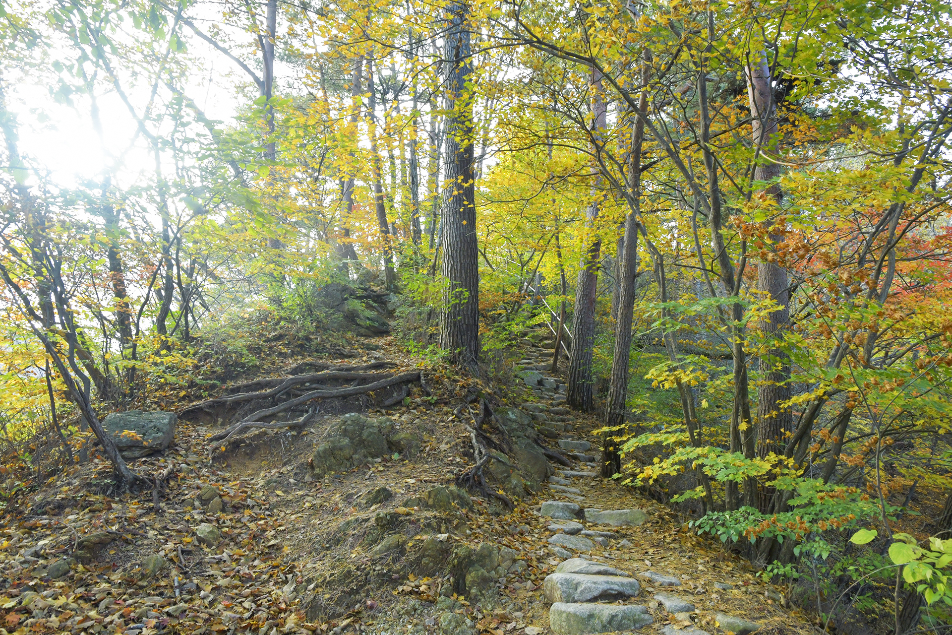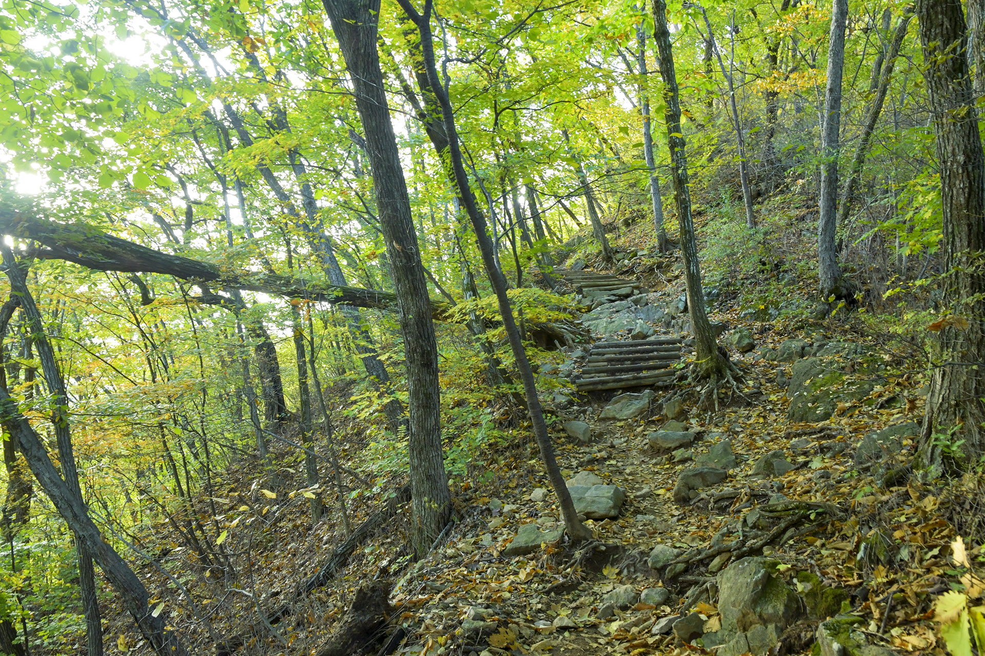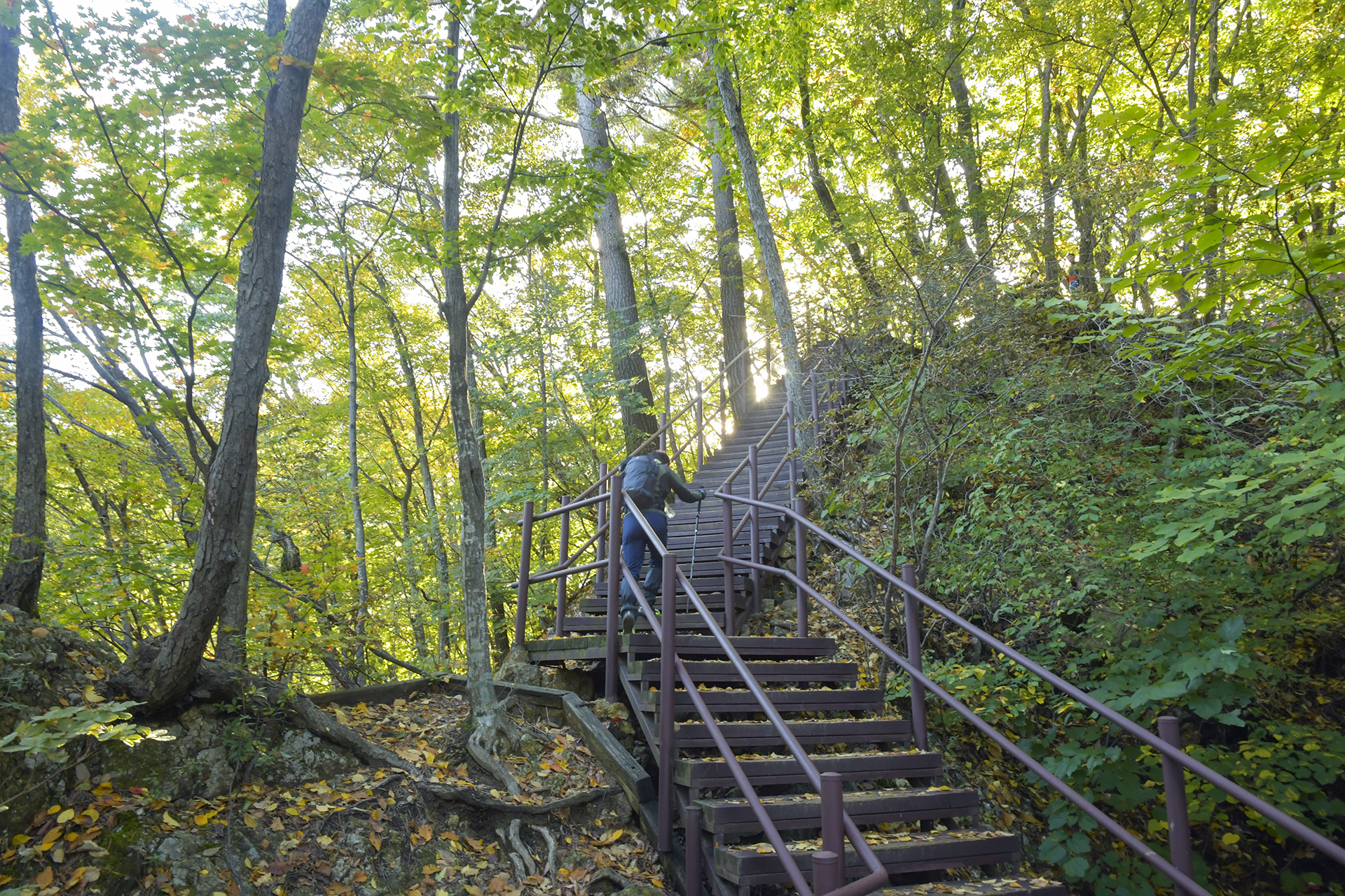 데크계단과 돌계단이 번갈아 가며 고도를 순식간에 올려주는 길,