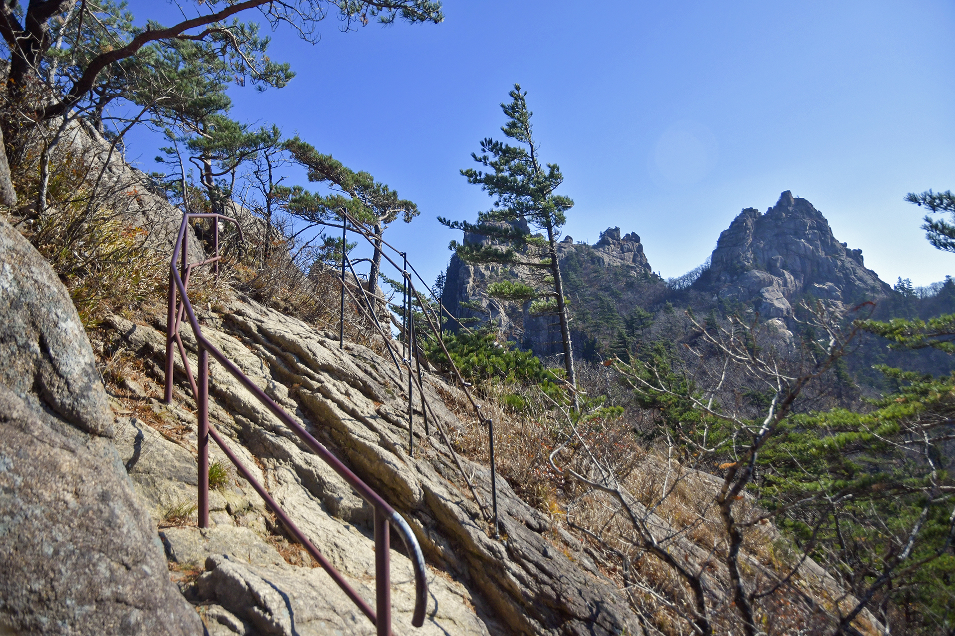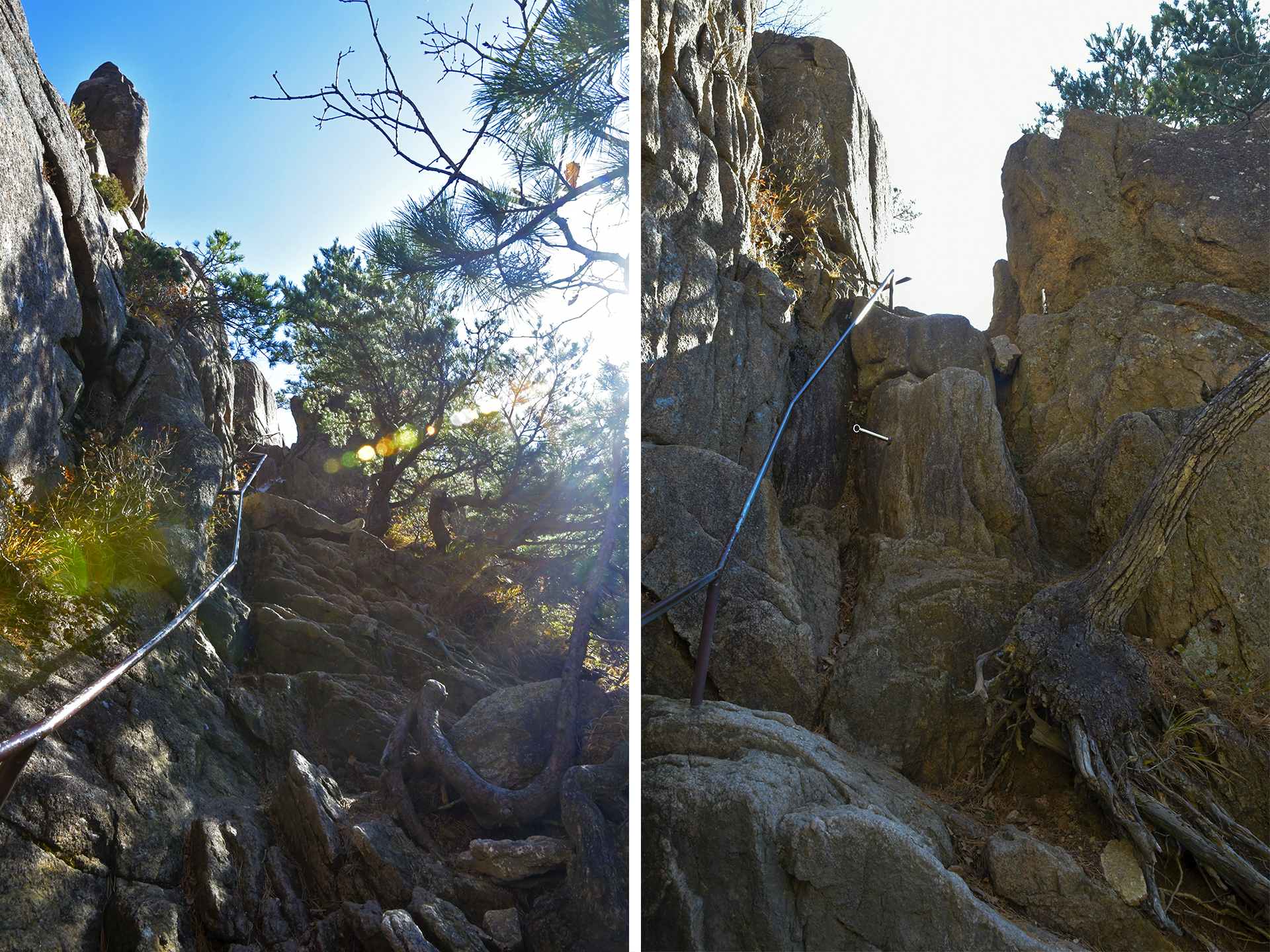 바위 틈새로 봉이 연결되어 있으니 조심스럽게 내려가보자. 이런 구간에서는 스틱이 필요치않다. 오히려 짐만 될뿐이다.
