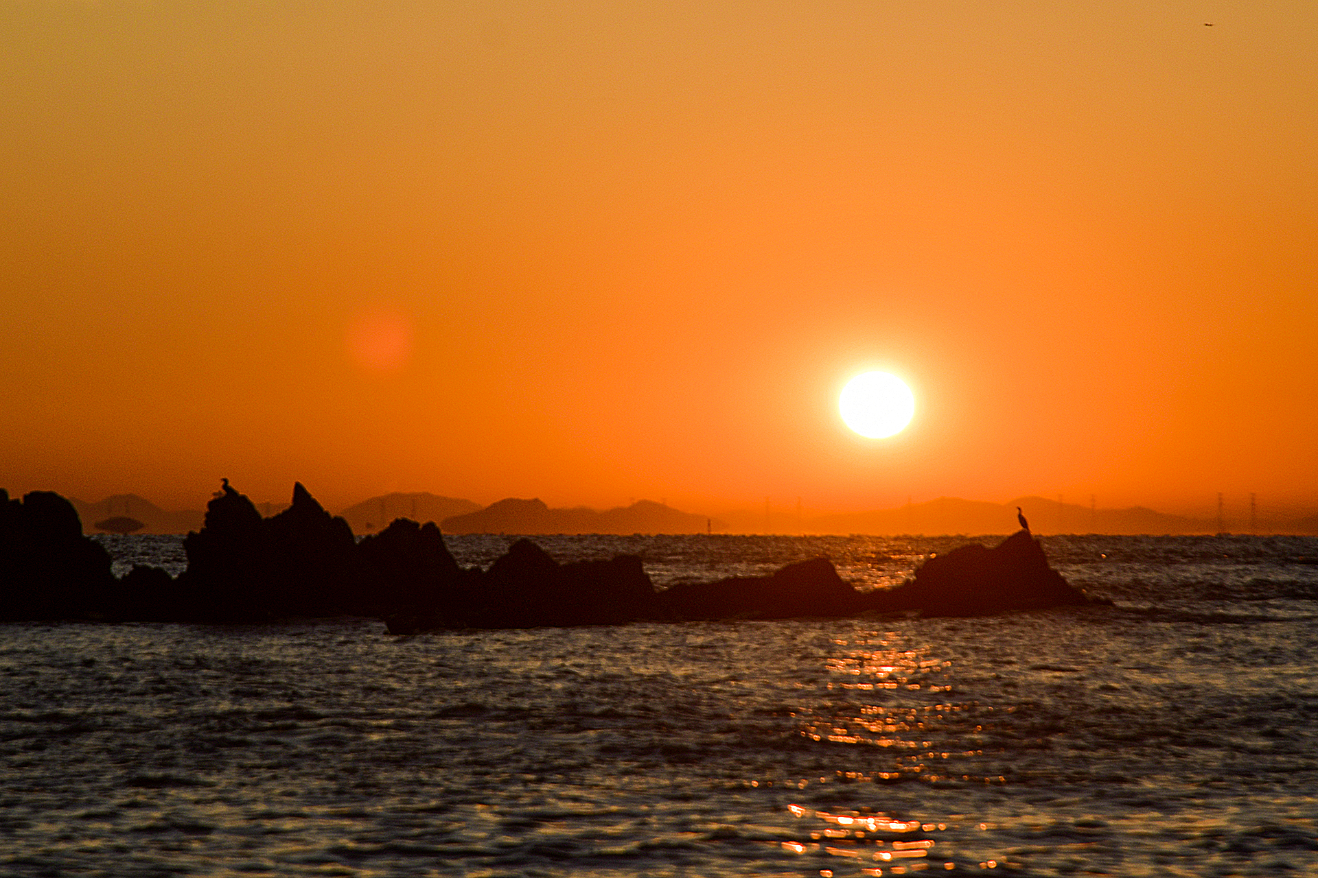 바위섬에 가마우지가 실루엣으로 보인다.