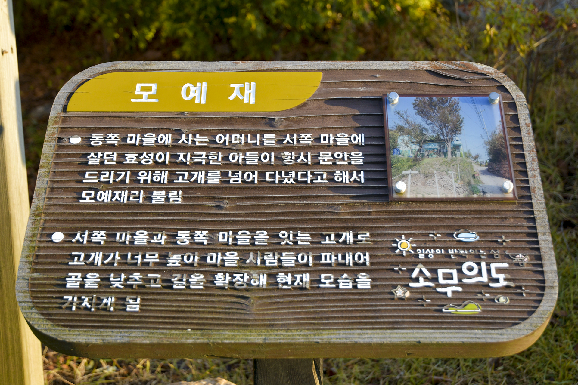 동쪽 마을에 사는 어머니를 서쪽 마을에 살던 아들이 항시 문안을 드리기 위해 고개를 넘어 다녔다고 해서 모예재를 불린다.