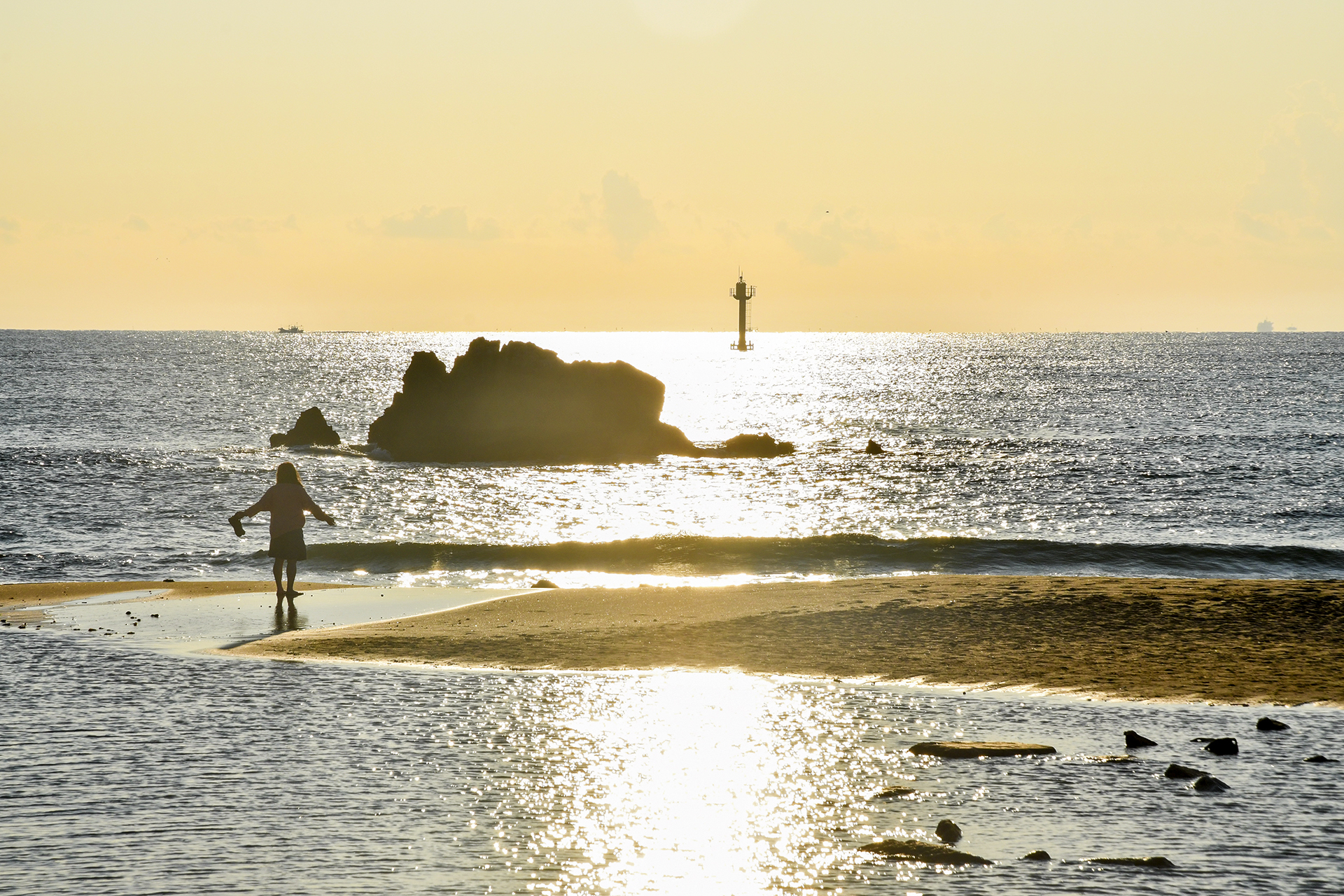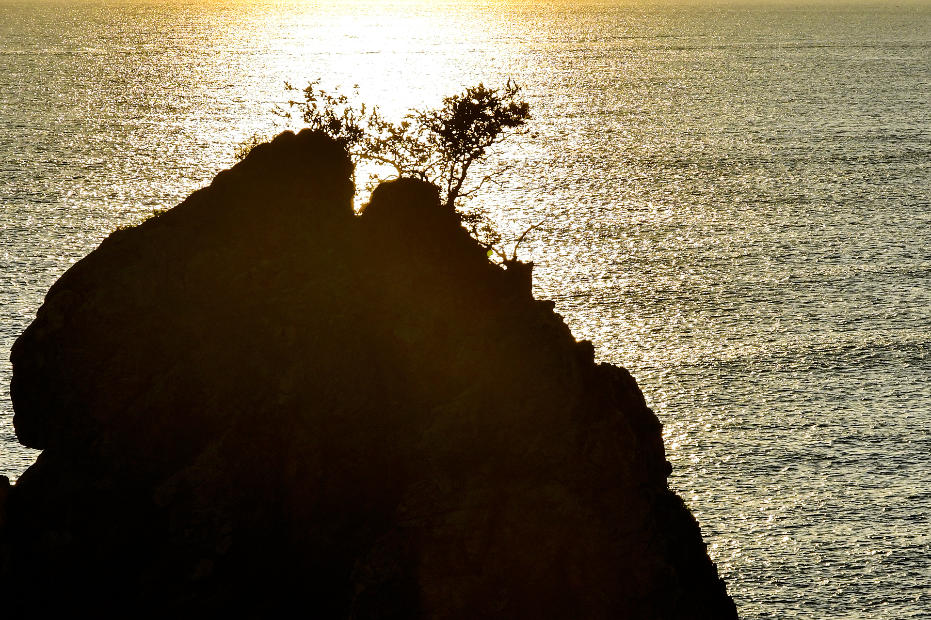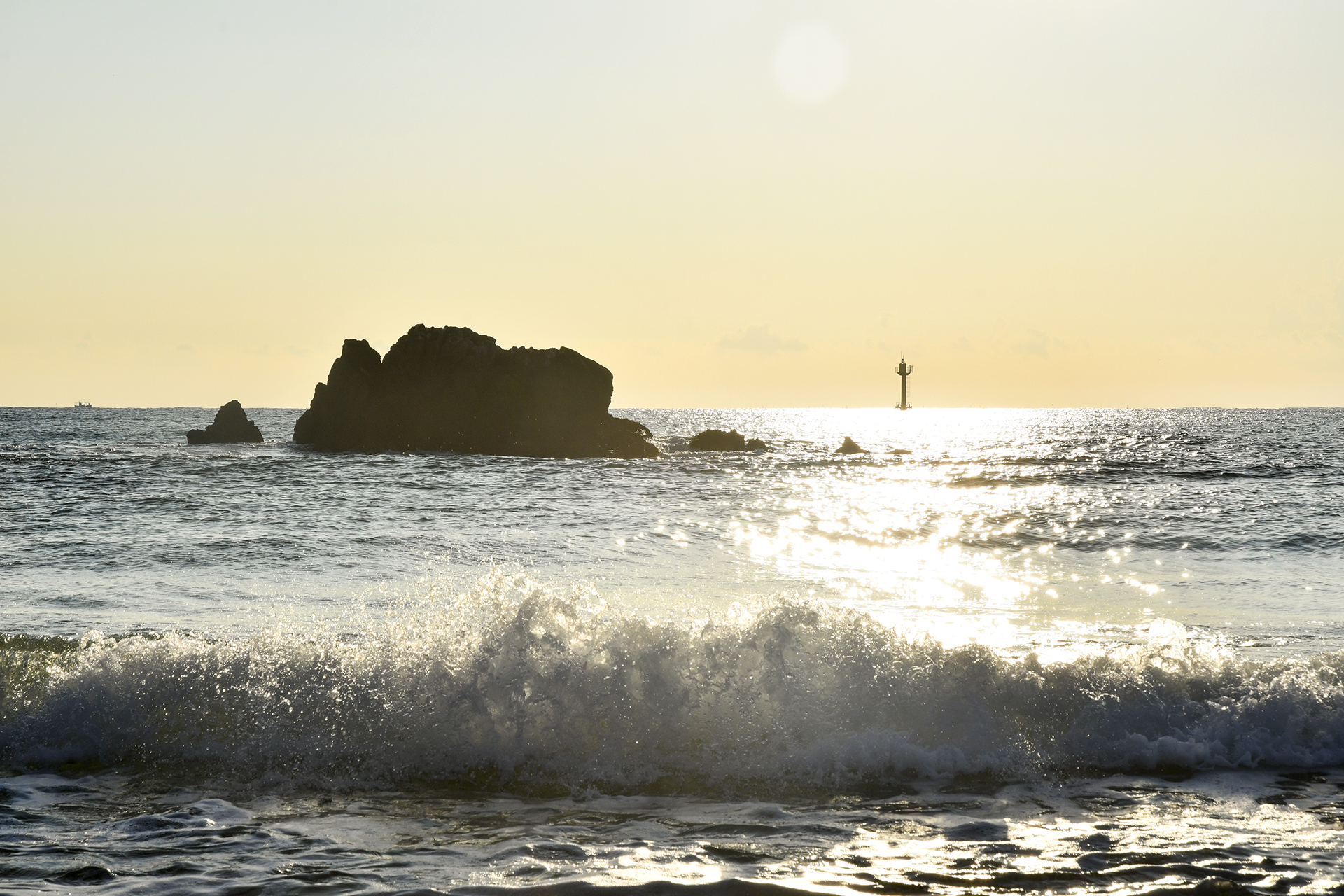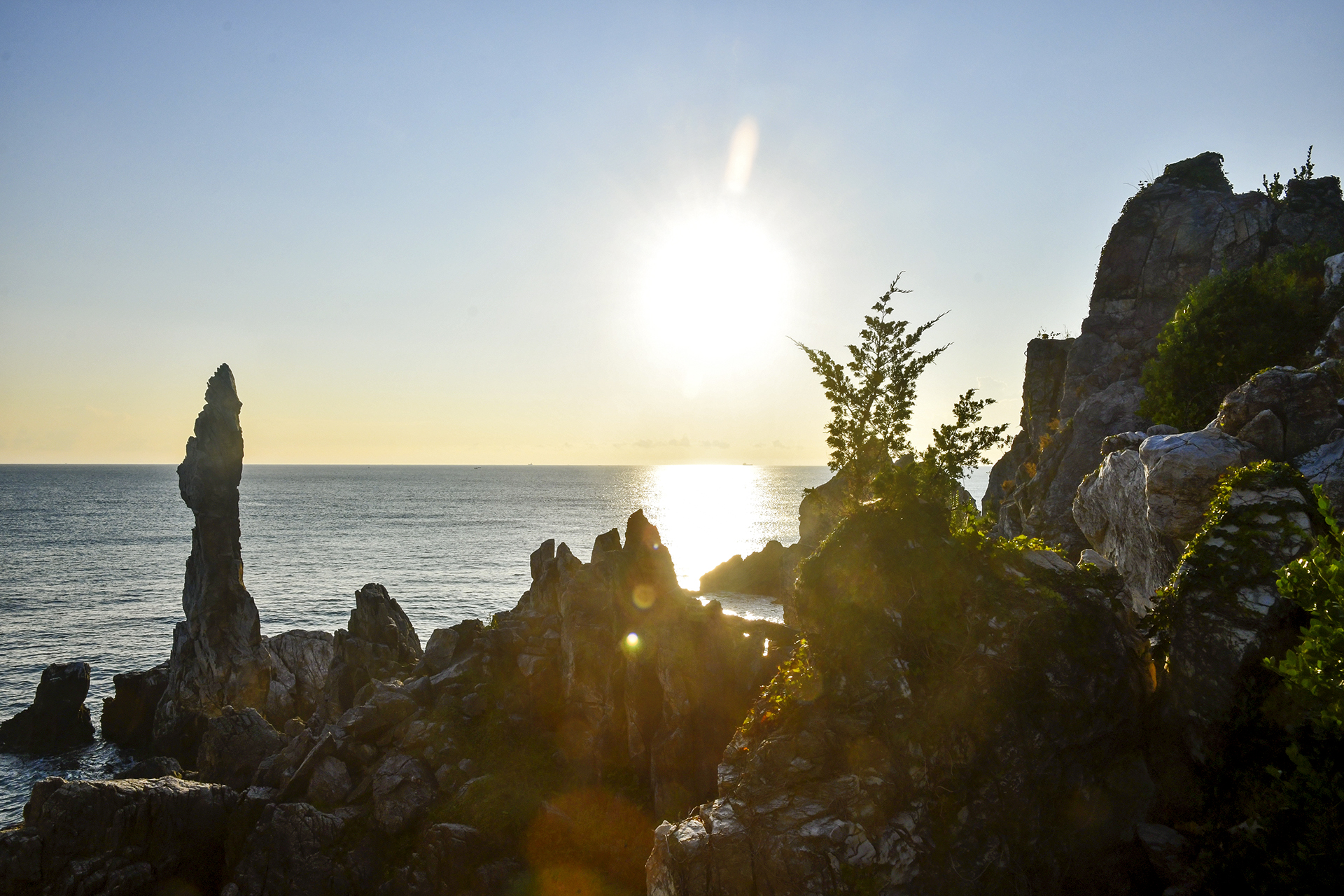 형제바위 뒤로 윤슬이 눈부시다.