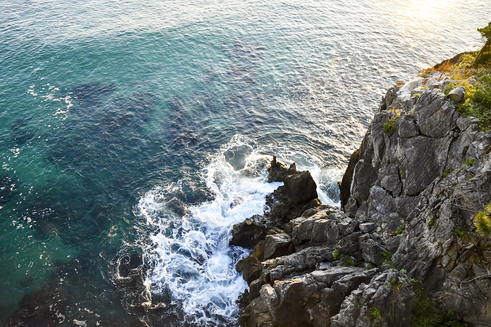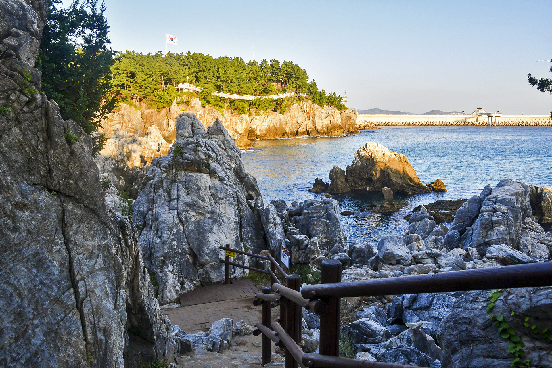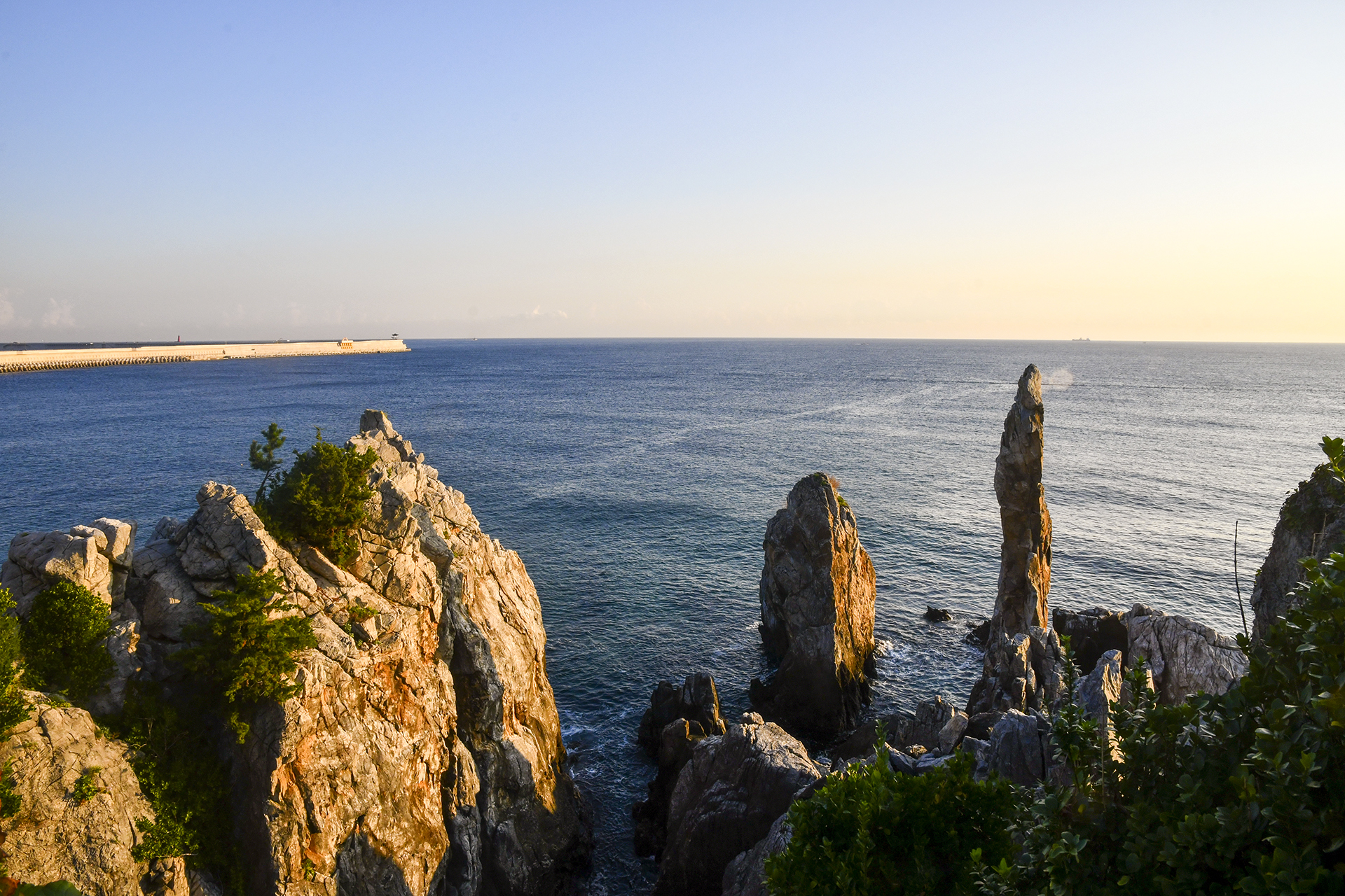 기암 절벽으로 부서지는 파도소리가 듣기 좋은 아침,