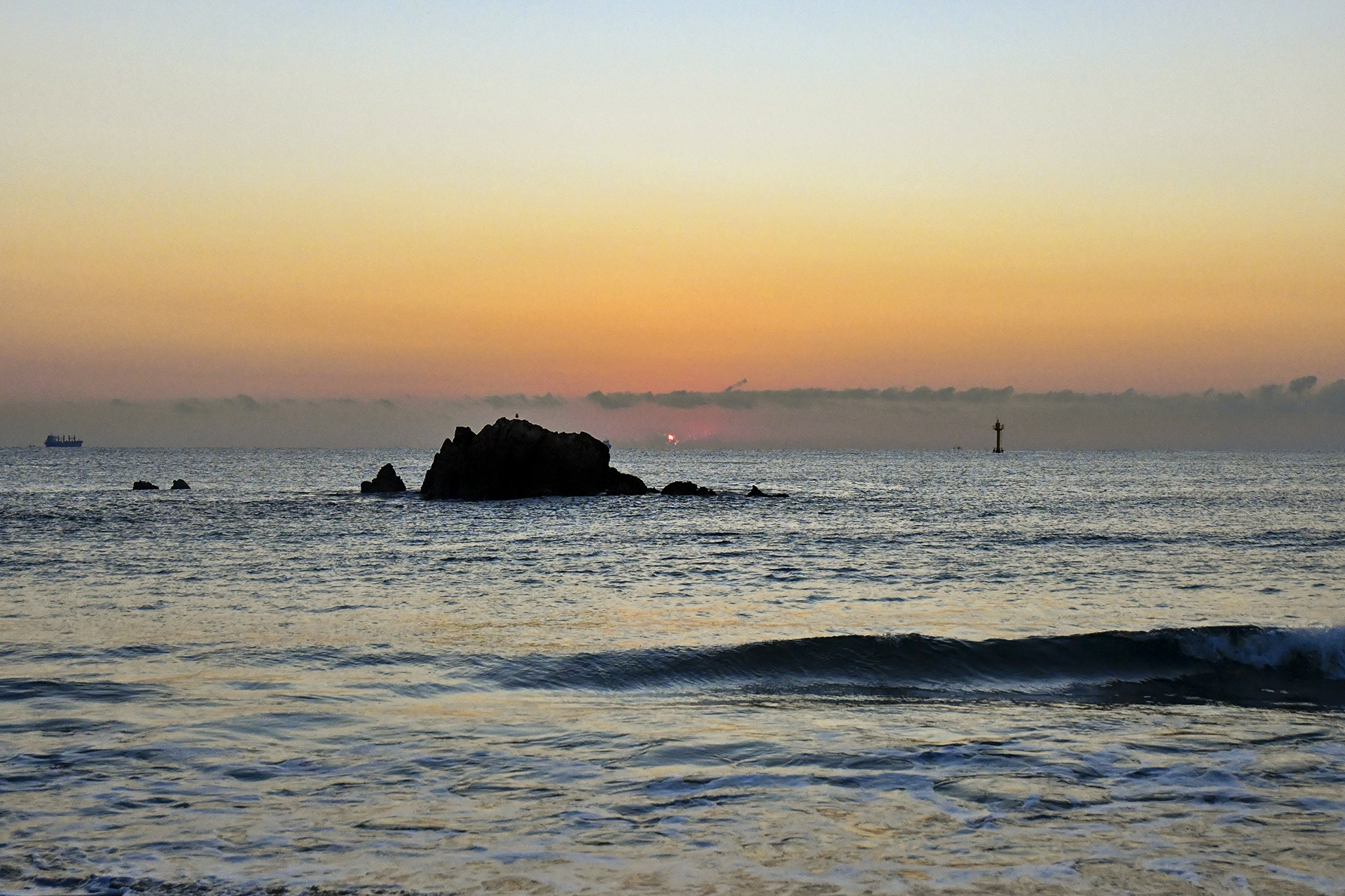수평선 위로 짙은 구름이 깔려 있고, 그 사이로 힘겹게 아침 해가 얼굴을 내밀고 있다.