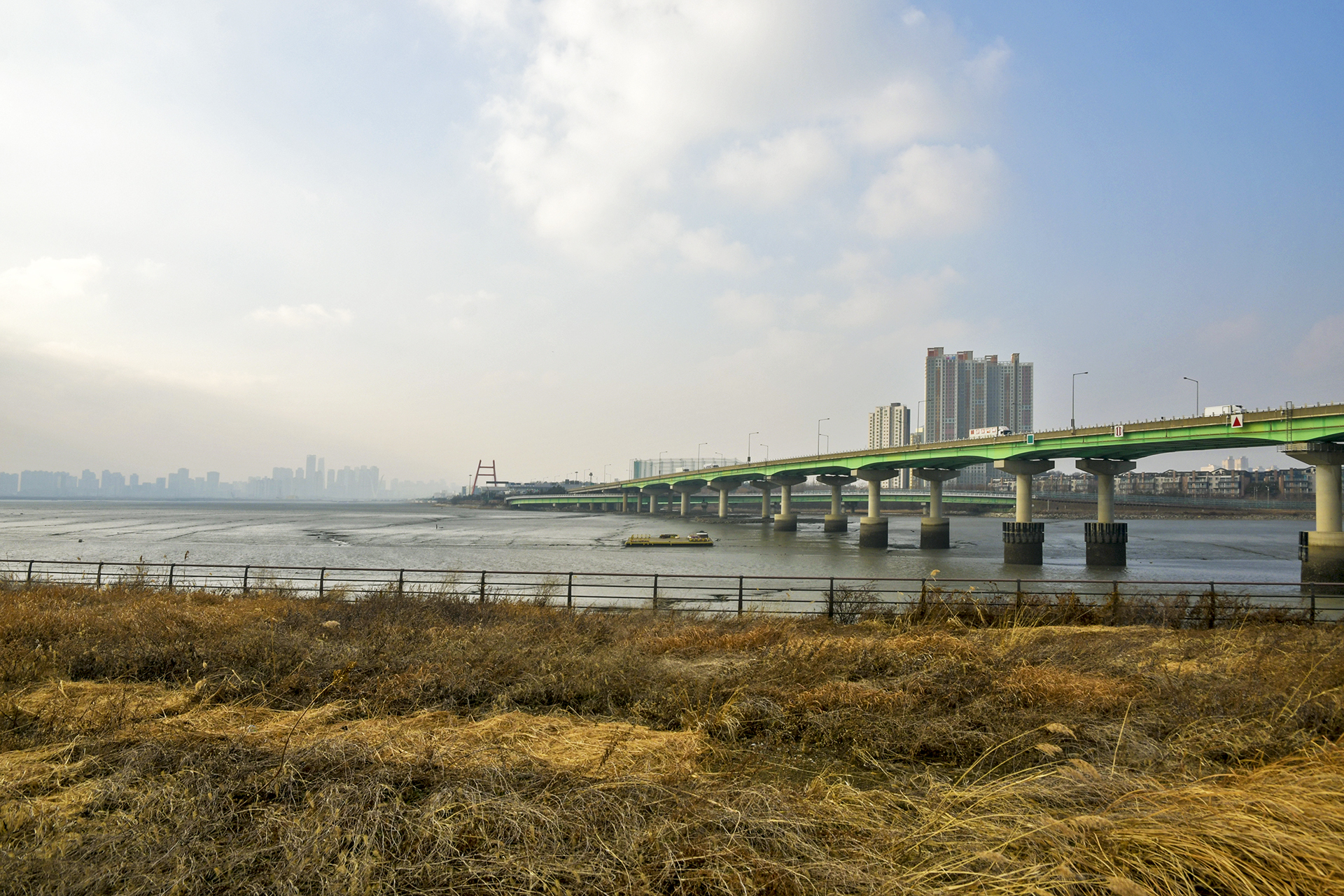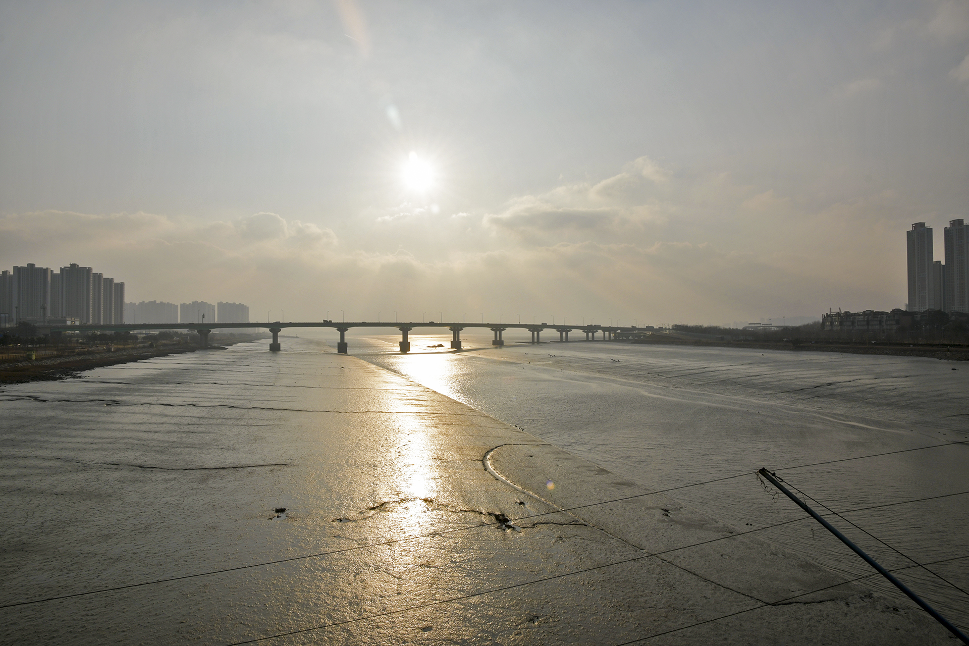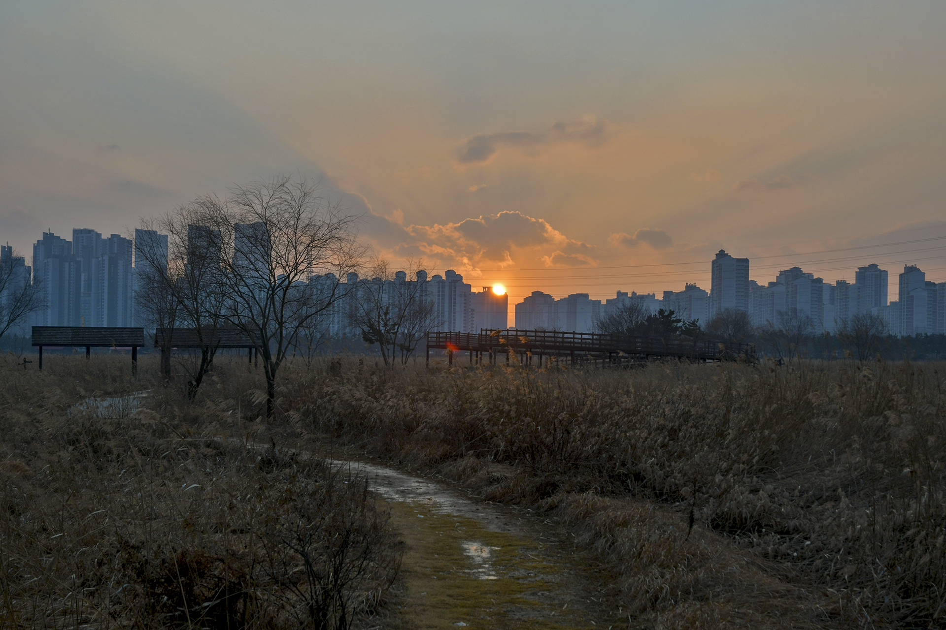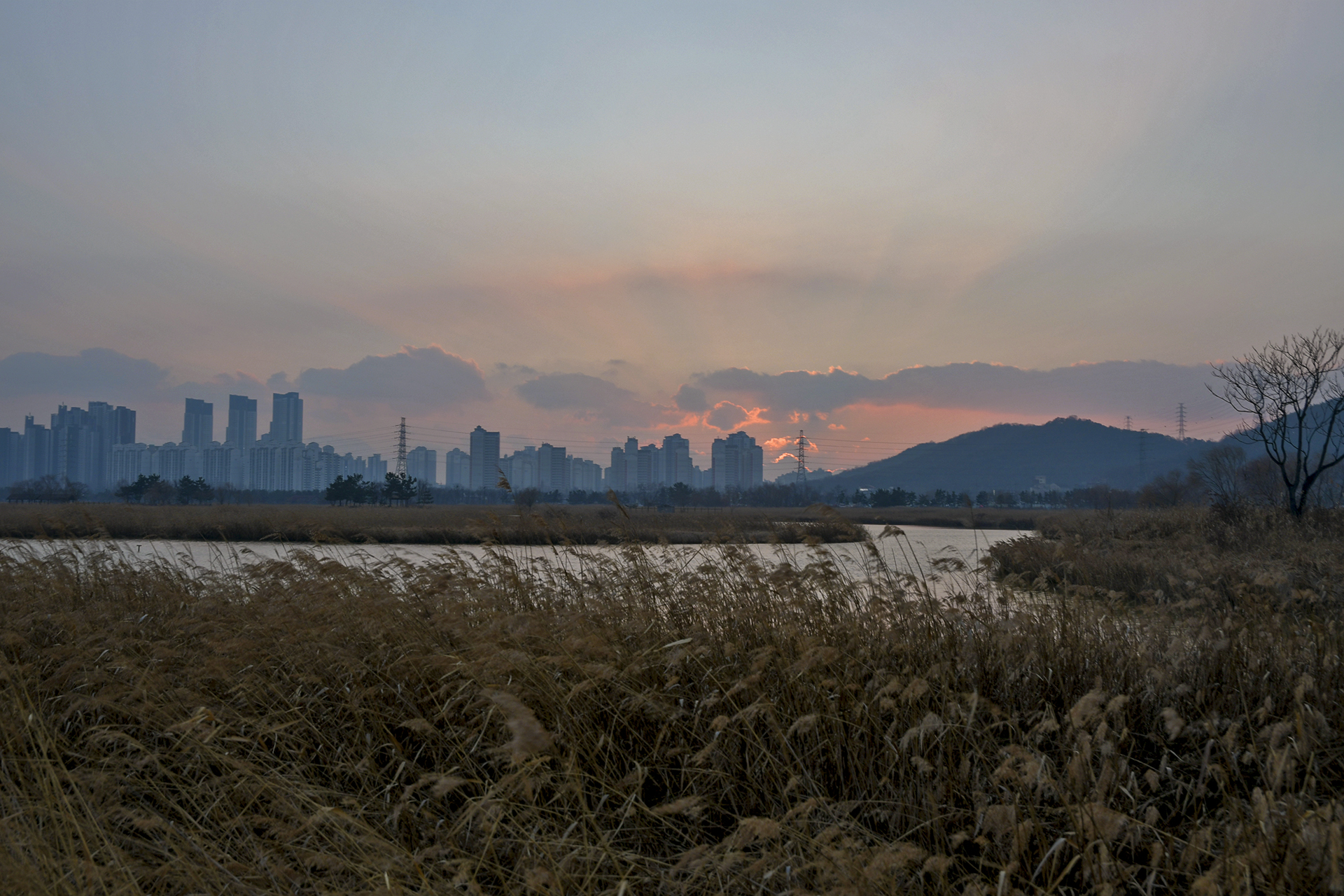 산과 아파트로 막히지만 않았다면 멋진 장면을 볼 수 있었을텐데, 갈대밭으로 훑고 지나가는 바람소리만 남았다.