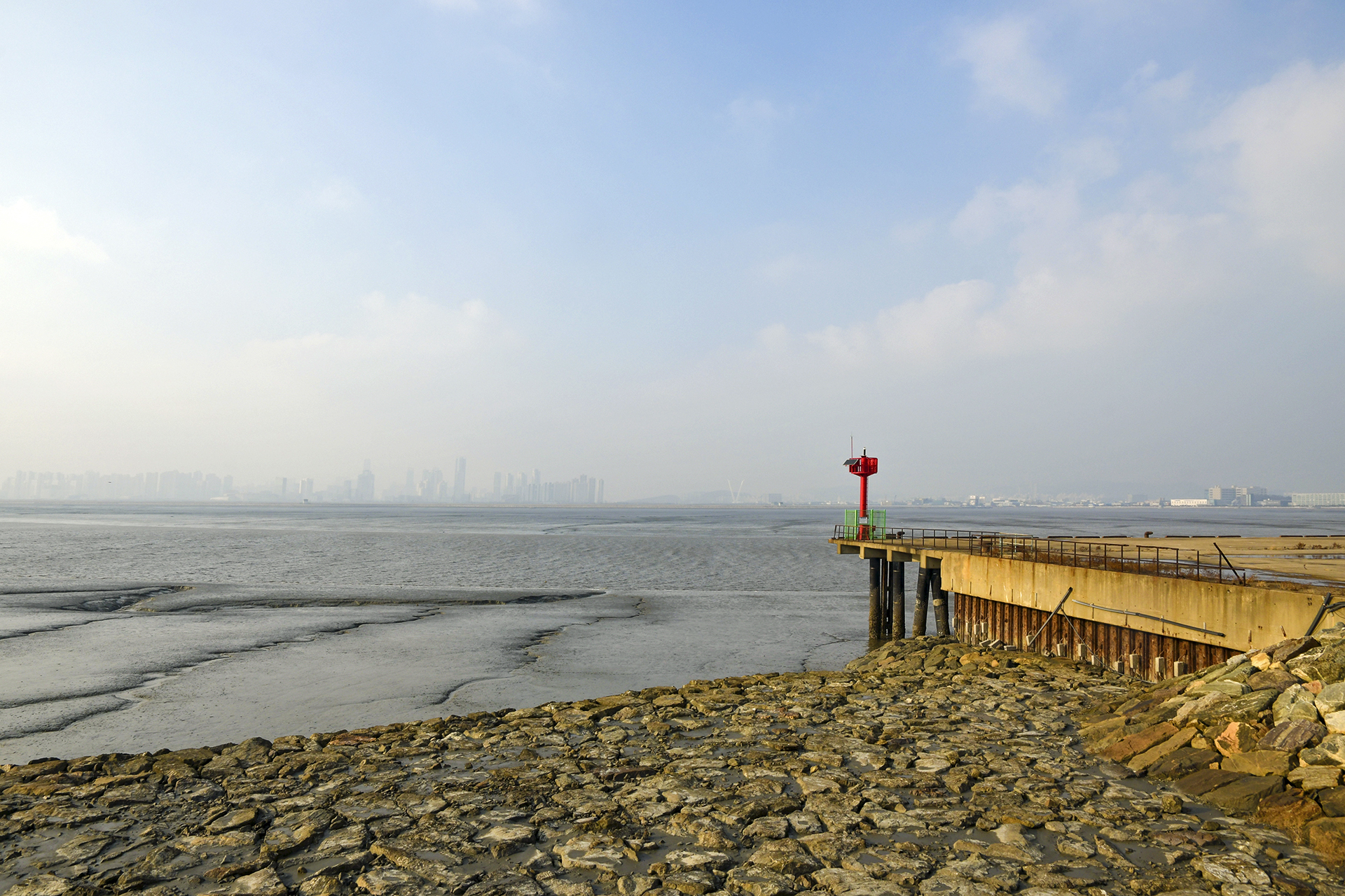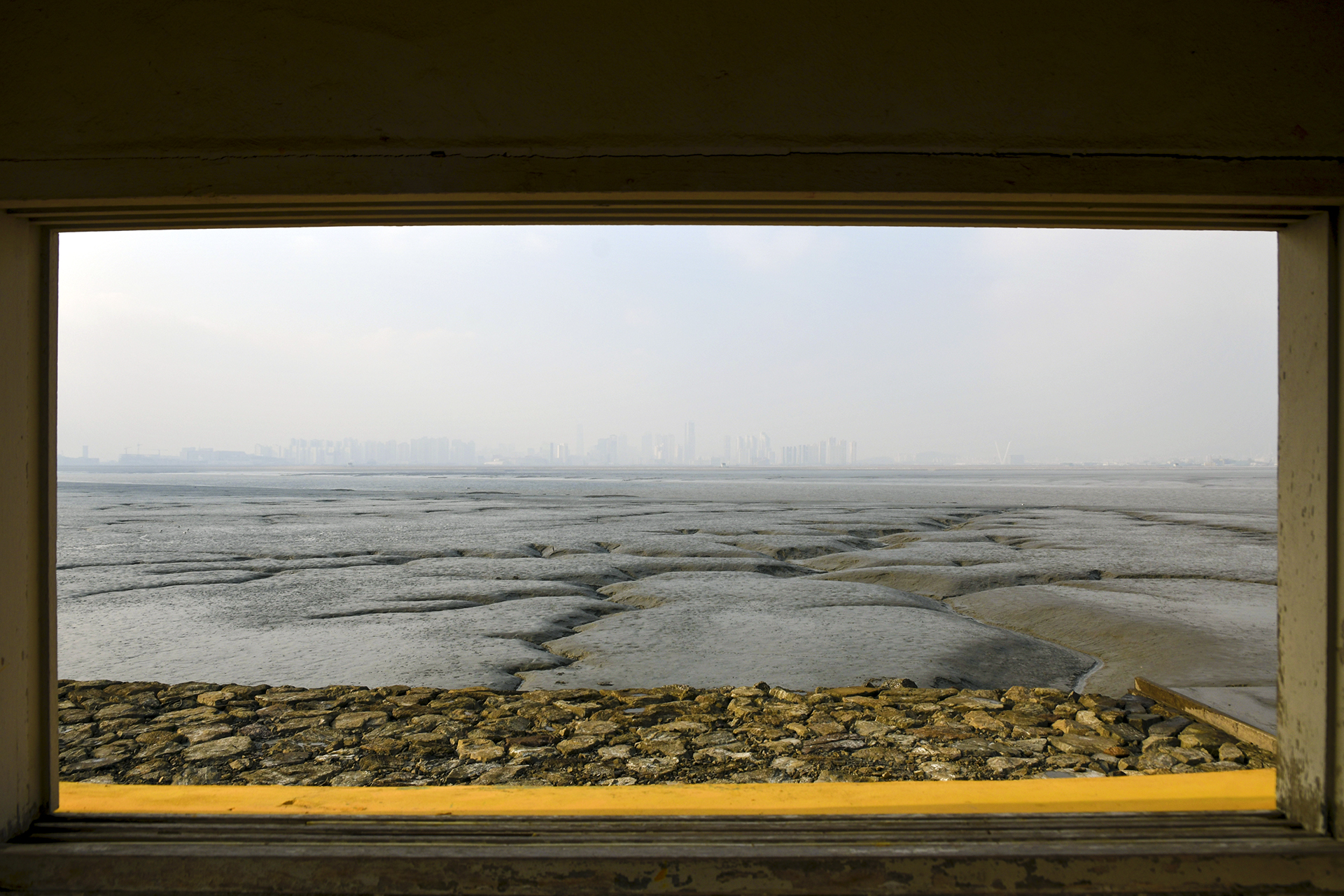 겨울이라 휑한 갯벌체험장의 모습이 뒷쪽 도심지역과 대비를 이루며 독특한 환경을 보여준다.