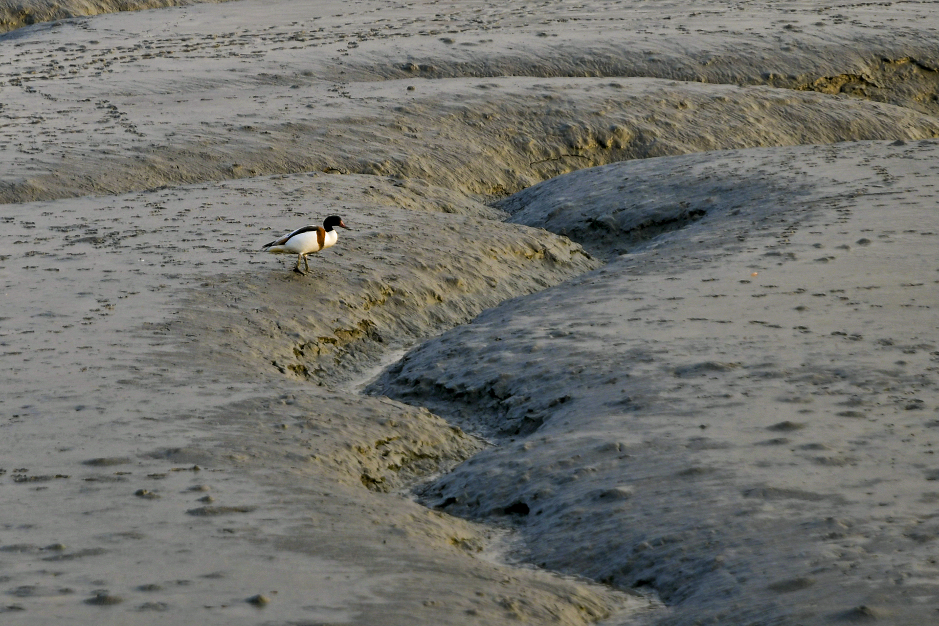 질퍽한 갯벌을 총총총 걸어가며 식사중인 새 한마리, 목도리를 두른 듯한 특이한 아이, 갯골에서 잠시 멈칫한다.