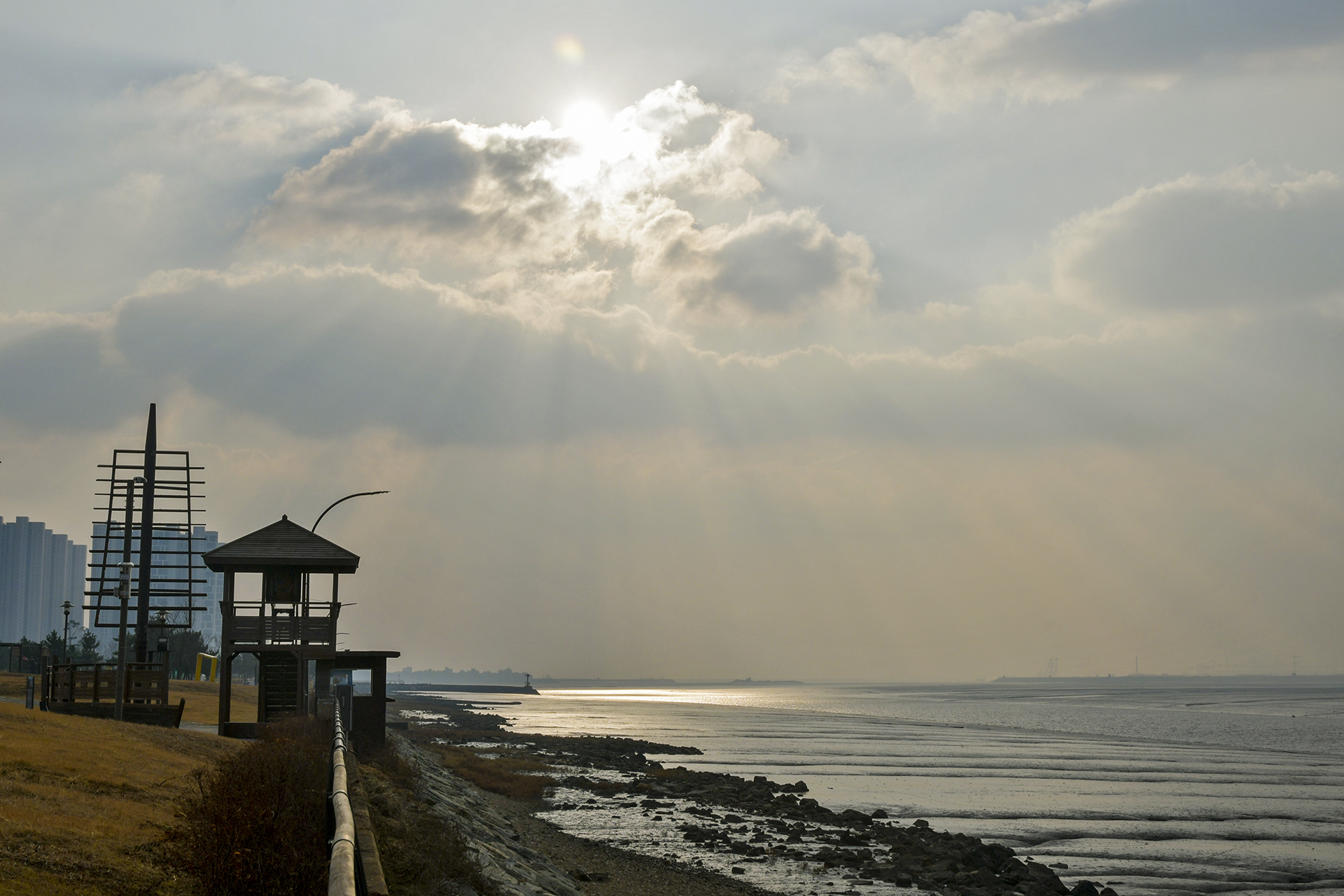 푸른바다는 아니지만 서해만의 특별한 바다 풍경이 좋다. 서서히 물이 들어오고 있는 바다 위로 햇살이 쏟아져 내리는 중.