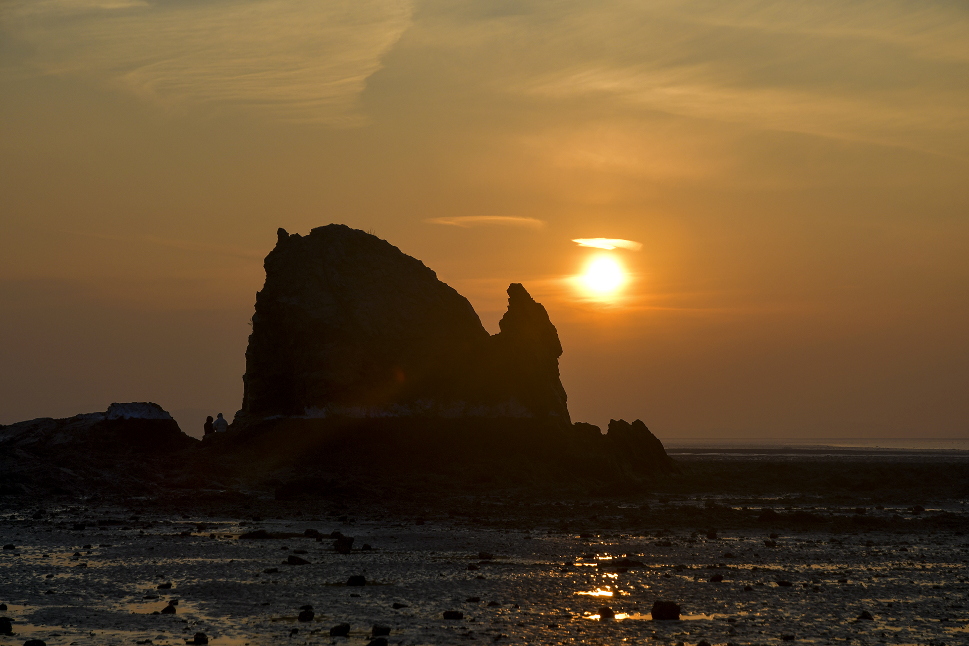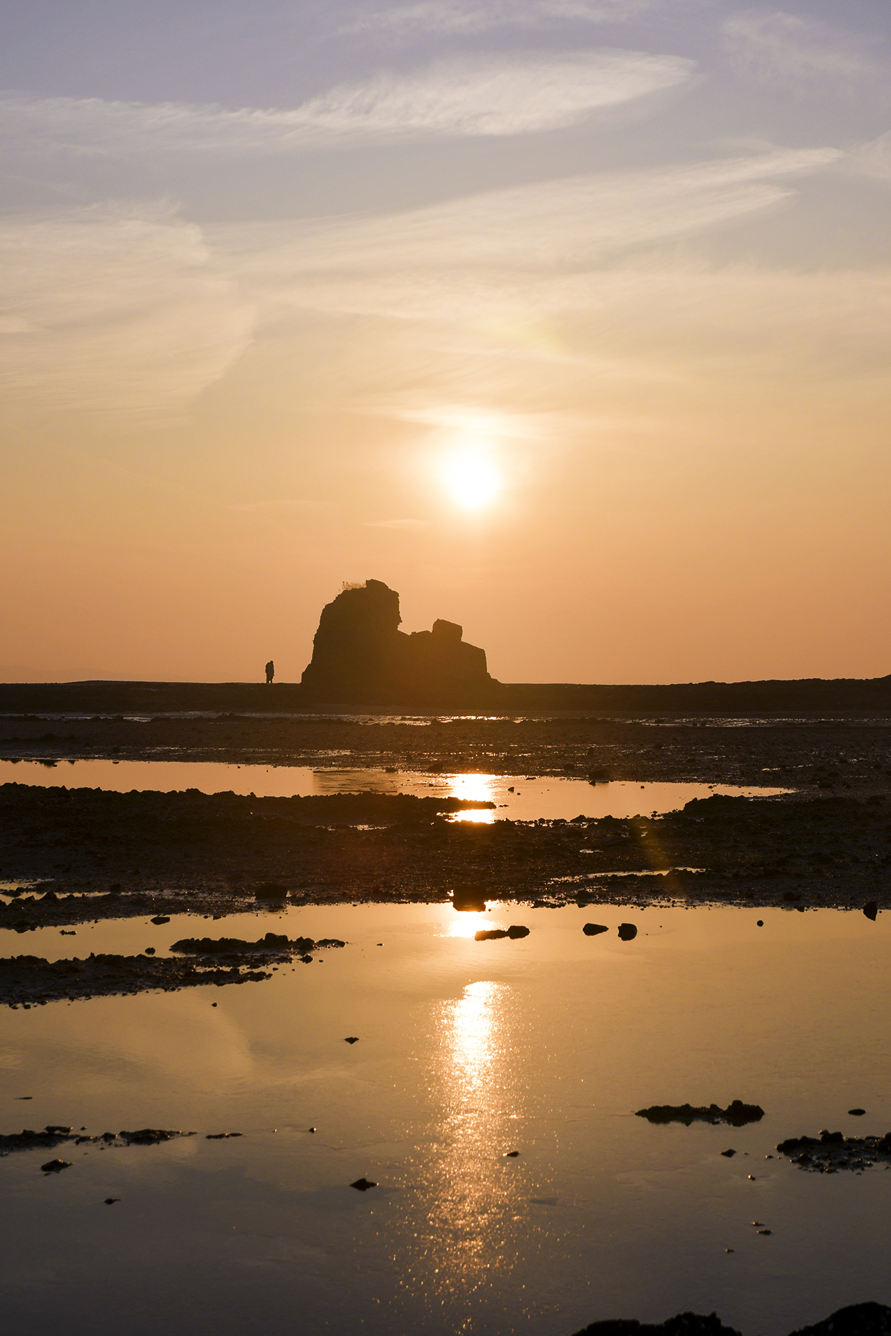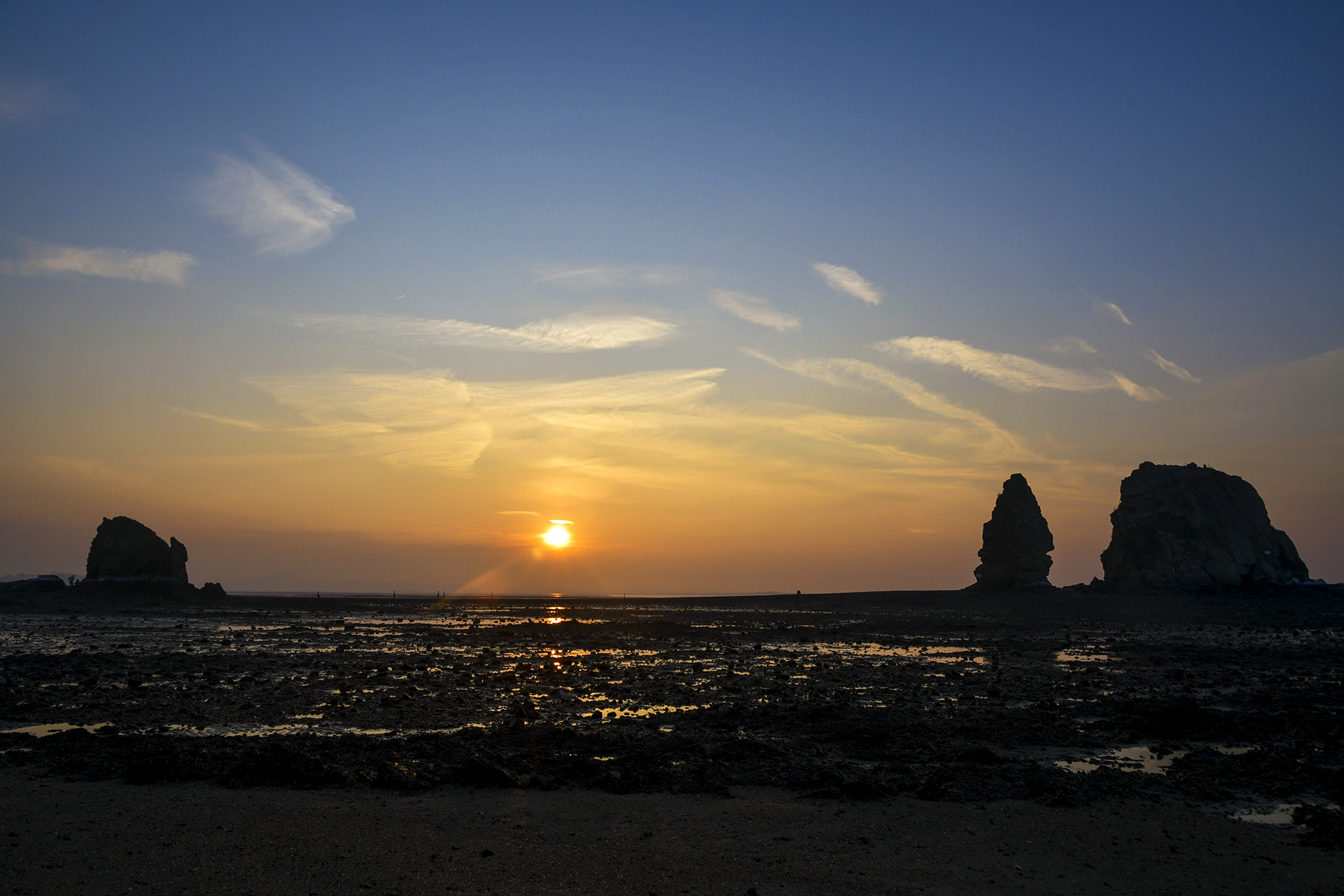 물빠진 갯벌을 따라 들어가 해뜨는 방향을 바위에 맞추어 자리를 잡았다.