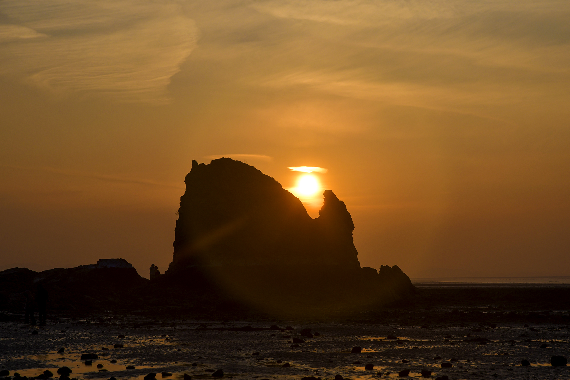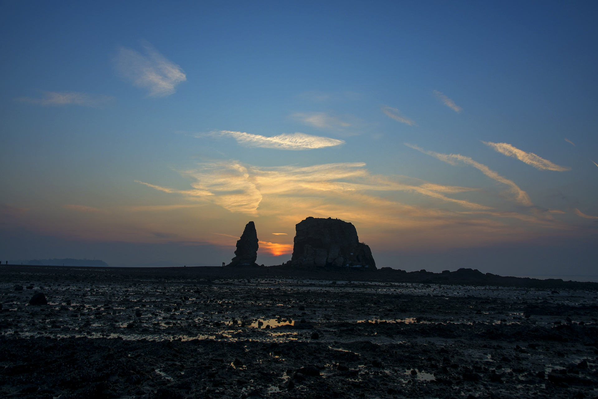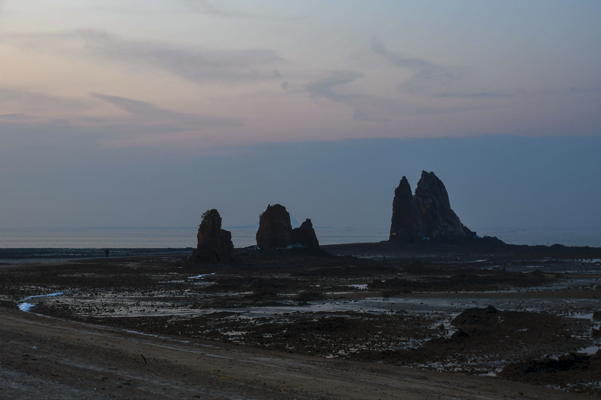 물빠진 갯벌을 따라 들어가 해뜨는 방향을 바위에 맞추어 자리를 잡았다.