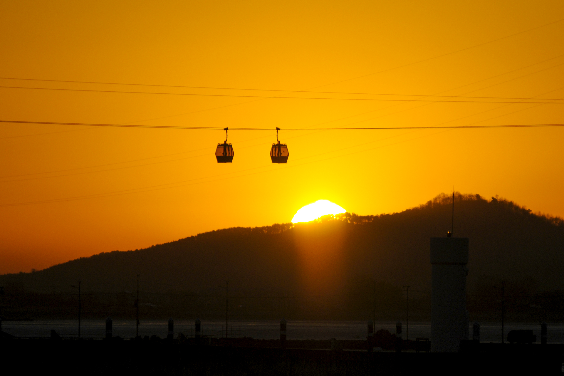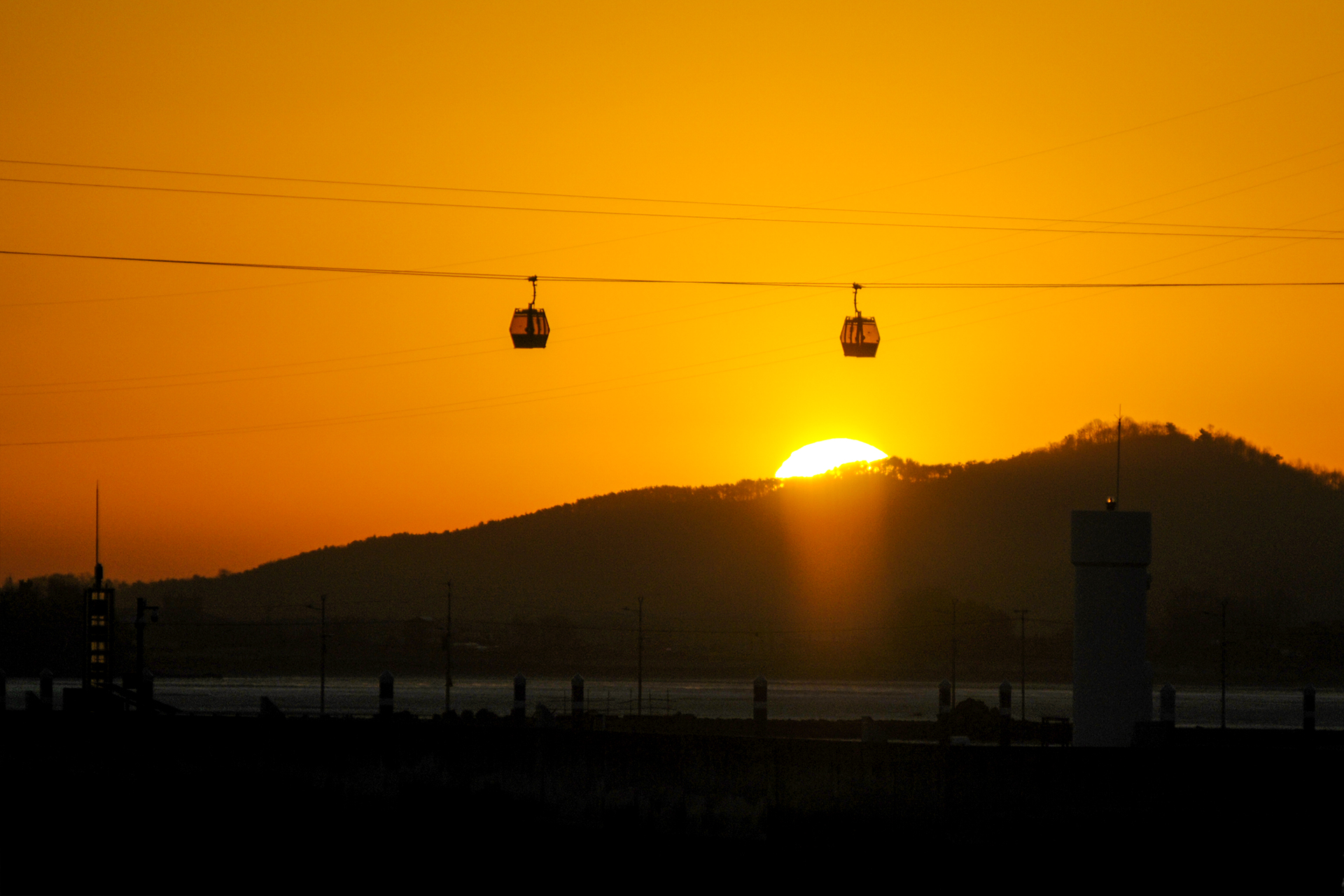 줄에 매달린채 정지된 케이블카 뒤로 오늘 해가 떠오른다. 이 색감 어쩔~~~