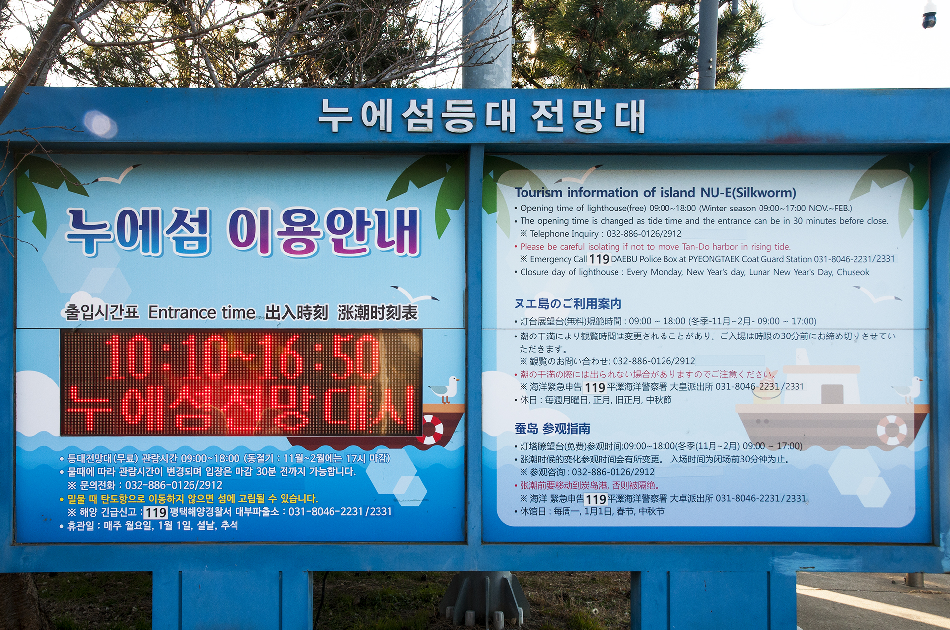 오늘 누에섬 출입시간은 10:10 ~ 16:50분 까지, 물때에 따라서 출입시간이 바뀐다.