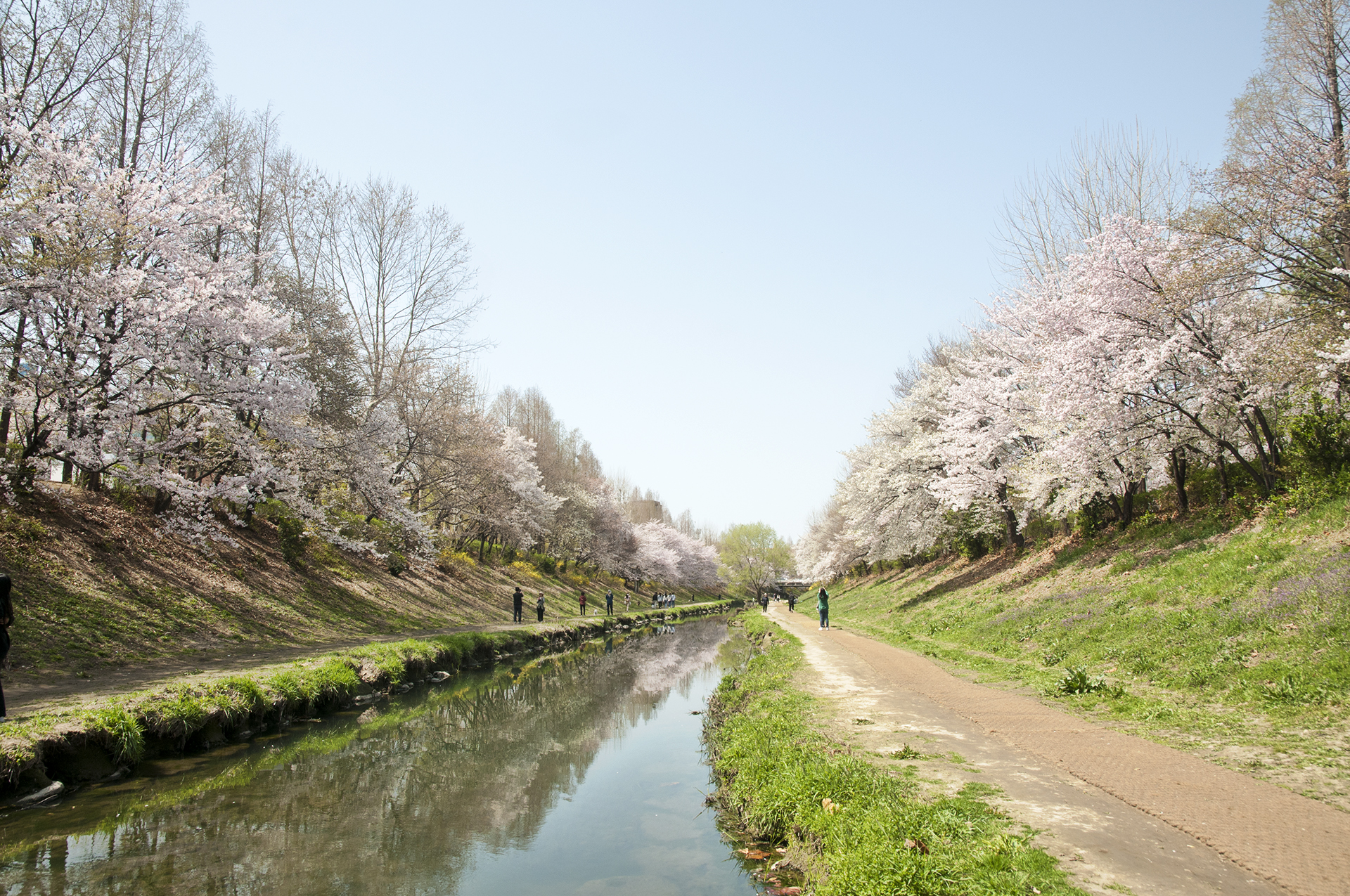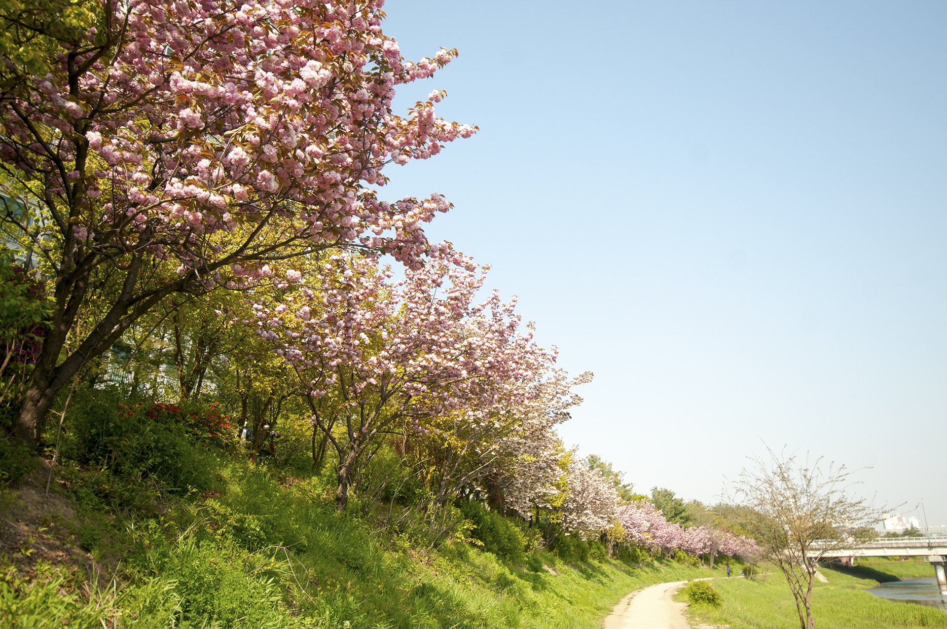 굴포천을 따라 부천 방향으로 걸으며 부평역사박물관을 지나 부부다리 (부부의 교량)까지 가면 겹벚꽃을 볼수 있다.
