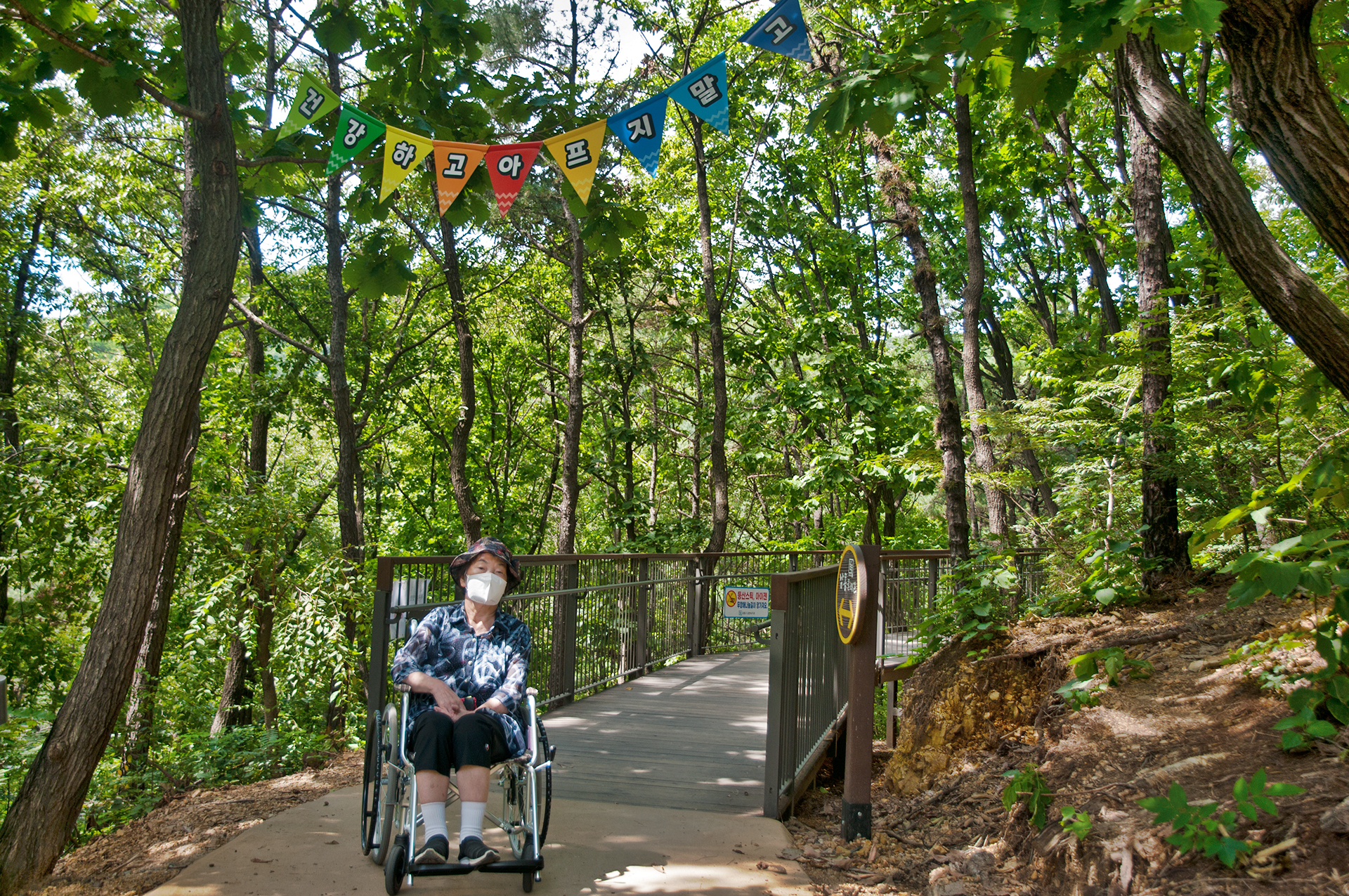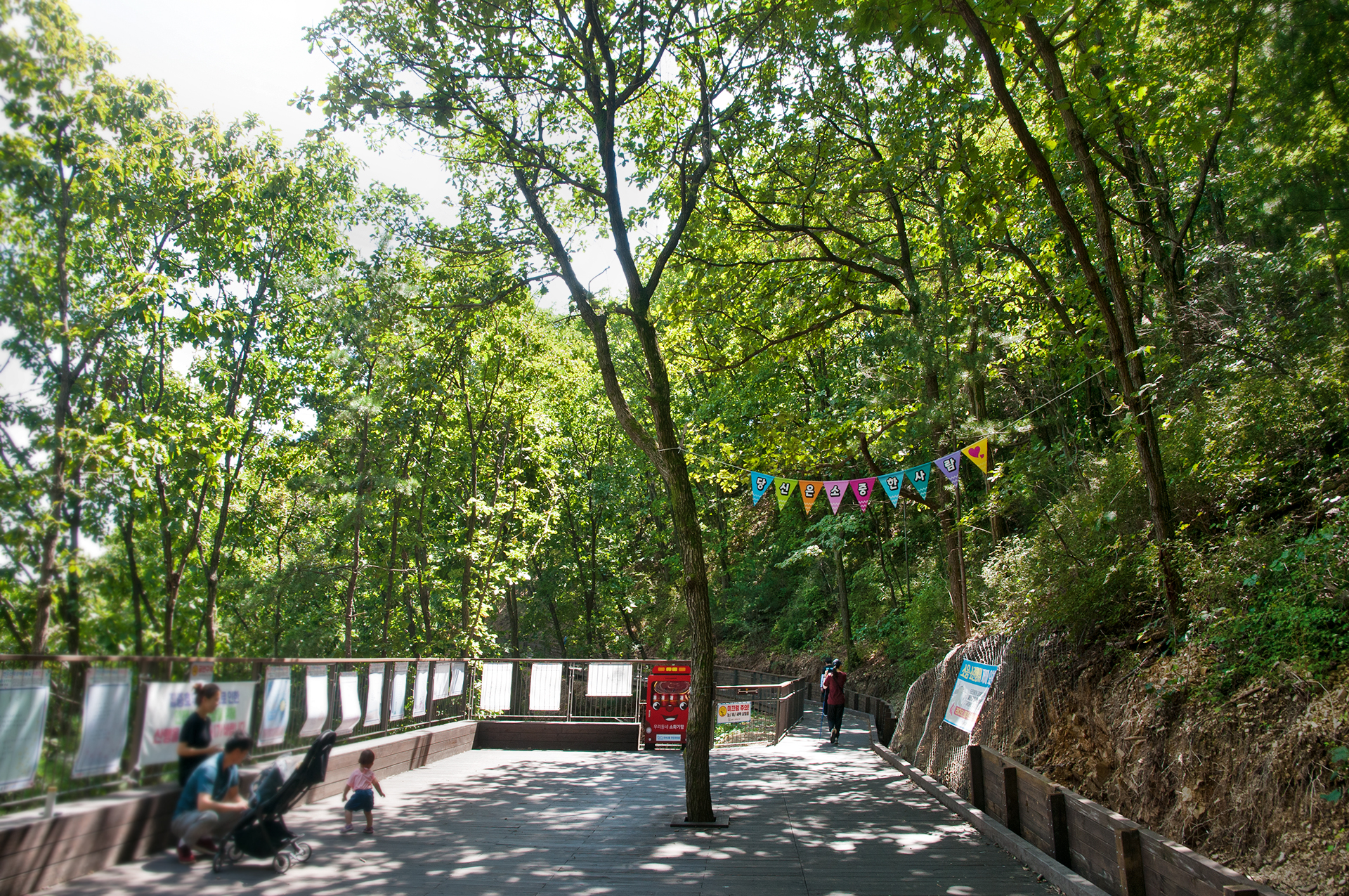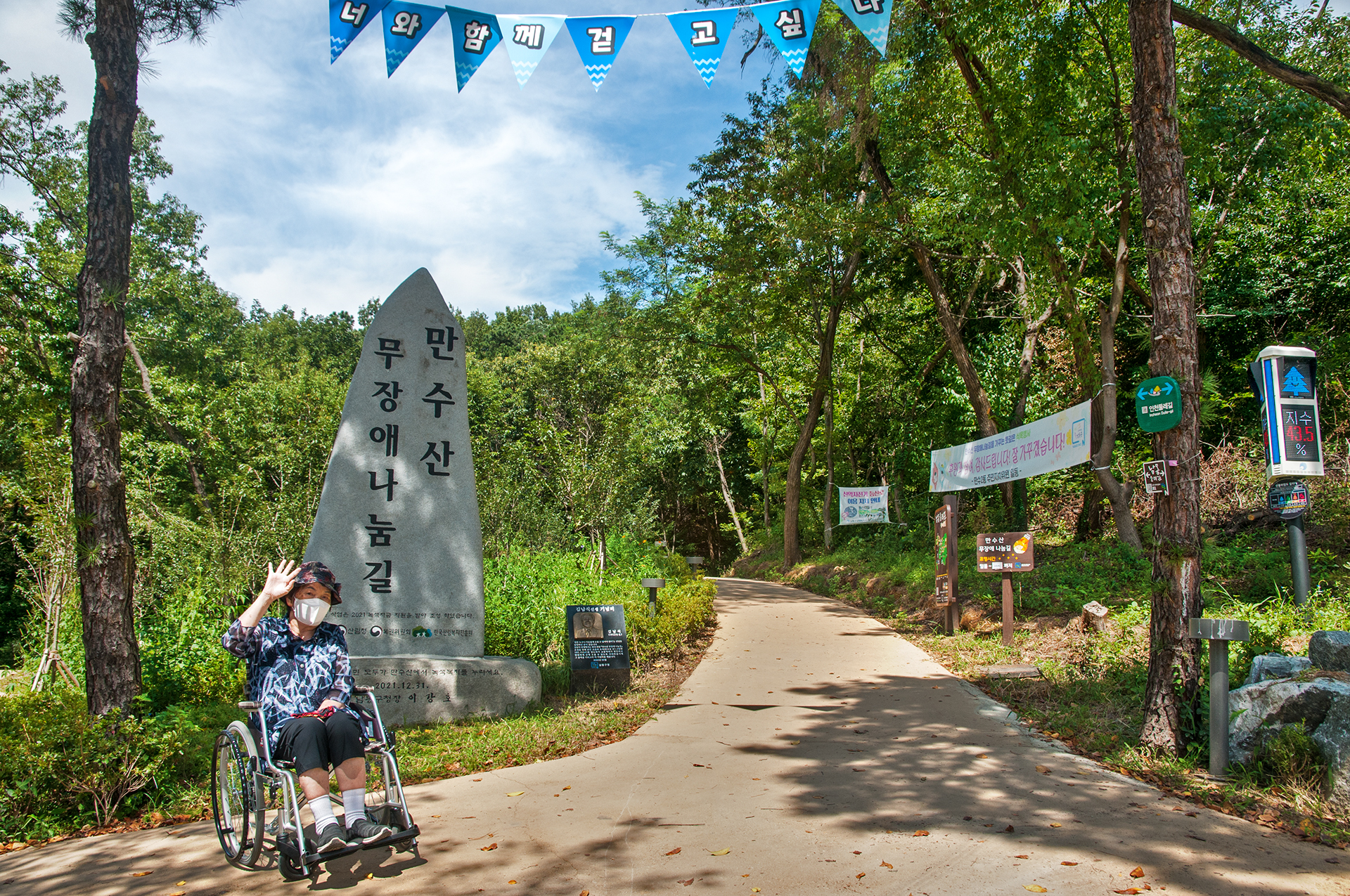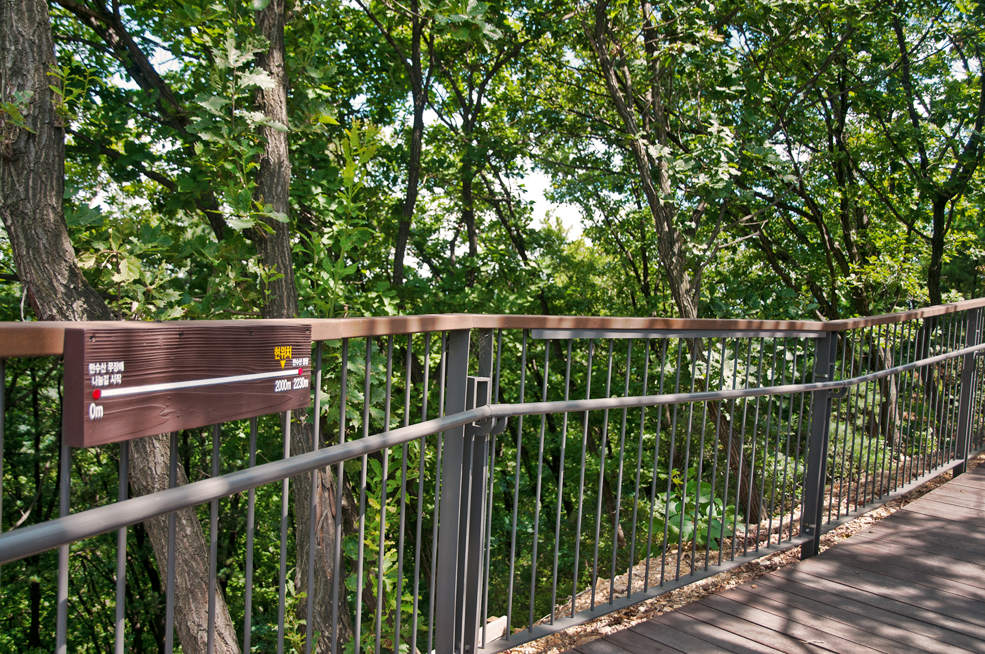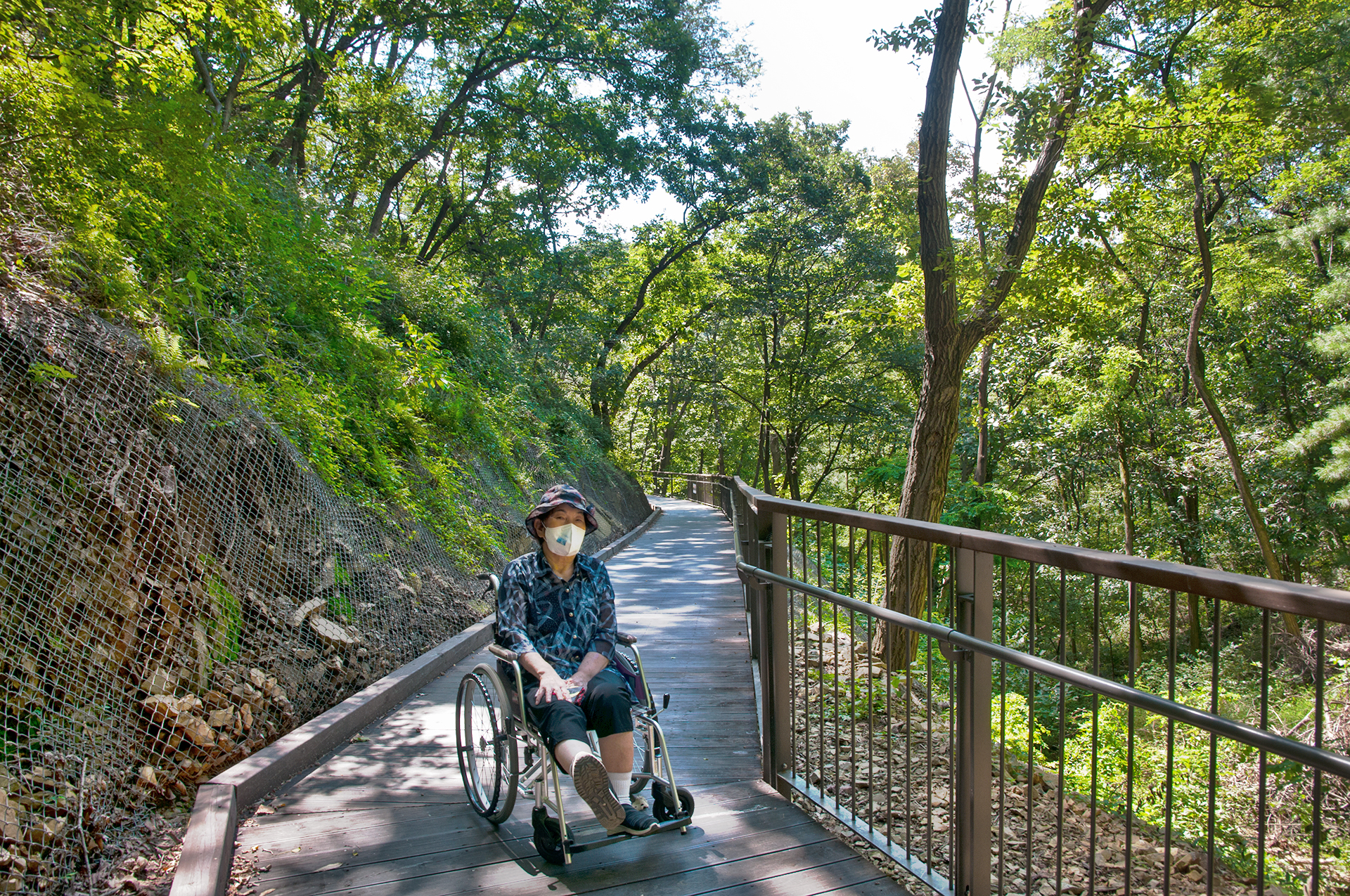 무장애나눔길은 장애인, 노약자, 임산부, 영유아 등의 교통약자 및 구민 모두가 안전하게 숲의 혜택을 함께 누릴수 있도록 계단없이 만들어진 등산로를 말한다. 무려 그 길이가 2,230m로 전국 최장의 무장애나눔길이라고 한다.