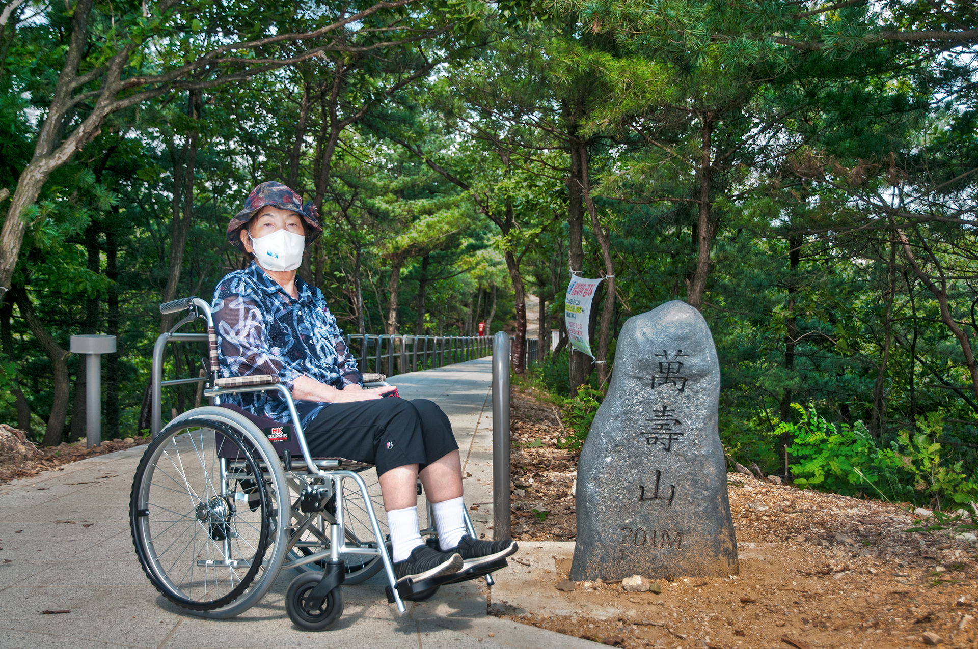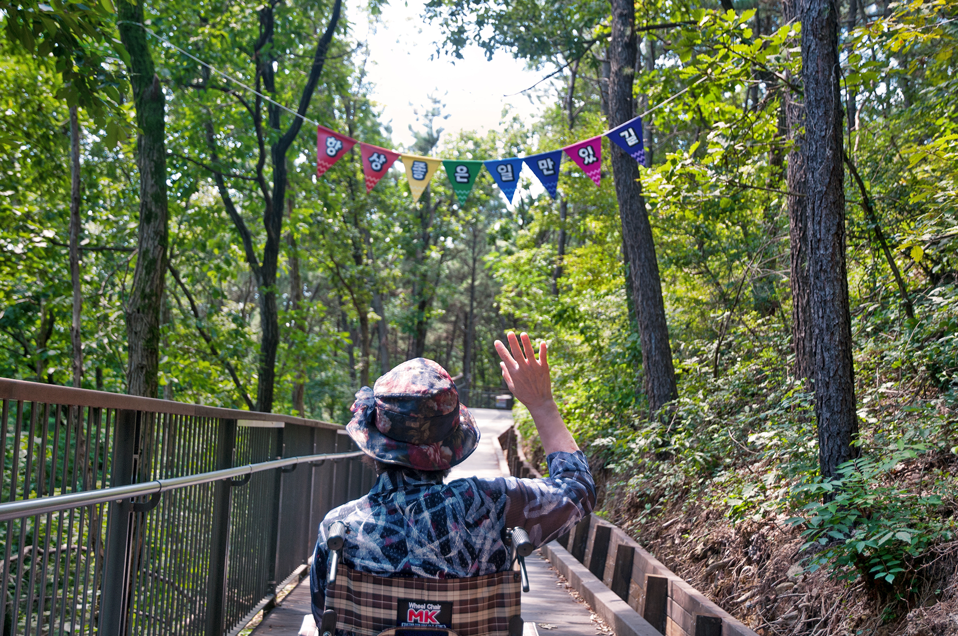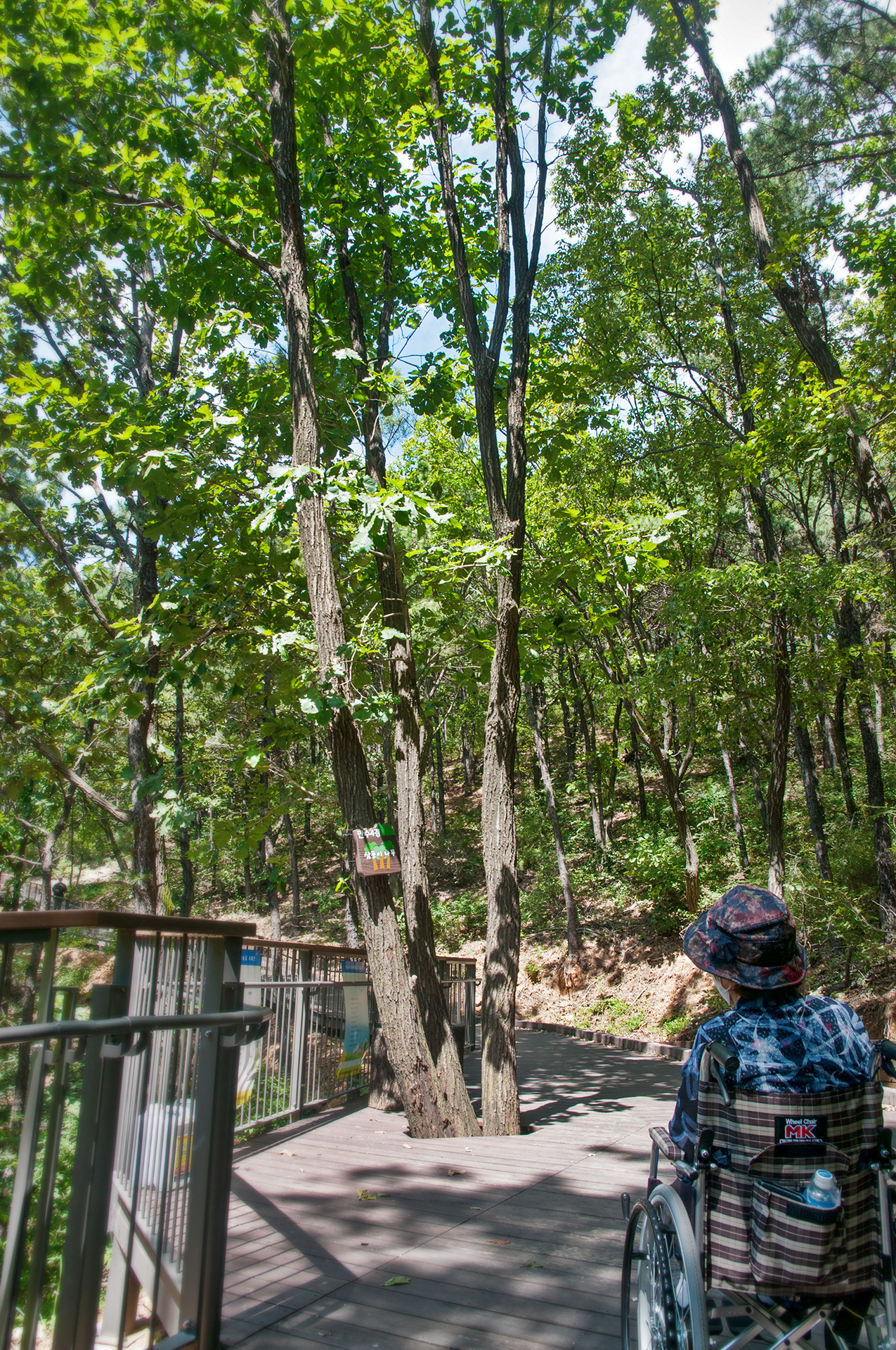 이제부터는 나무데크길이 정상까지 이어진다. 휠체어 바퀴 굴러가는 소리가 특이하게 들려오고 많은 산새들의 지저귐에 엄니 또한 기분이 업되어 있다.