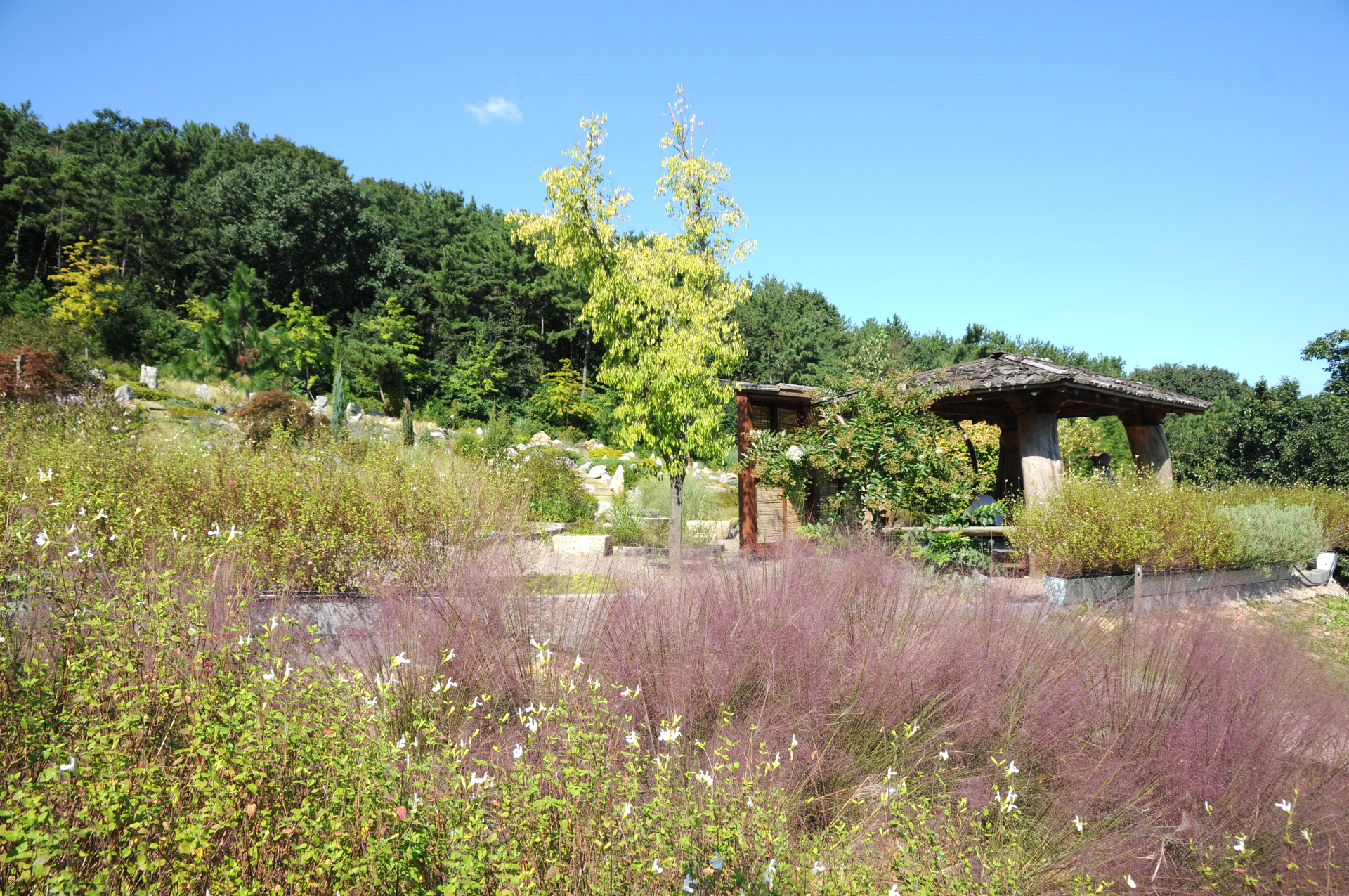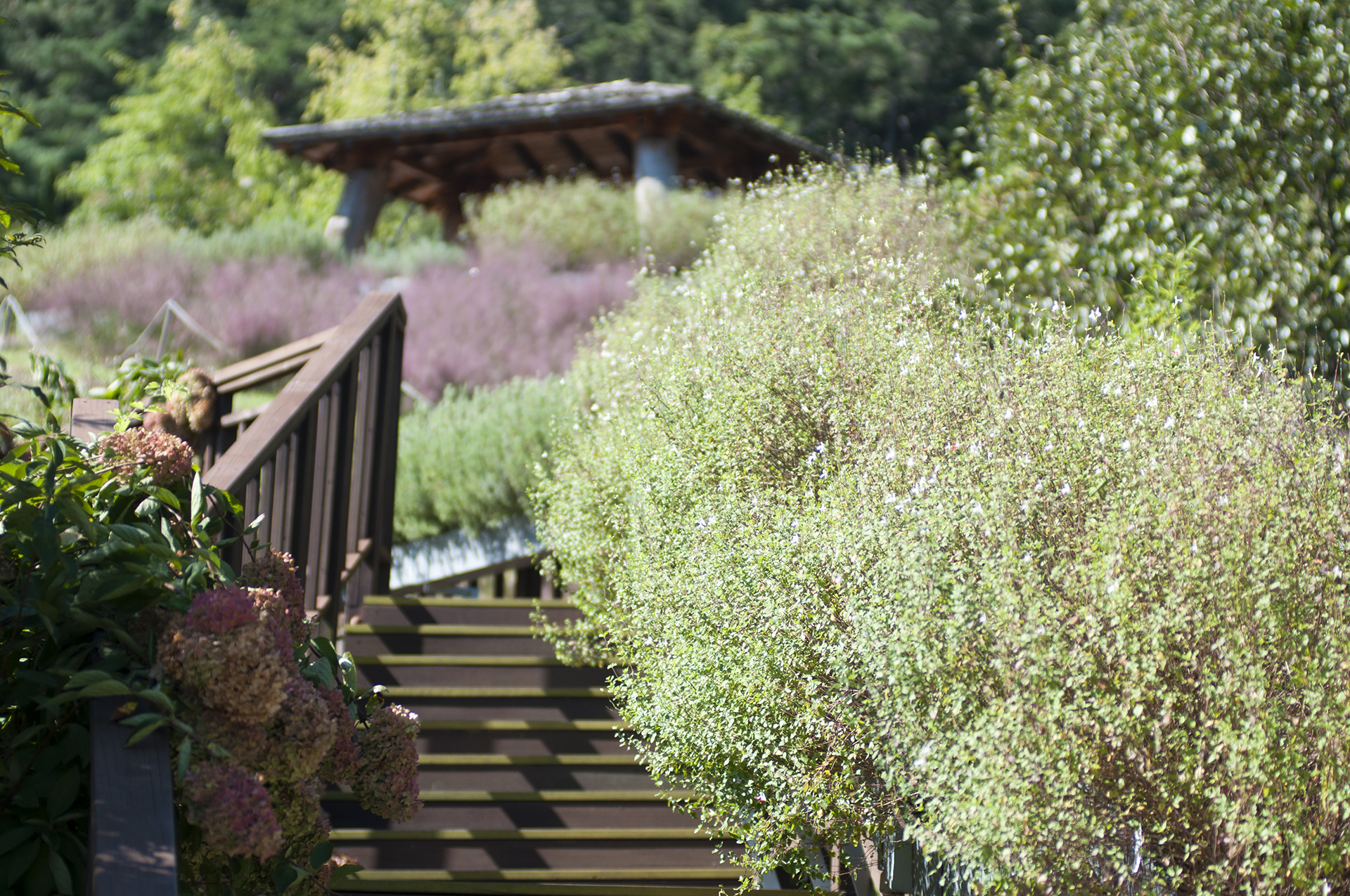 계단에서 바라본 허브원 작은 원두막과 그 아래 작은 규모의 핑크뮬리가 피었다.