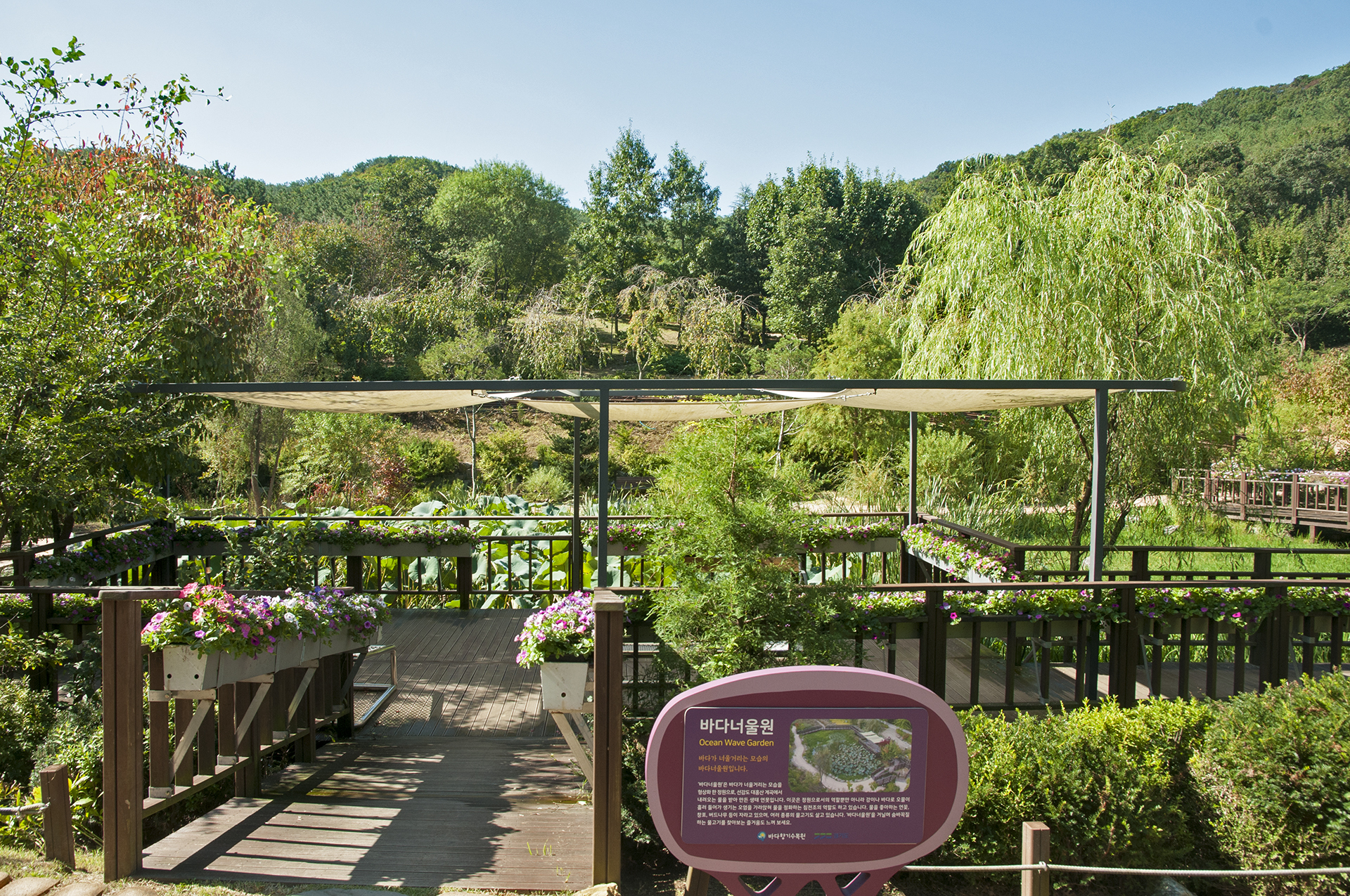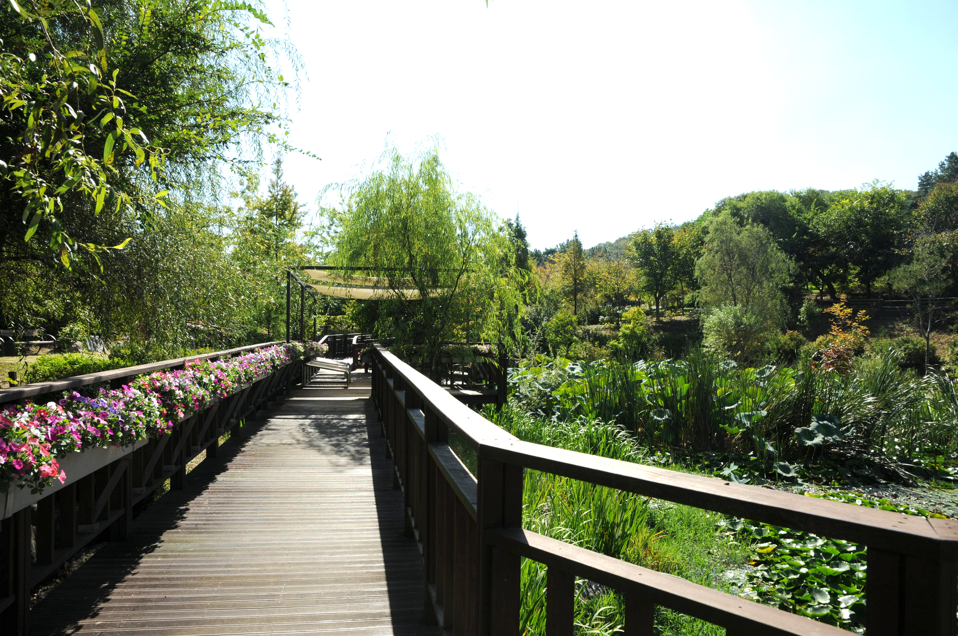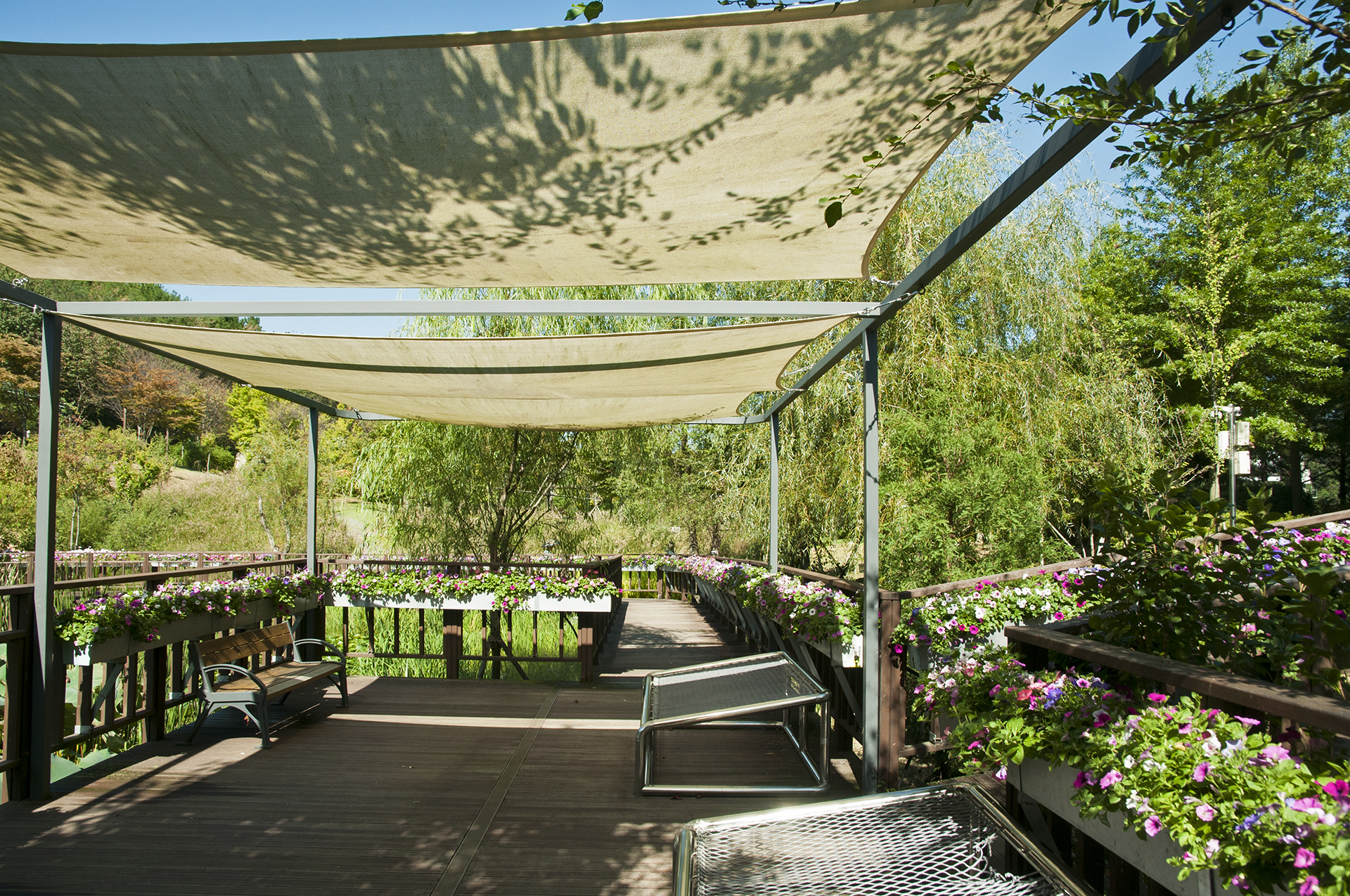 전망데크에는 위를 천으로 덮어 그늘을 만들어 주었고 산책로 난간에는 온통 꽃으로 장식되어 있다.