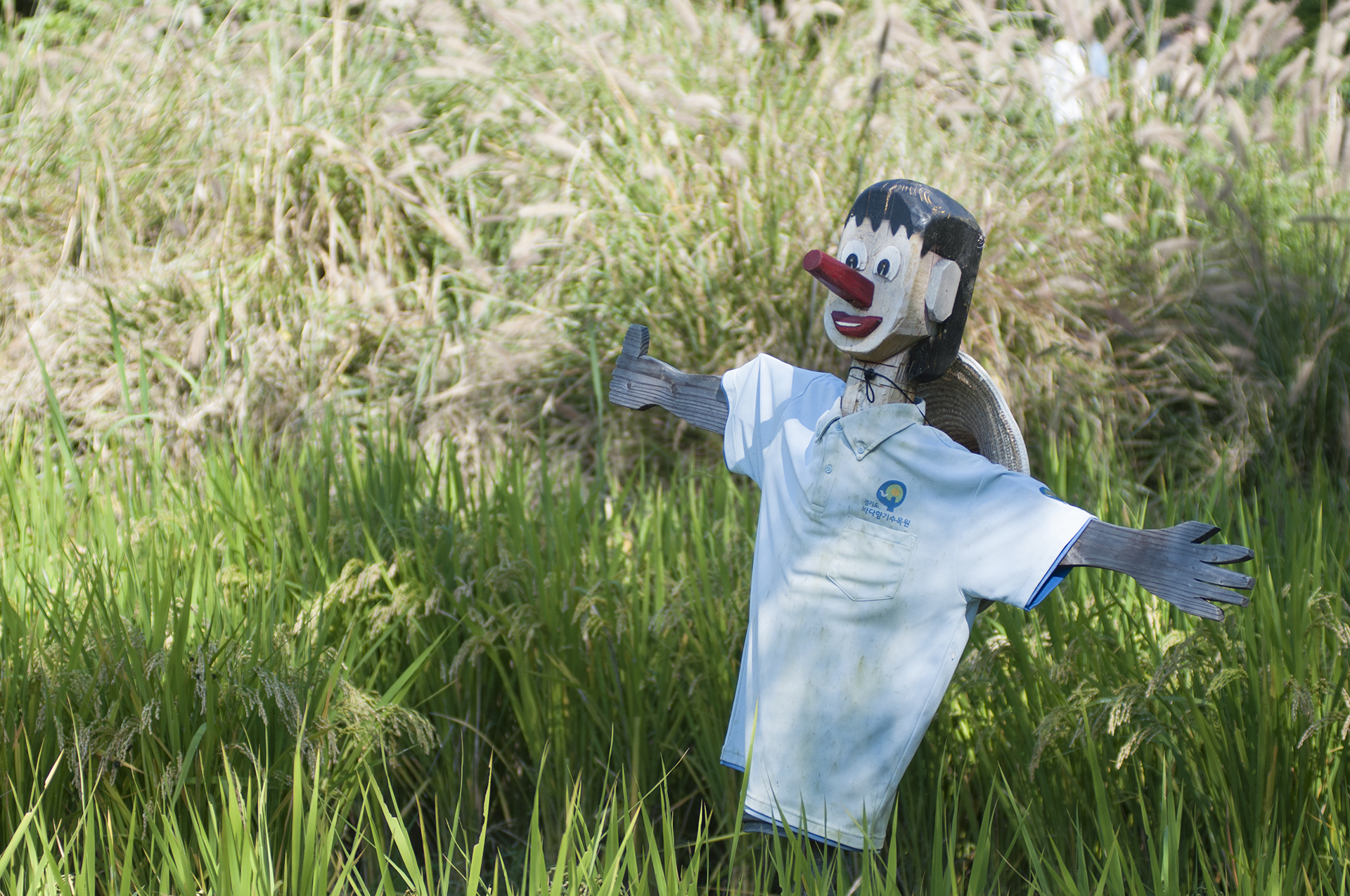 바다향기수목원 유니폼을 입고 있는 허수아비씨, 벼가 누렇게 익어가는 논 한가운데서 저홀로 지키고 있다.