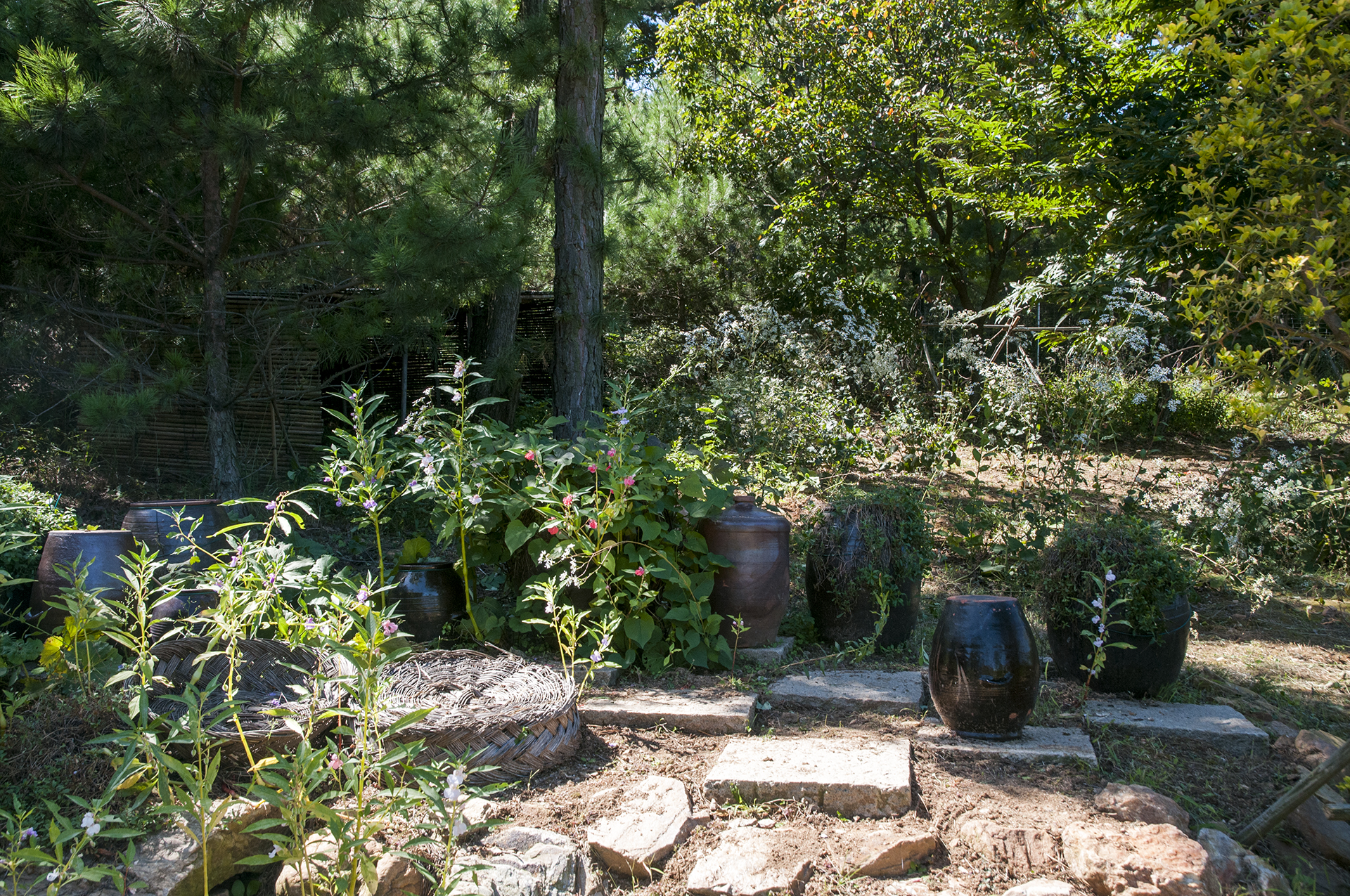 돌담을 두른 섬집 뒷편에는 다양한 화초와 장독대가 있고, 소나무 아래 닭장도 보인다.