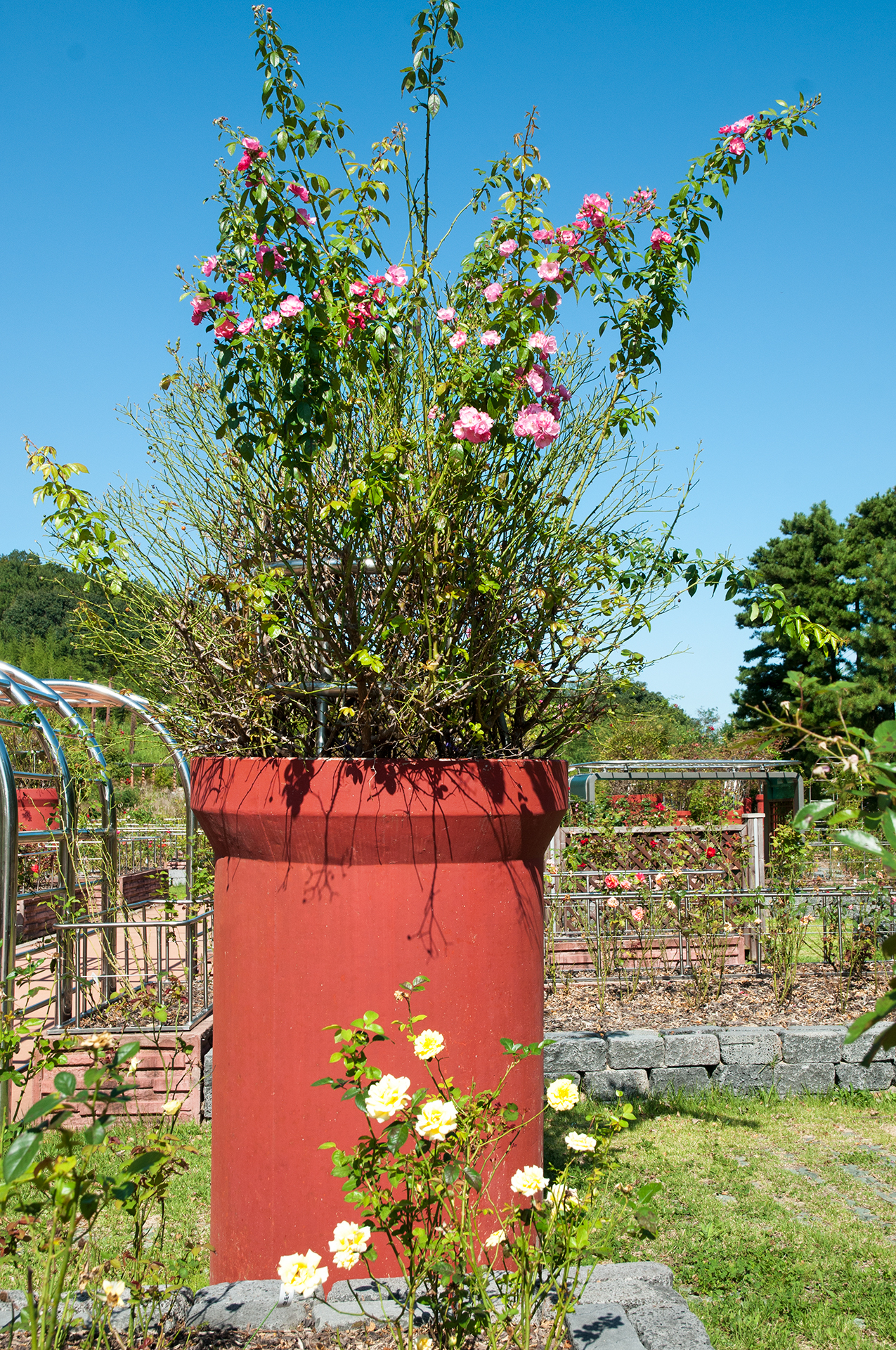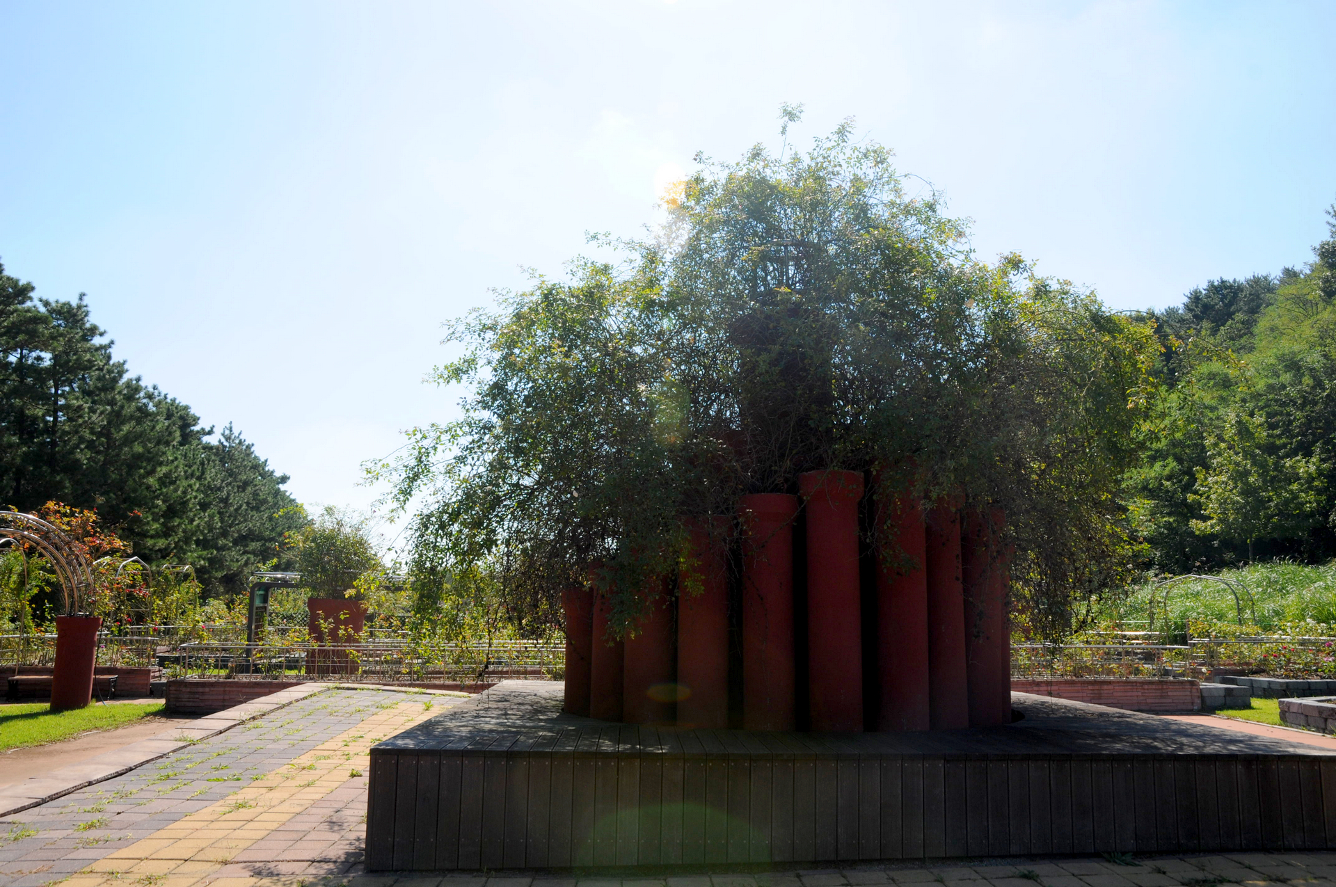 굴뚝같은 콘크리트 흄관에 장미가 심겨져 있는데 이는 수목원을 만들면서 나온 건축 잔여물을 활용하여 조성한 것이라고 한다.
