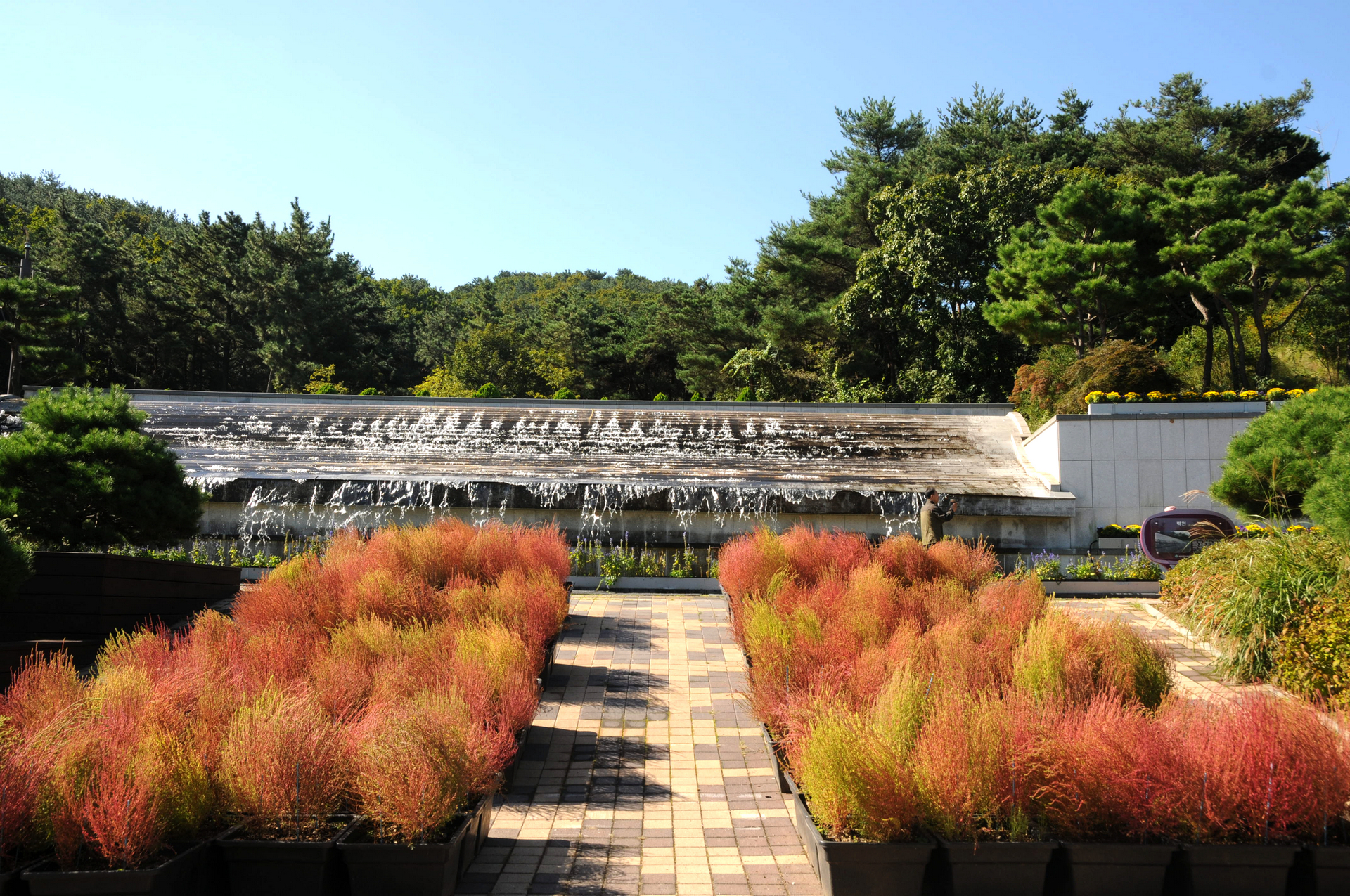 전방에는 물이 흘러내리는 벽천이 있고 그 앞으로 댑싸리가 물들어가고 있다.