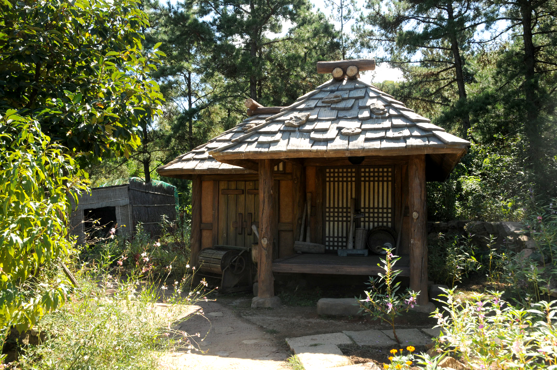 너와 지붕을 한 섬집 마루에서 잠시 한적한 휴식시간을 가져본다. 시골에서 흔히 볼수 있는 탈곡기와 홍두깨, 절구도 보인다.