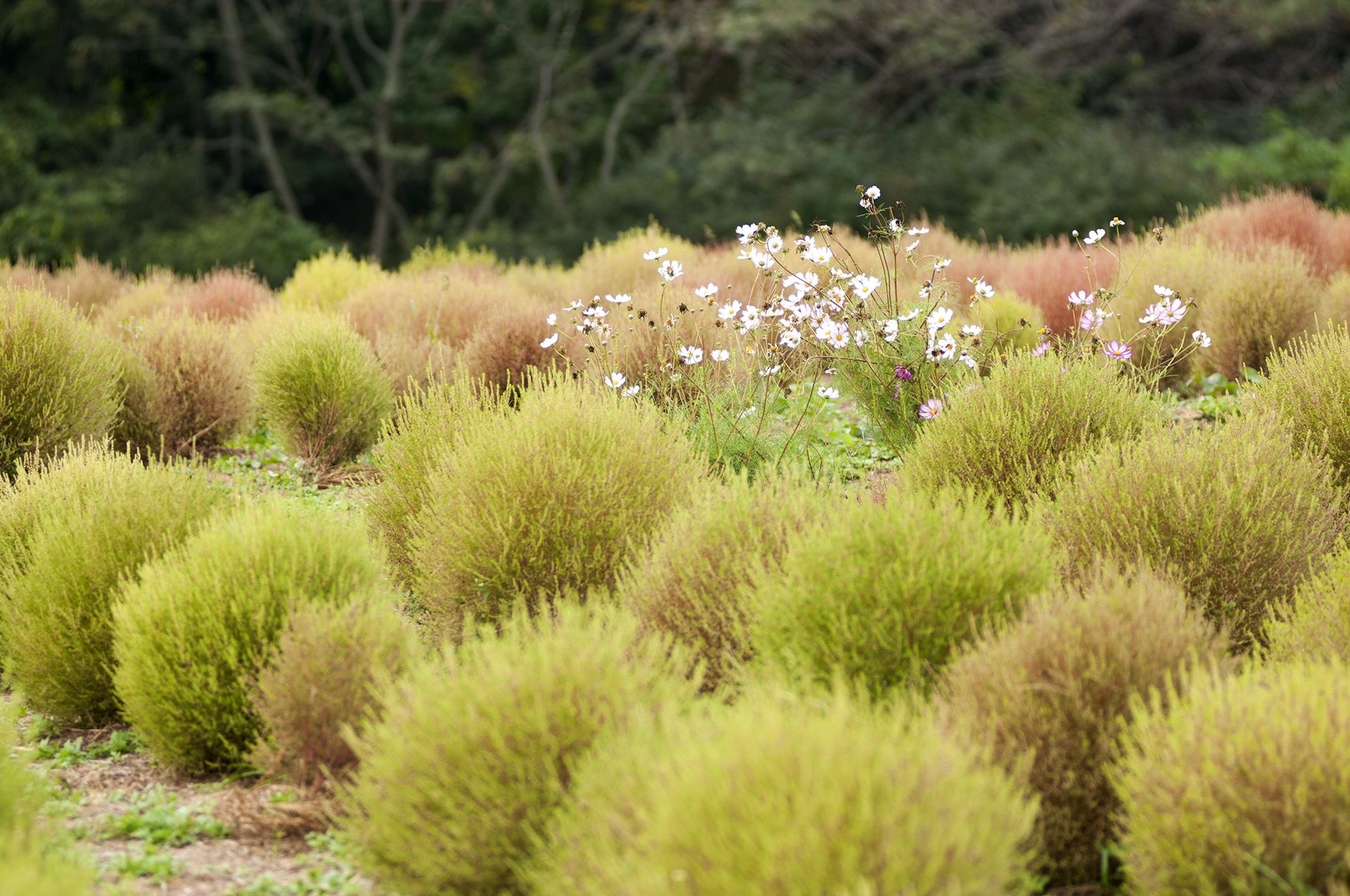 여리여리한 색의 코스모스가 댑싸리 사이에 피어 유독 튀어 보인다.