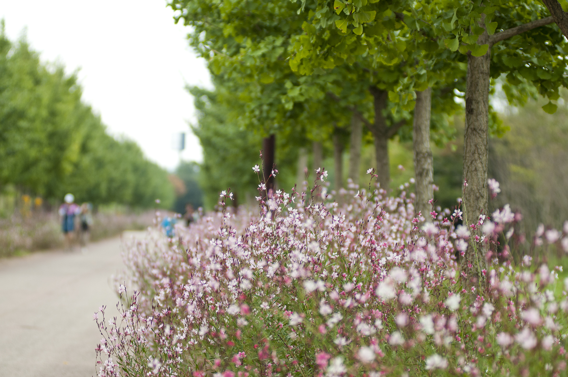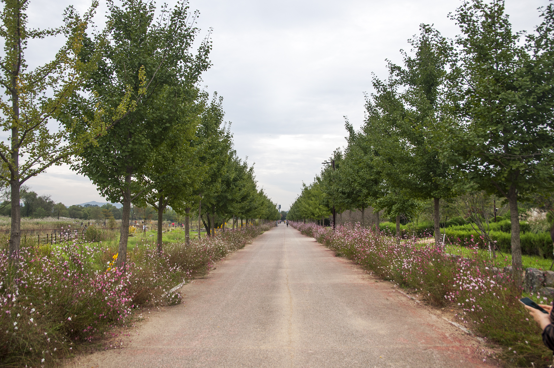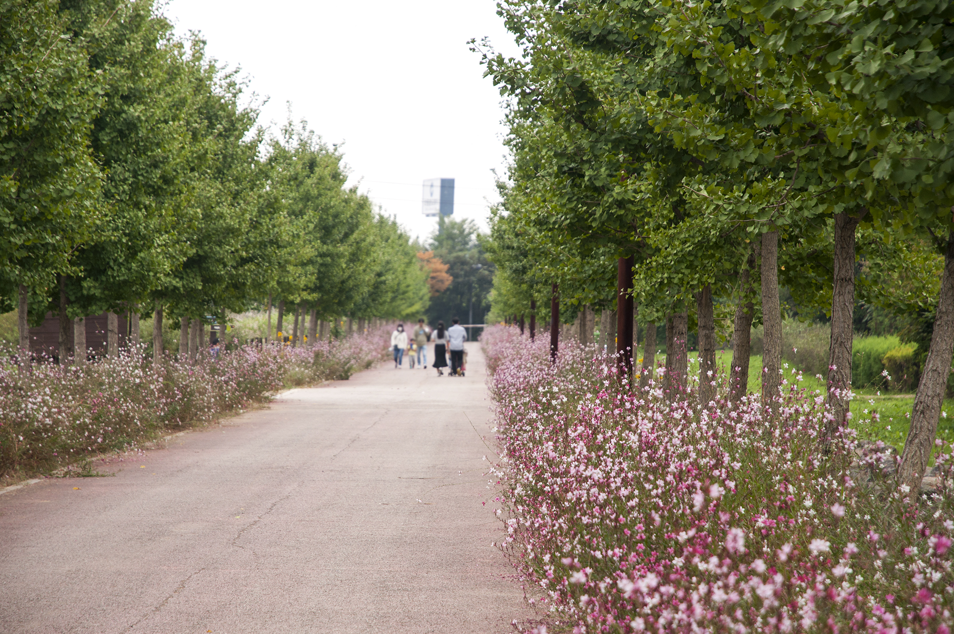 백일홍 꽃밭 옆에는 은행나무길 아래 가우라가 활짝 피었다. 작년에 공사중인 곳을 크게 돌아서 진입하던 길이다.
