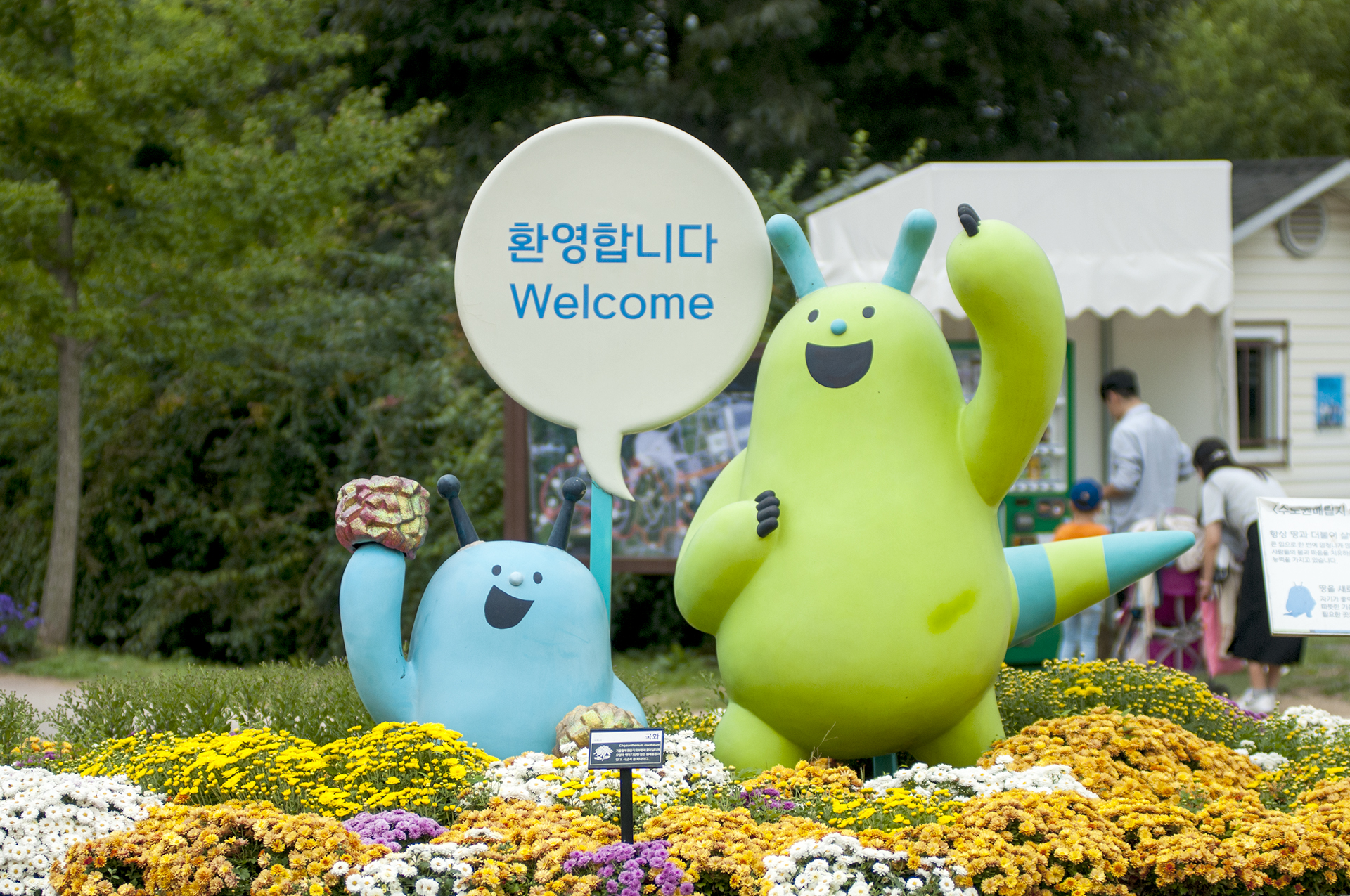 애기해바라기 옆에는 국화작품 전시회가 열리고 있다.