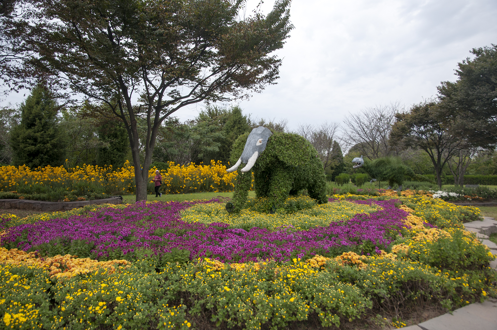국화밭에 산책나온 코끼리와 뒷쪽에 공룡 한마리도 가을에 흠씬 놀라는 표정이다.