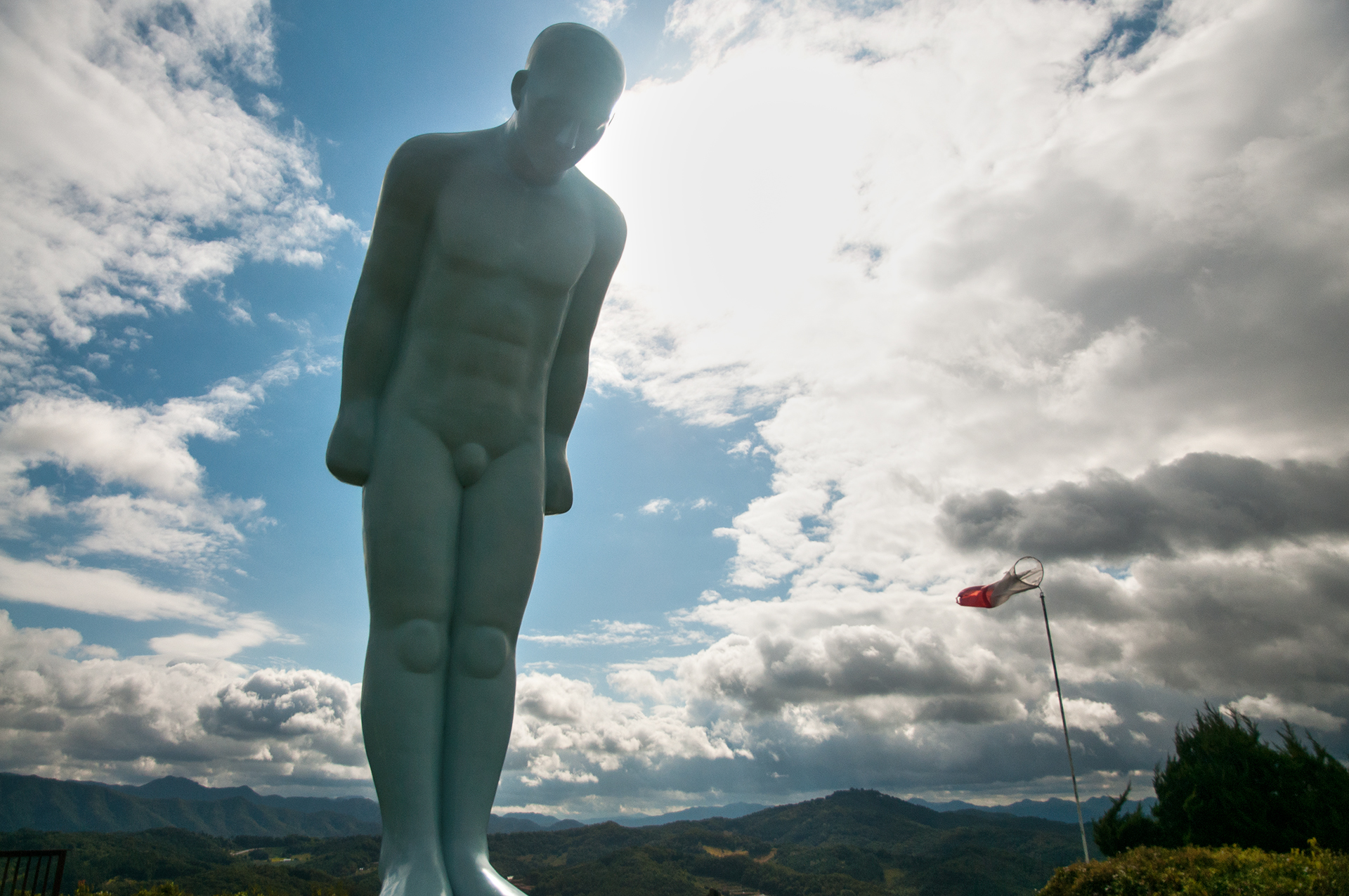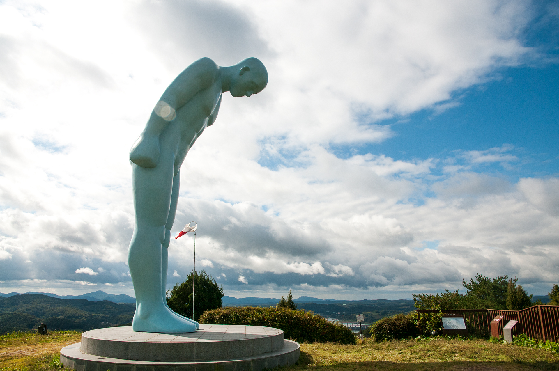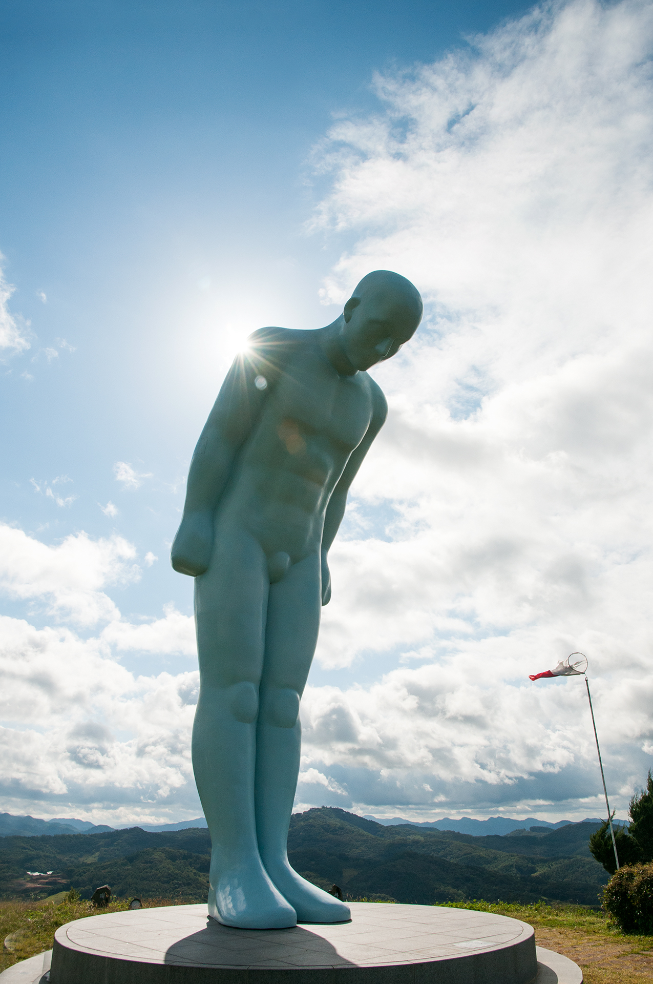 그리팅맨은 유영호 작가가 만든 조각상으로, 15도 각도로 고개와 허리를 숙여 인사하는 모습을 하고 있다.