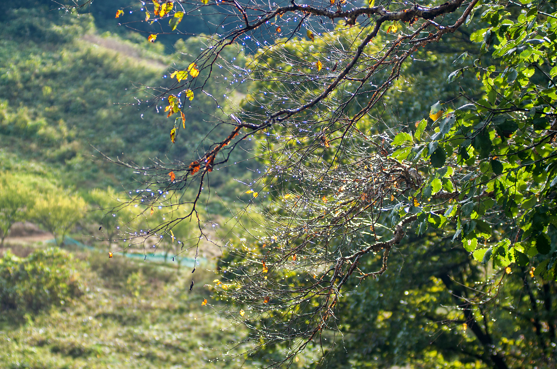 잎을 모두 떨군 나뭇가지에는 빗물이 방울방울 맺혀 햇살에 영롱하게 빛이 난다.