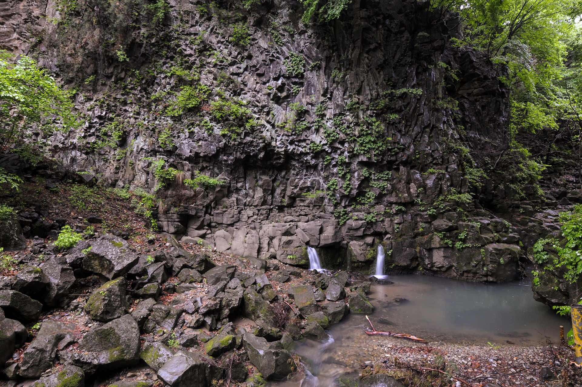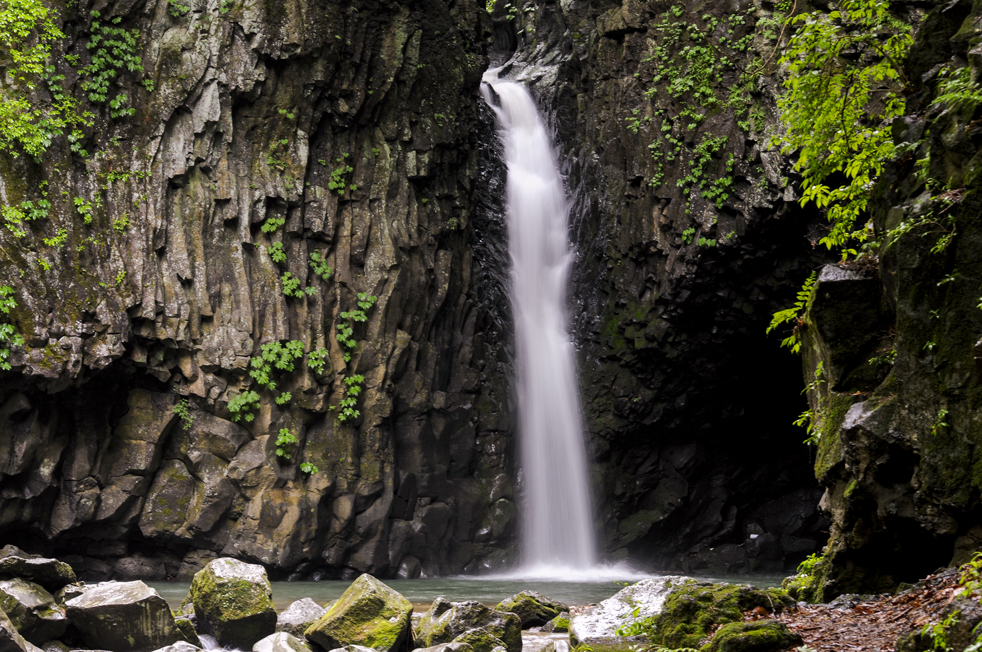 폭포를 중심으로 양쪽 날개를 펼친듯 현무암 주상절리가 절경을 이루고 있다.