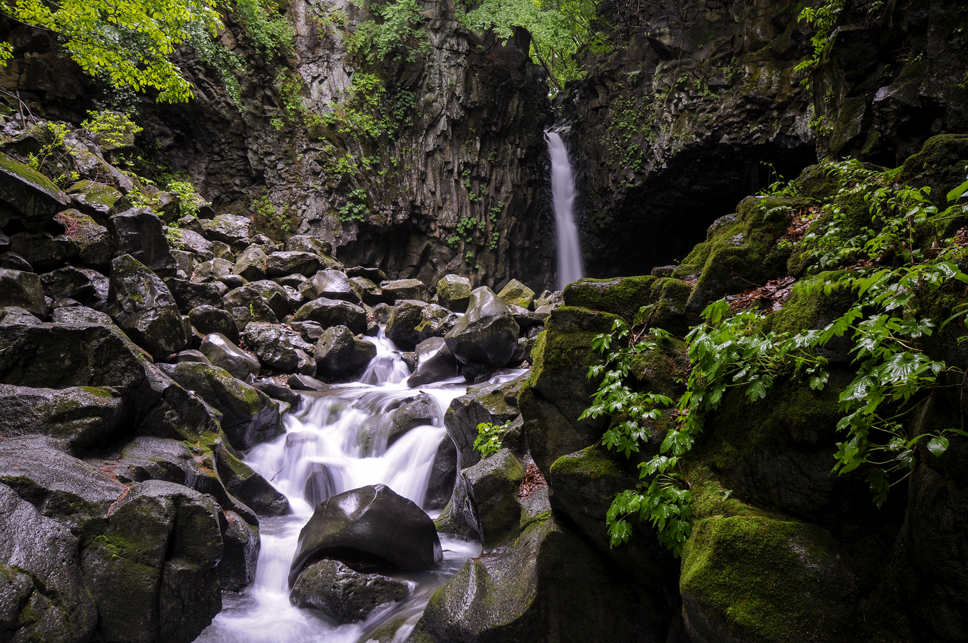 조각난 현무암을 이어 붙여 놓은 듯한 상부에서 물줄기가 계속 쏟아지며 동굴 내부에 울려 퍼진다.
