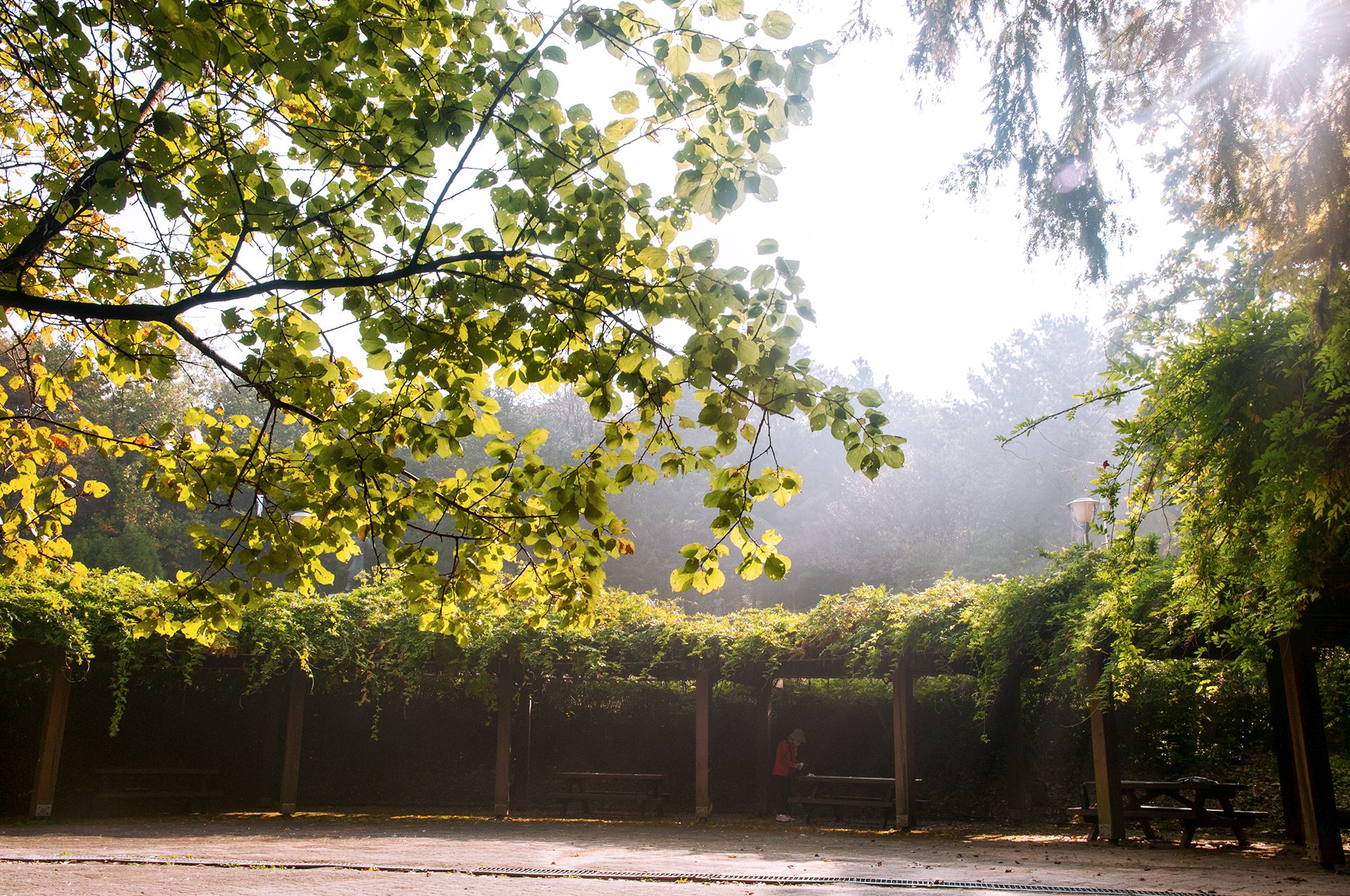 쉼터에도 햇살이 쏟아지지만 안개가 쉽사리 걷히지를 않는다.
