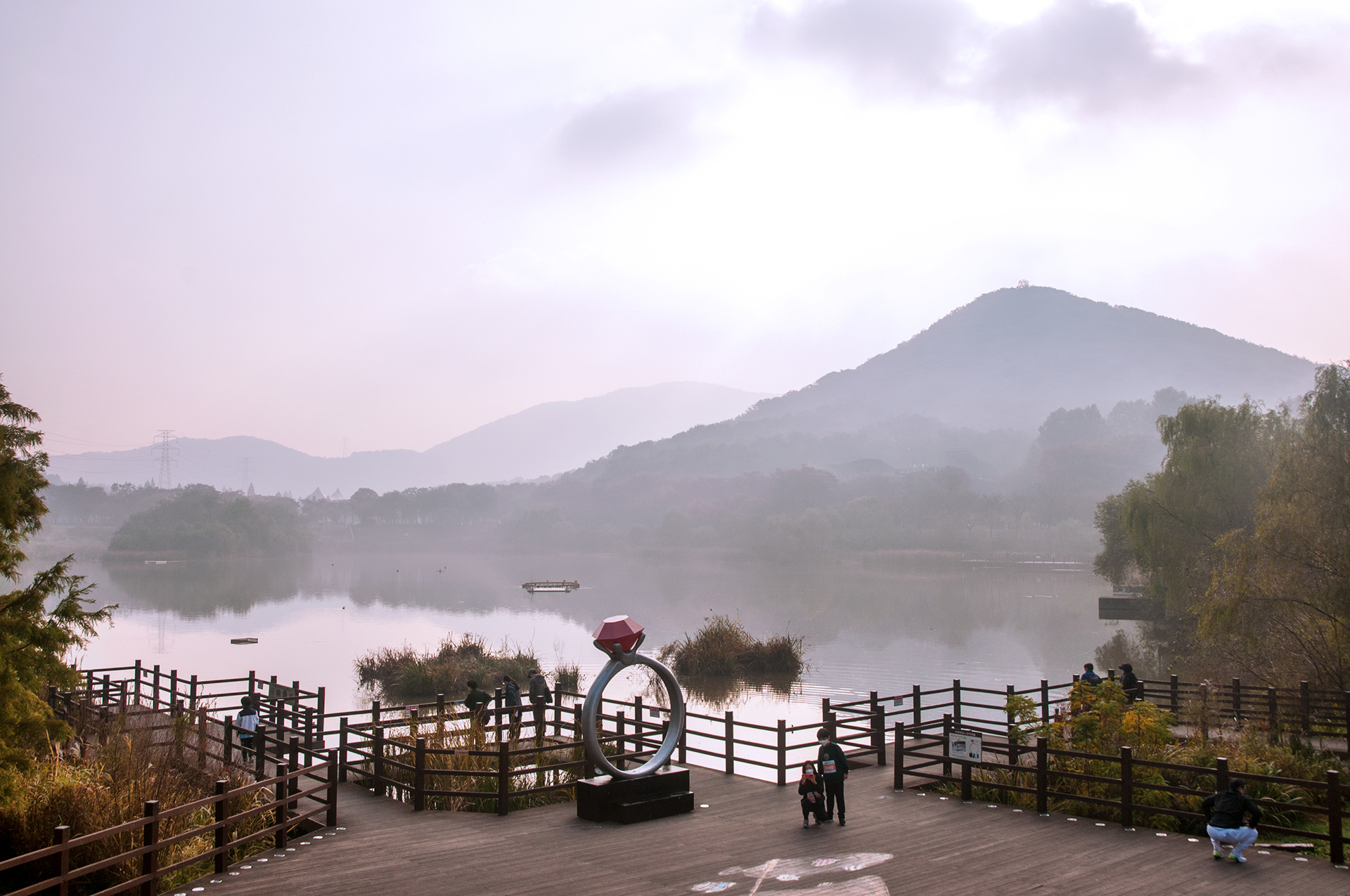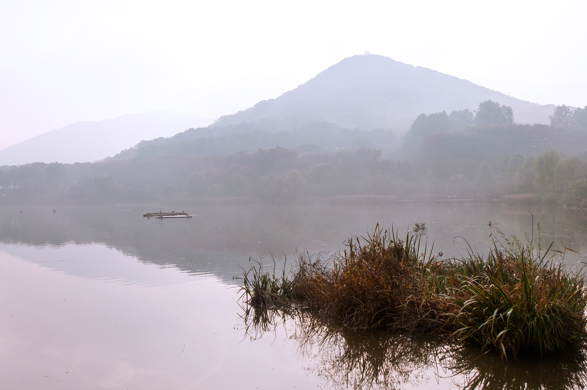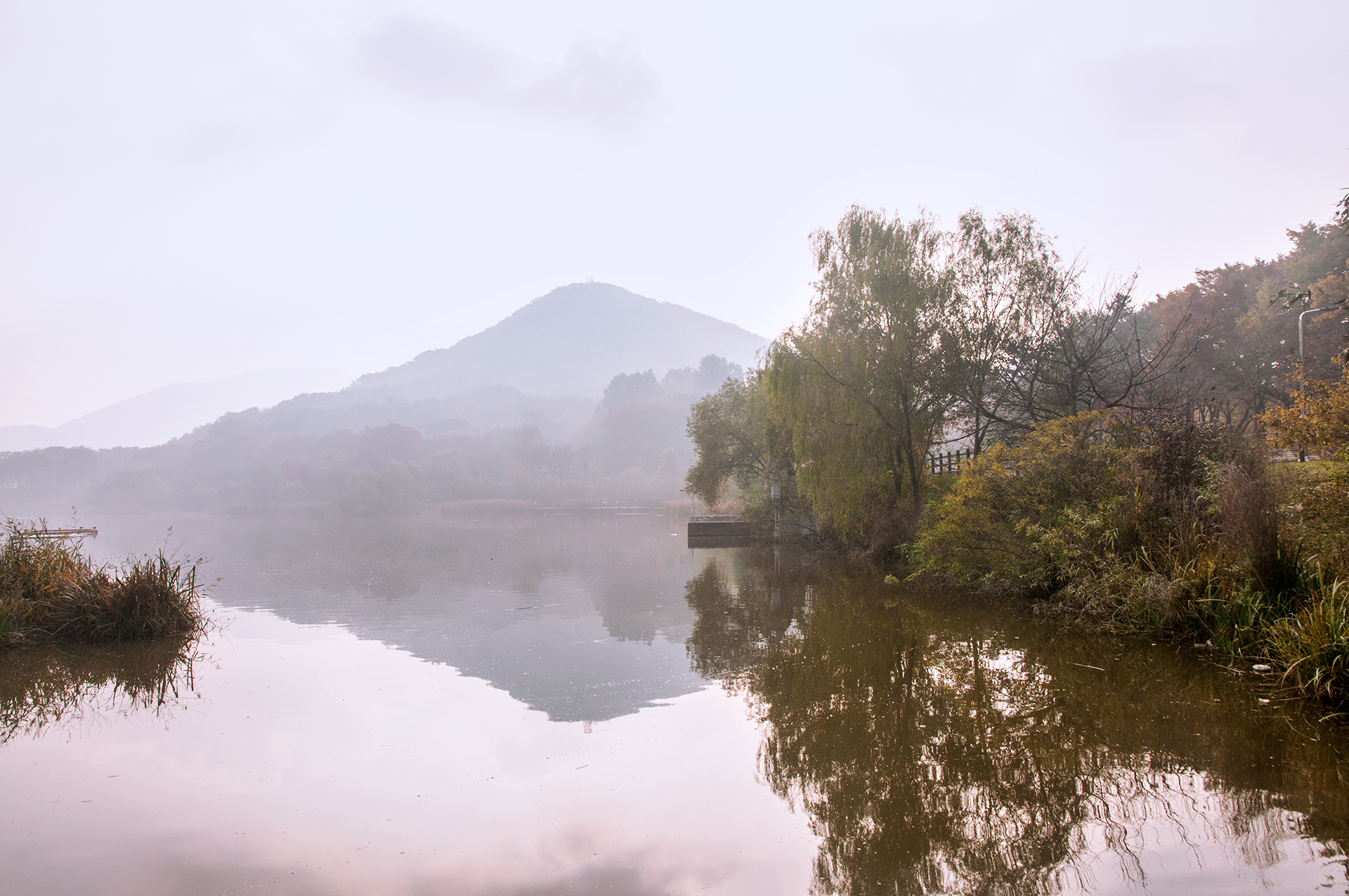 호수는 잔잔하기만 하고, 단풍으로 울긋불긋 해야할 관모산과 상아산의 풍경이 희미하게 보인다.